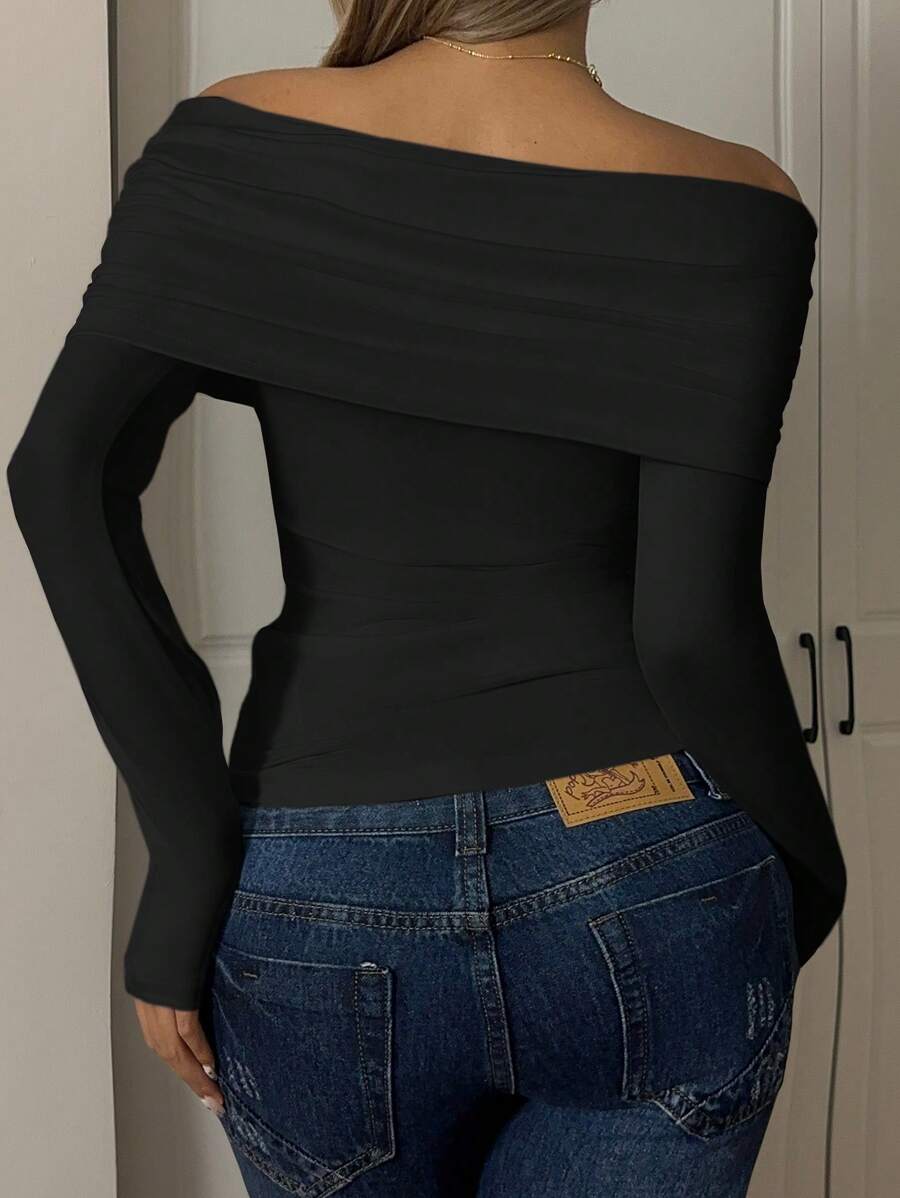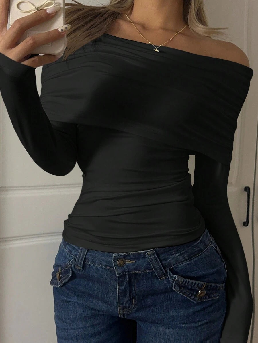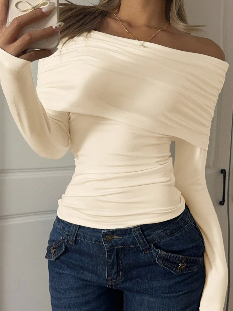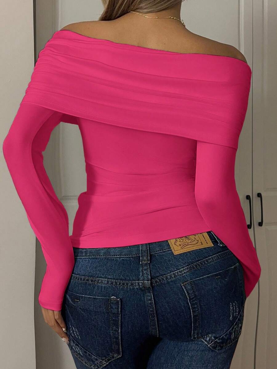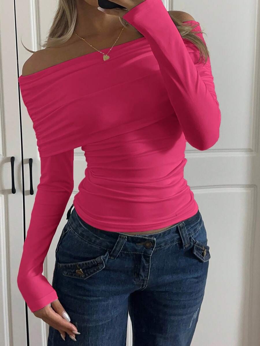 MIU EZwear Brown Casual Knit Off Shoulder Ruched Fitted T-Shirt,Rave Top