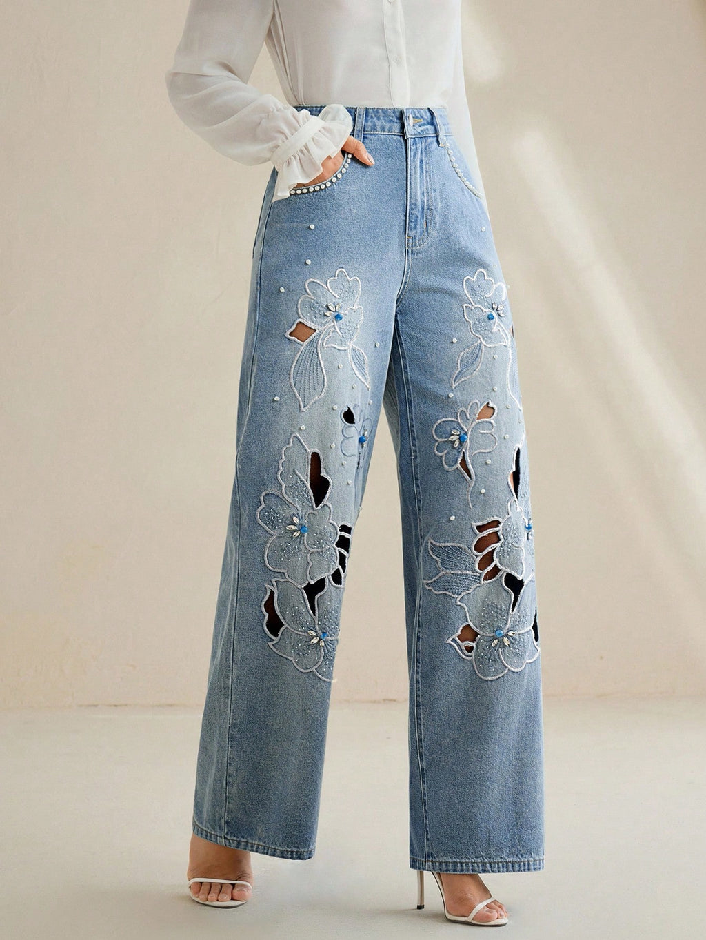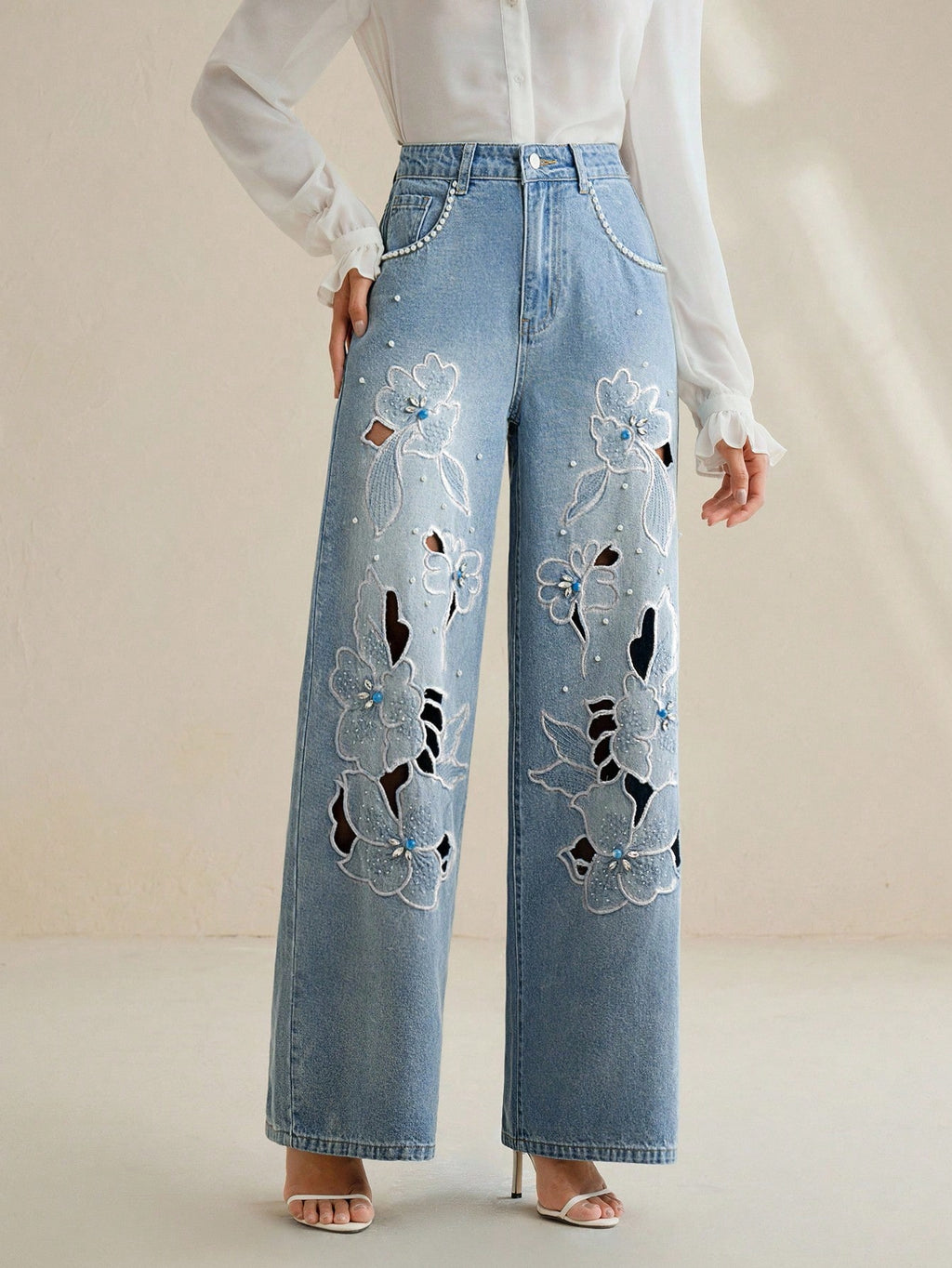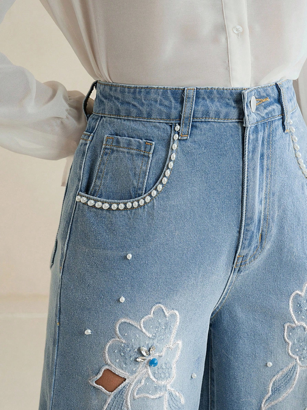MIU Fashionable Casual Hollow-Out Embroidery Blue Denim Women Trousers