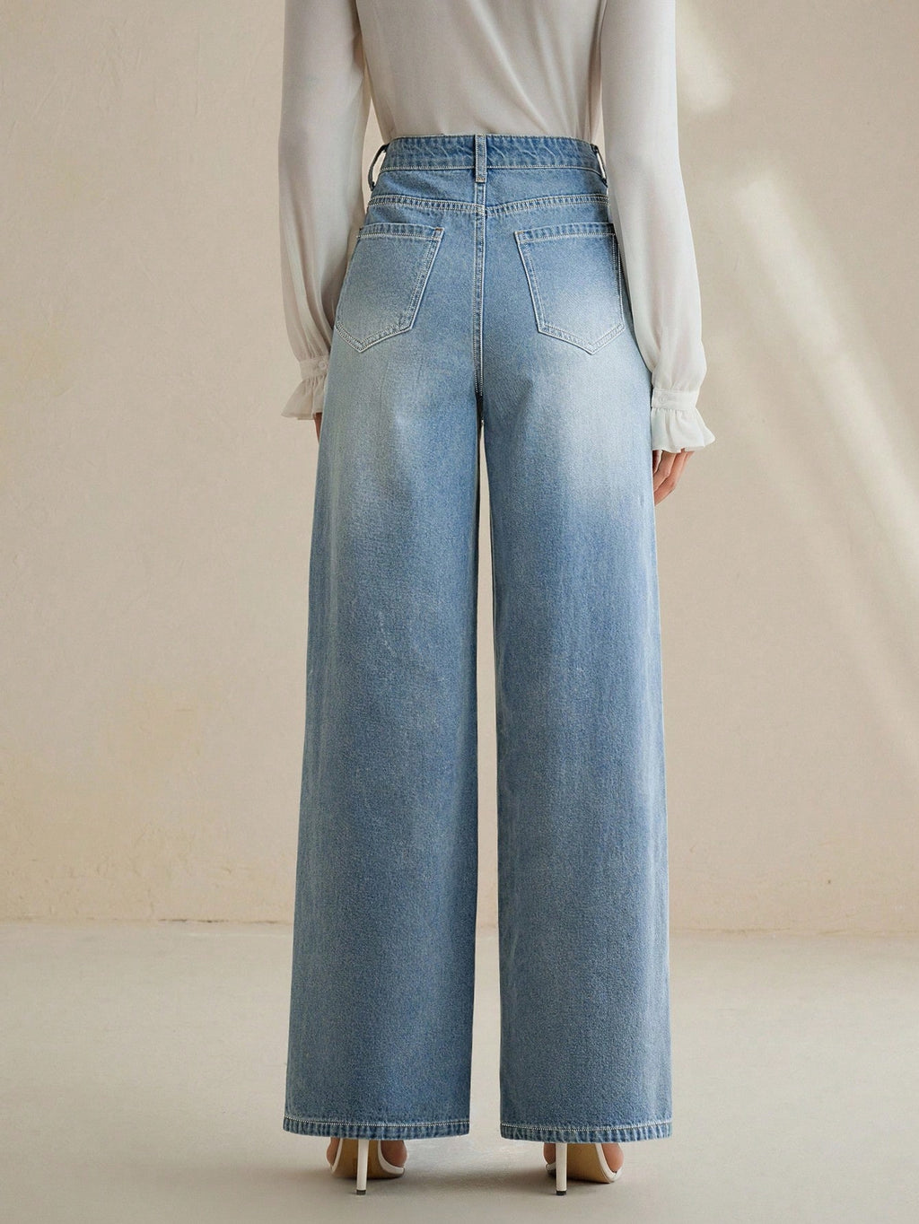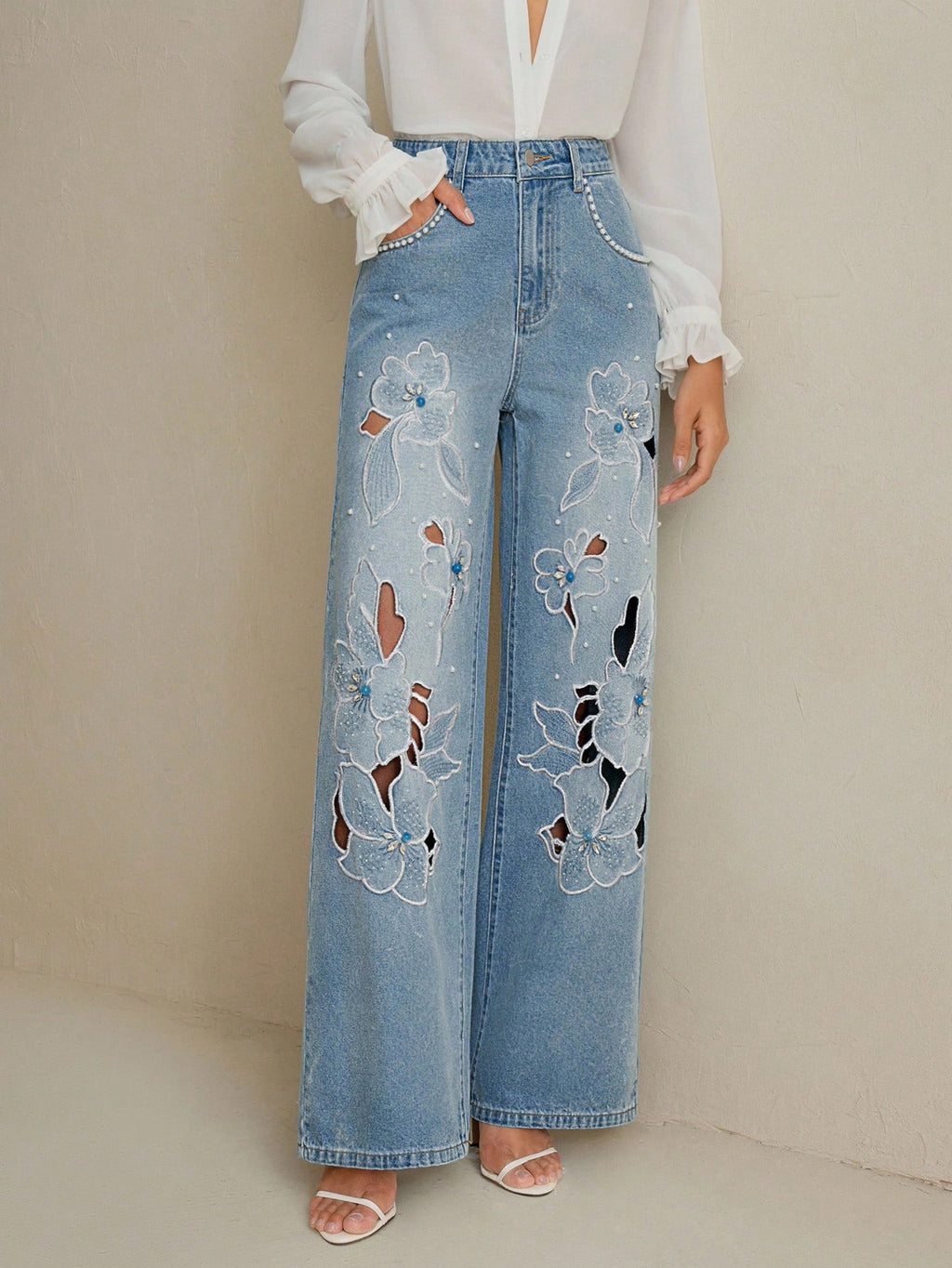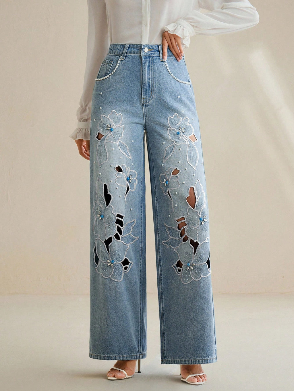 MIU Fashionable Casual Hollow-Out Embroidery Blue Denim Women Trousers