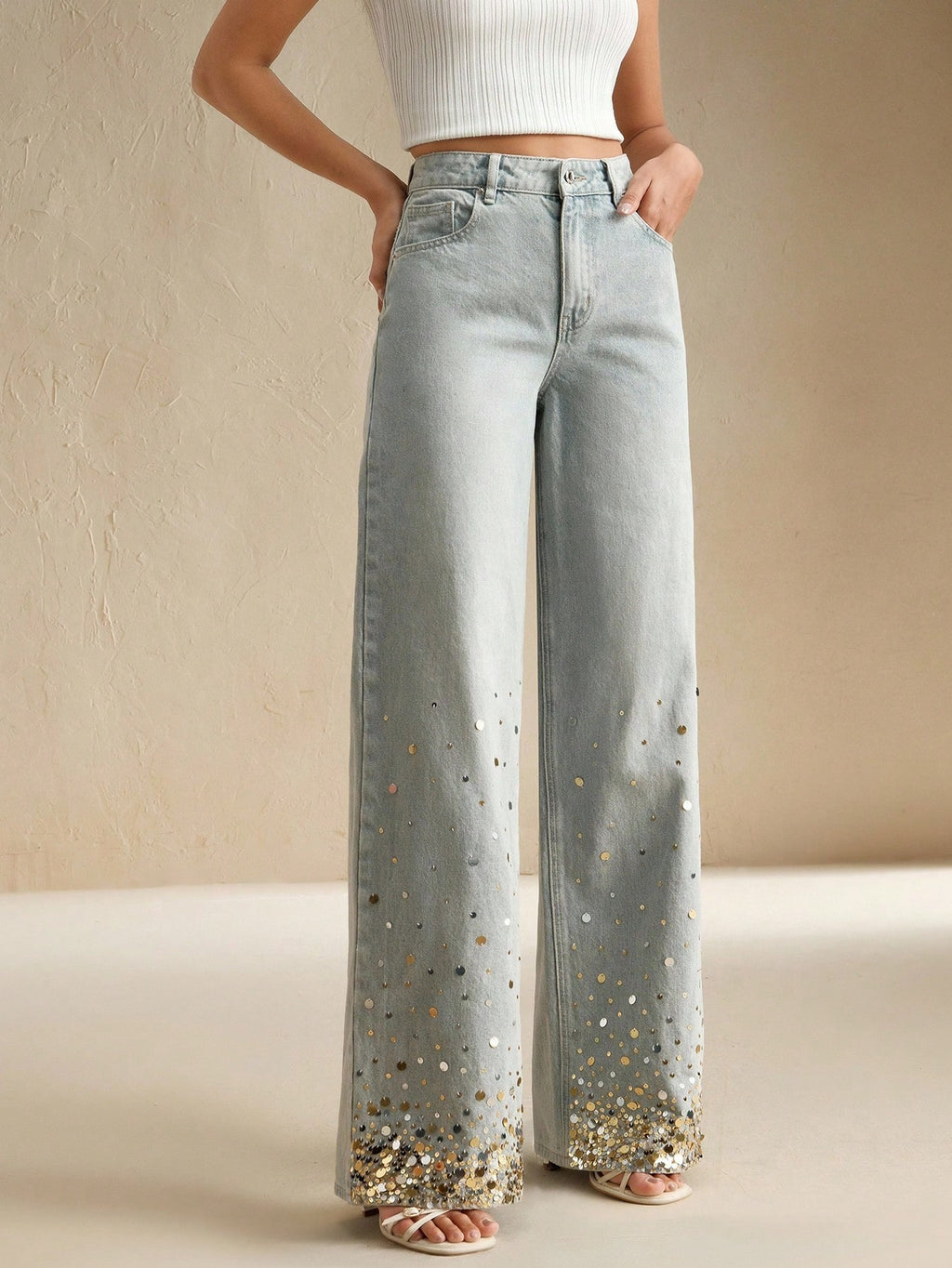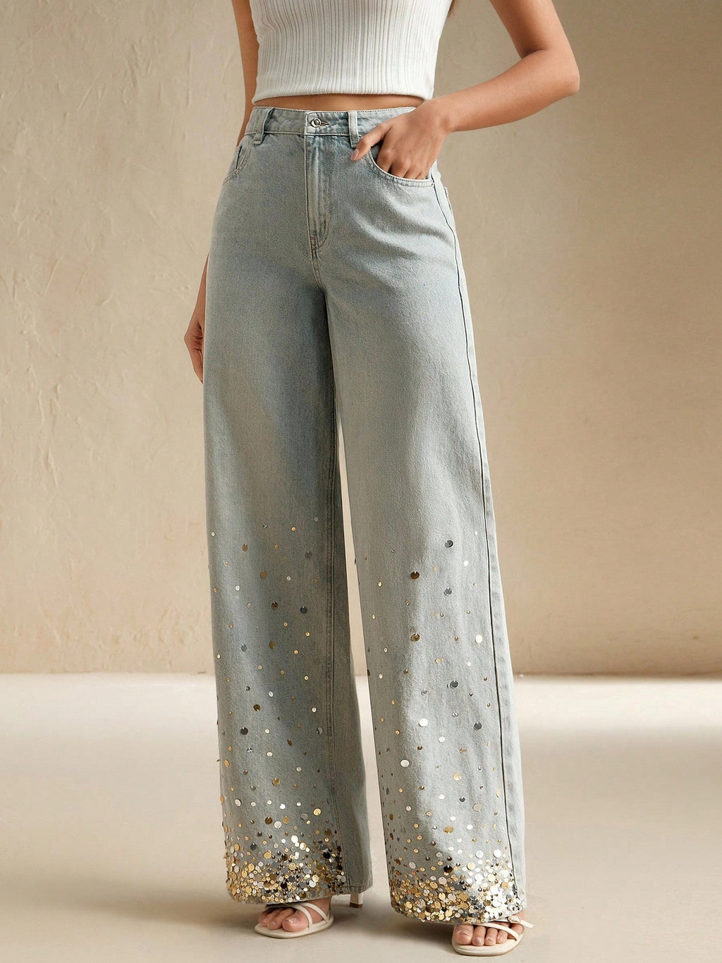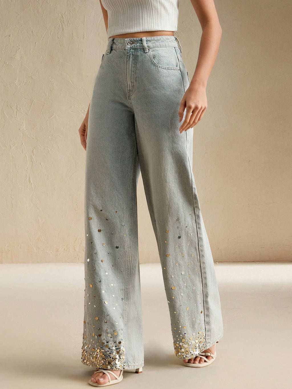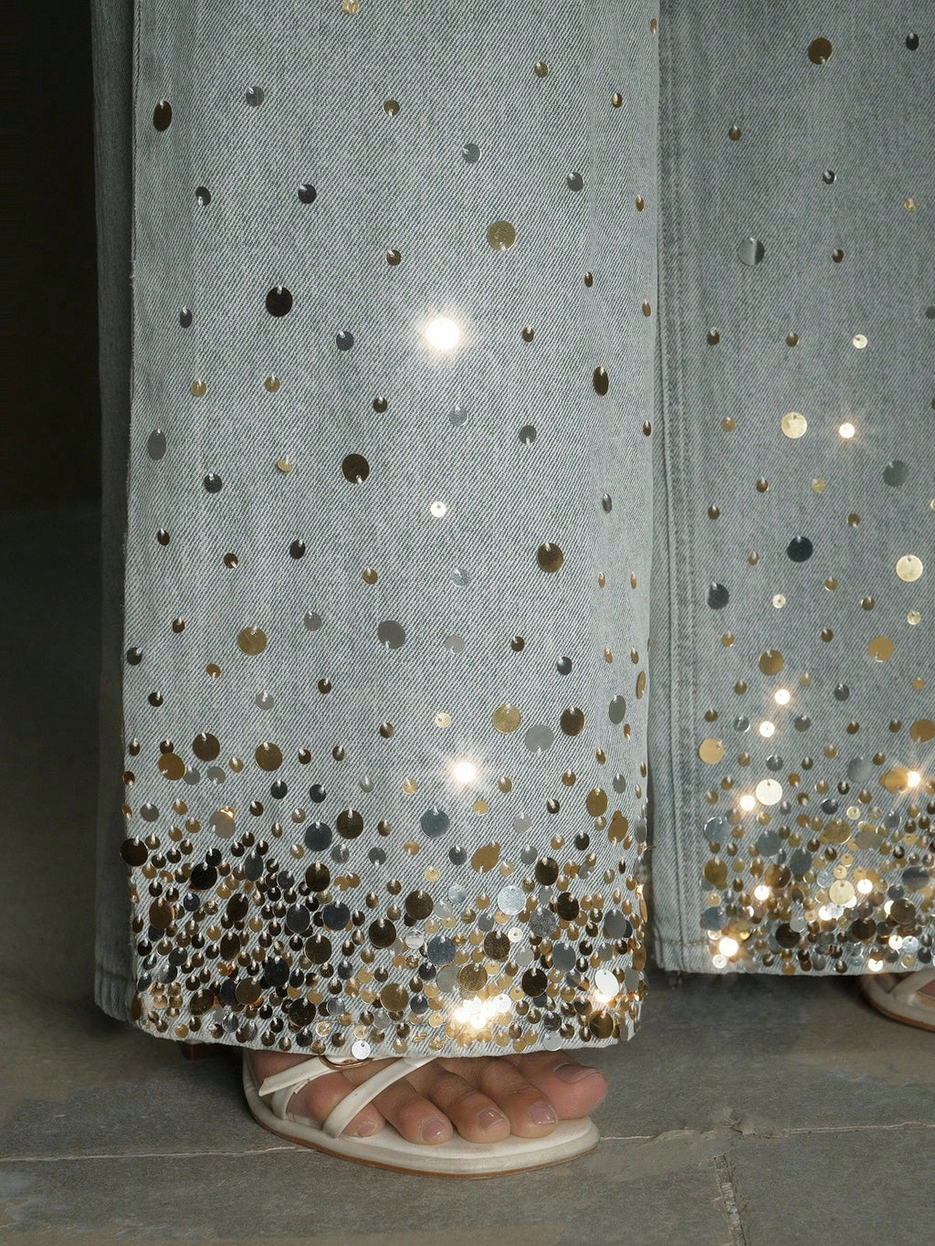 MIU Fashionable Sequin Embellished Casual Loose Fit Women's Jeans