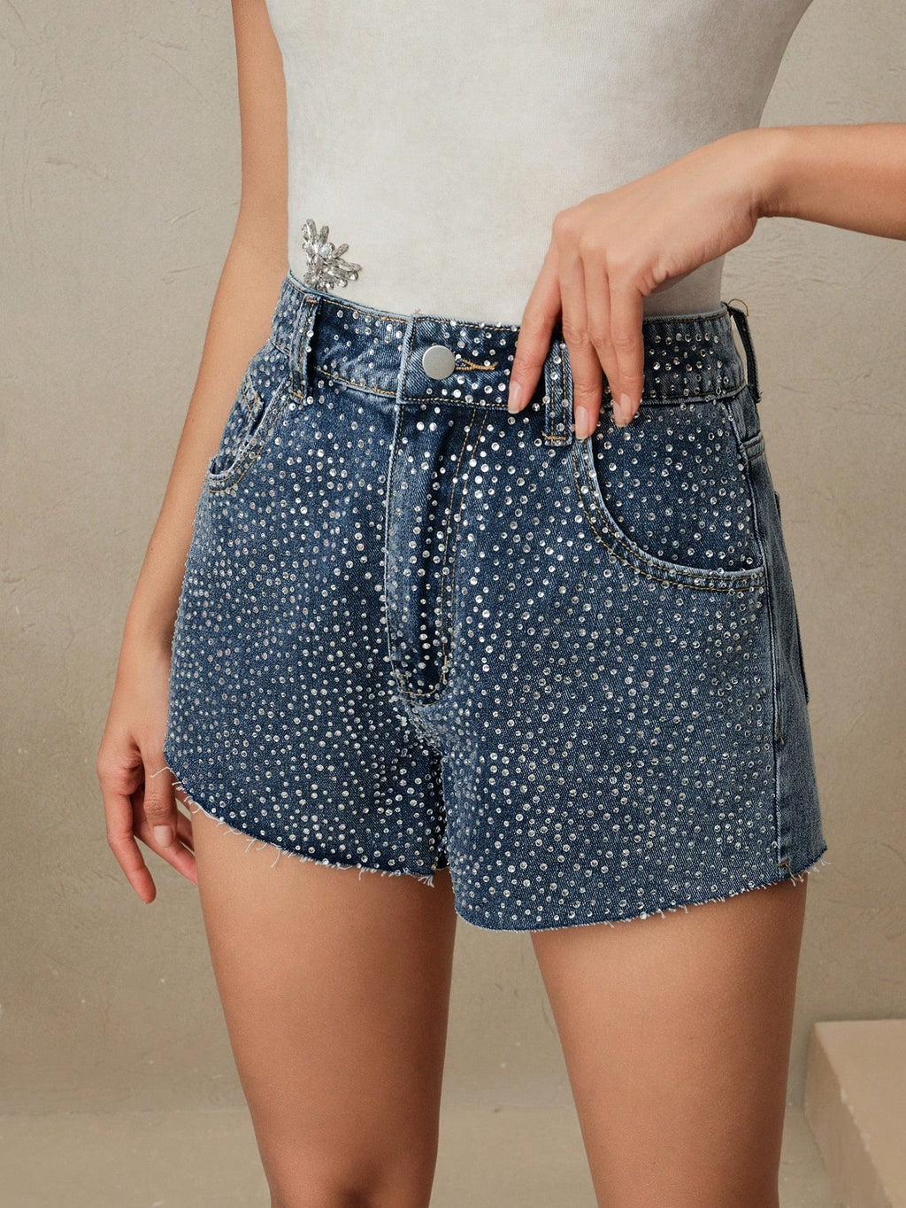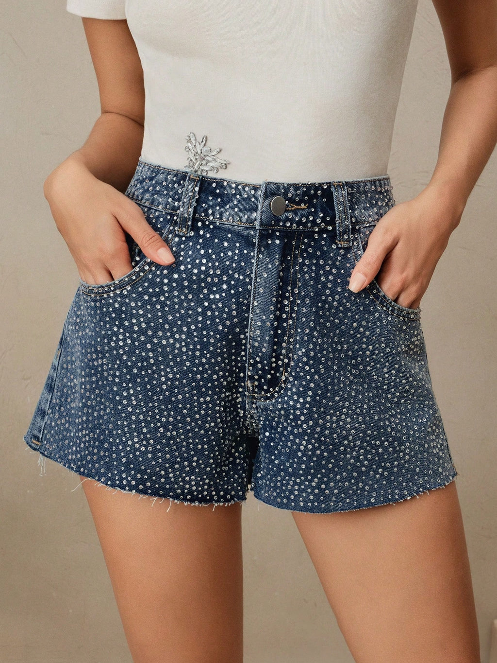 MIU Fashionable Sparkle Embellished Denim High-Waisted Shorts