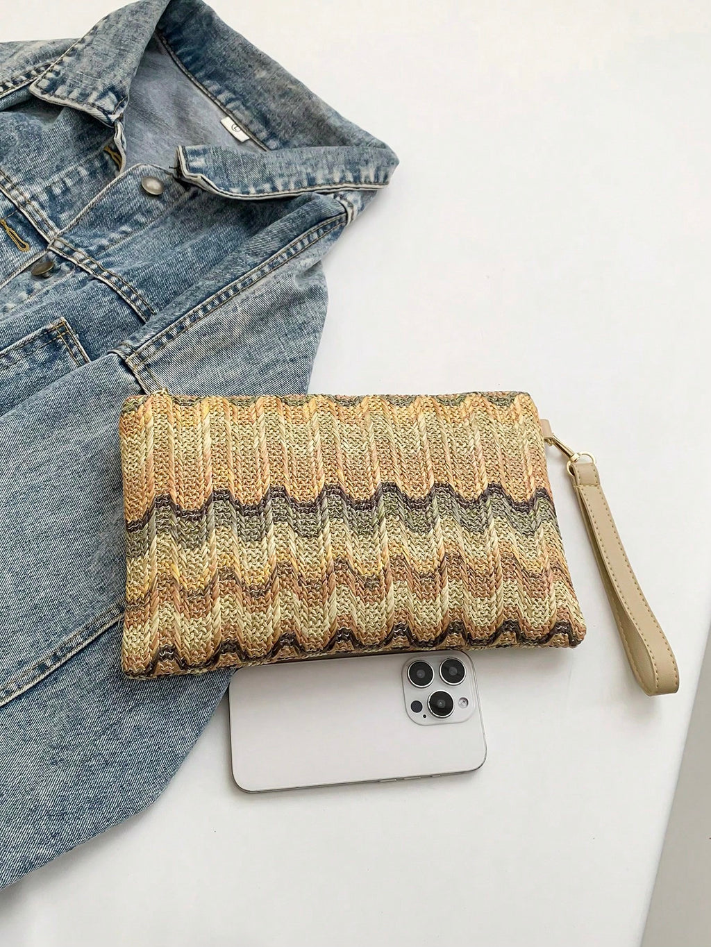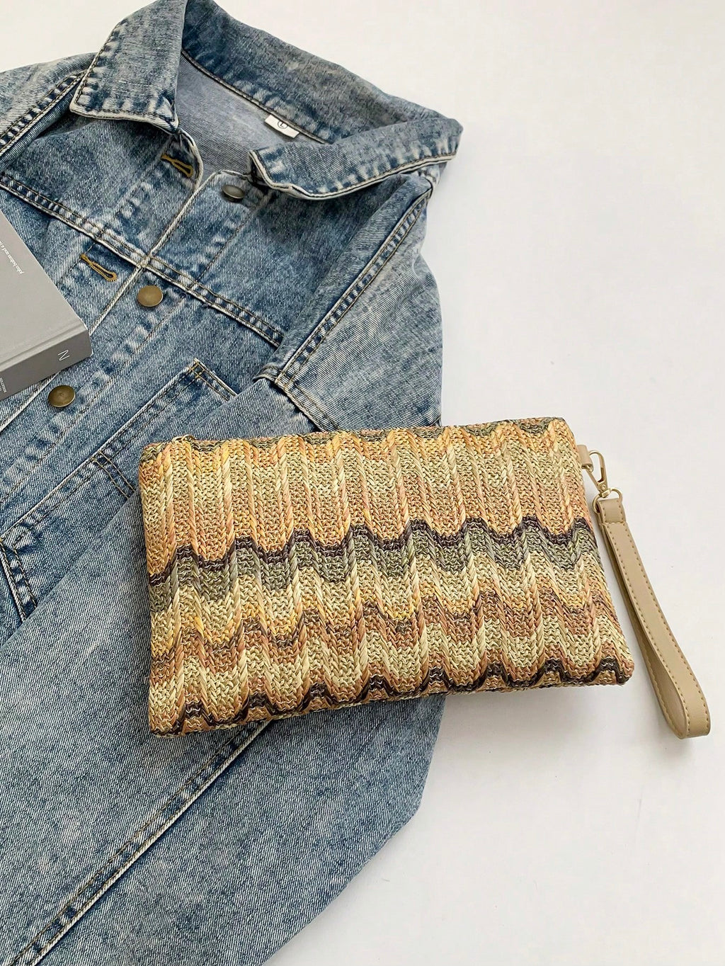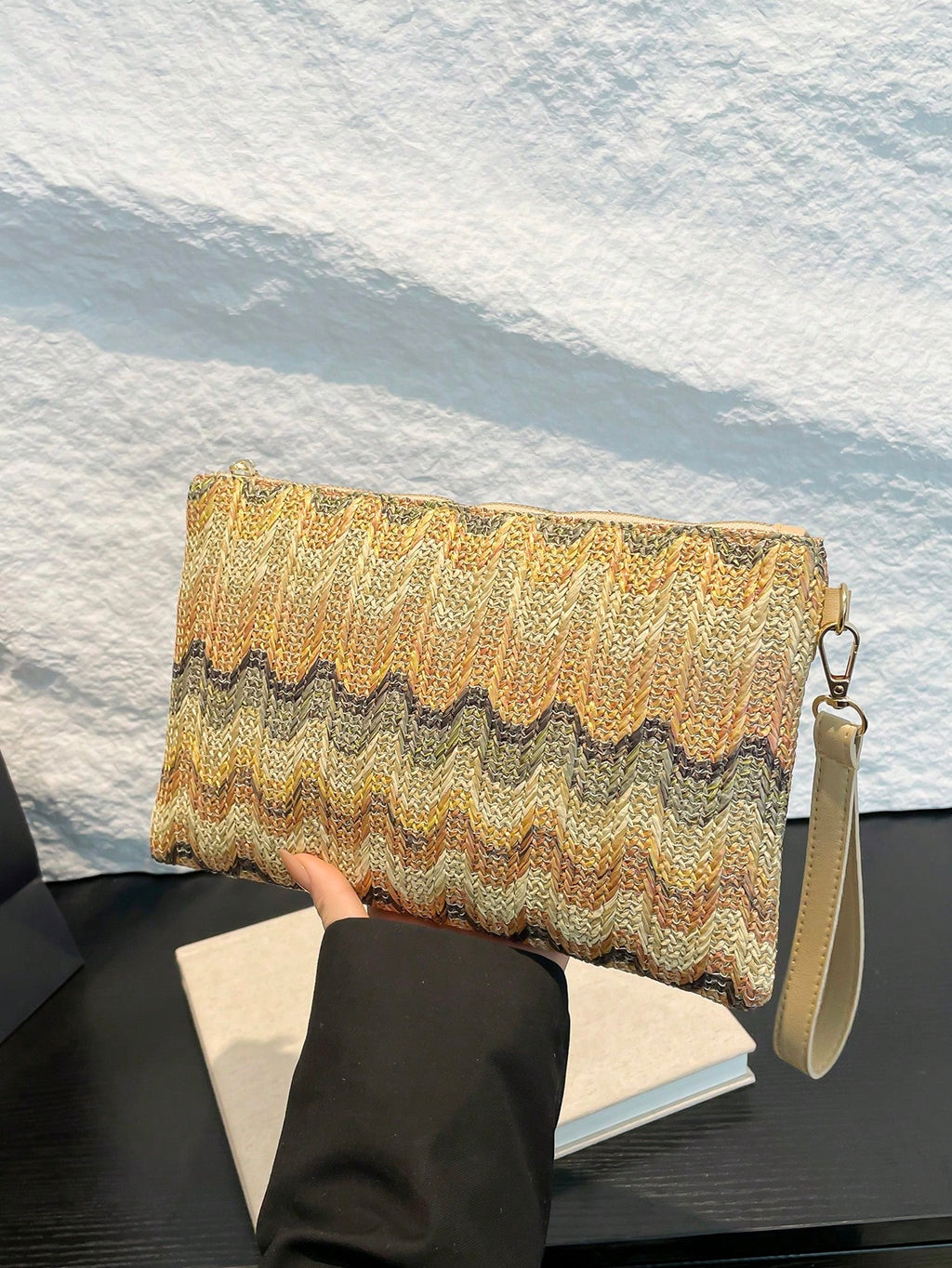 MIU Fashionable Spring/Summer New Multi-Purpose Woven Envelope Bag, Casual Color Block Wave Pattern Handbag