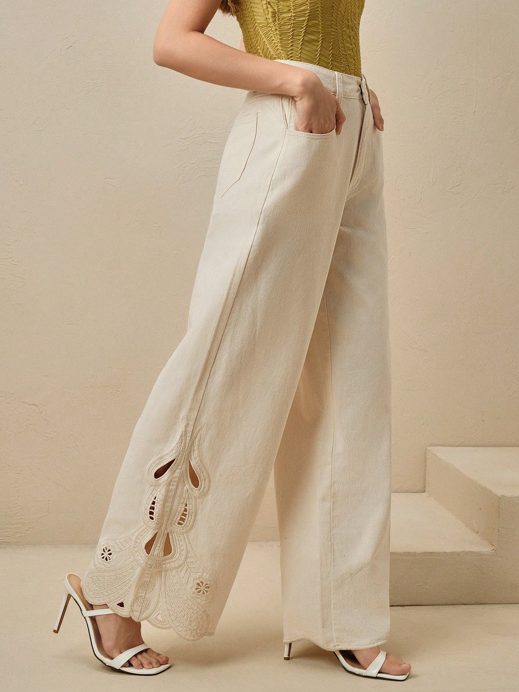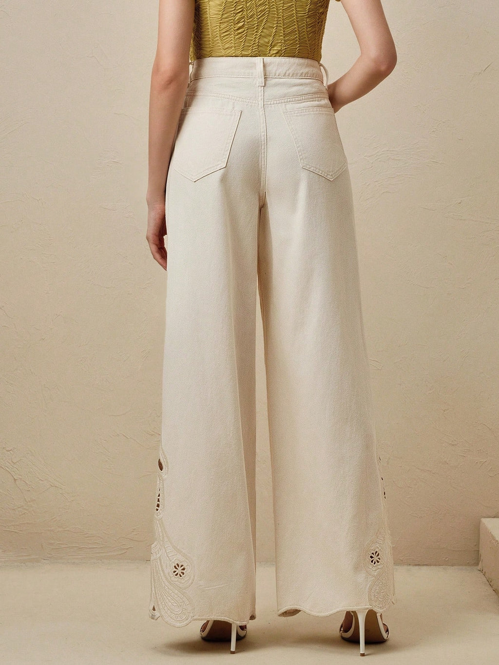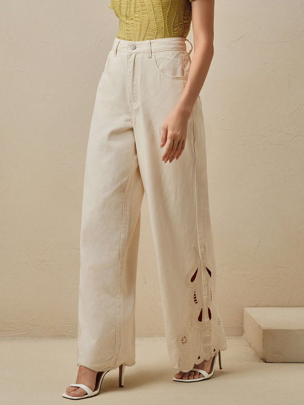 MIU Fashionable Women's Embroidery Beige Straight Leg Wide Leg Jeans
