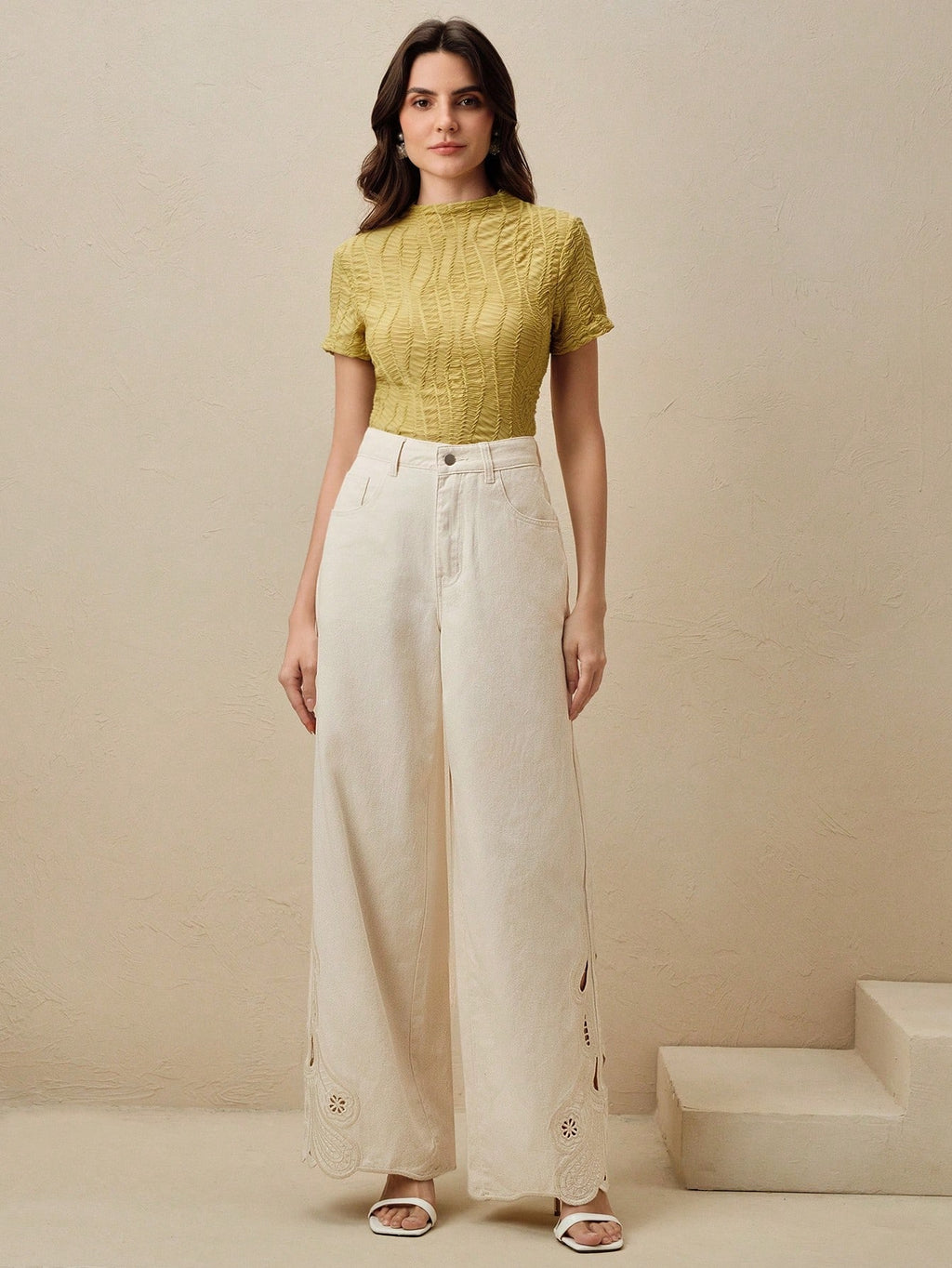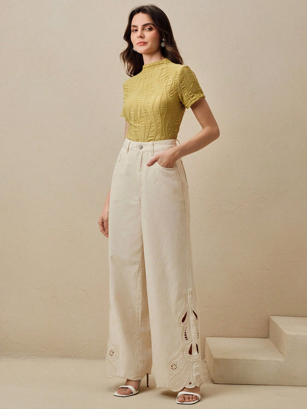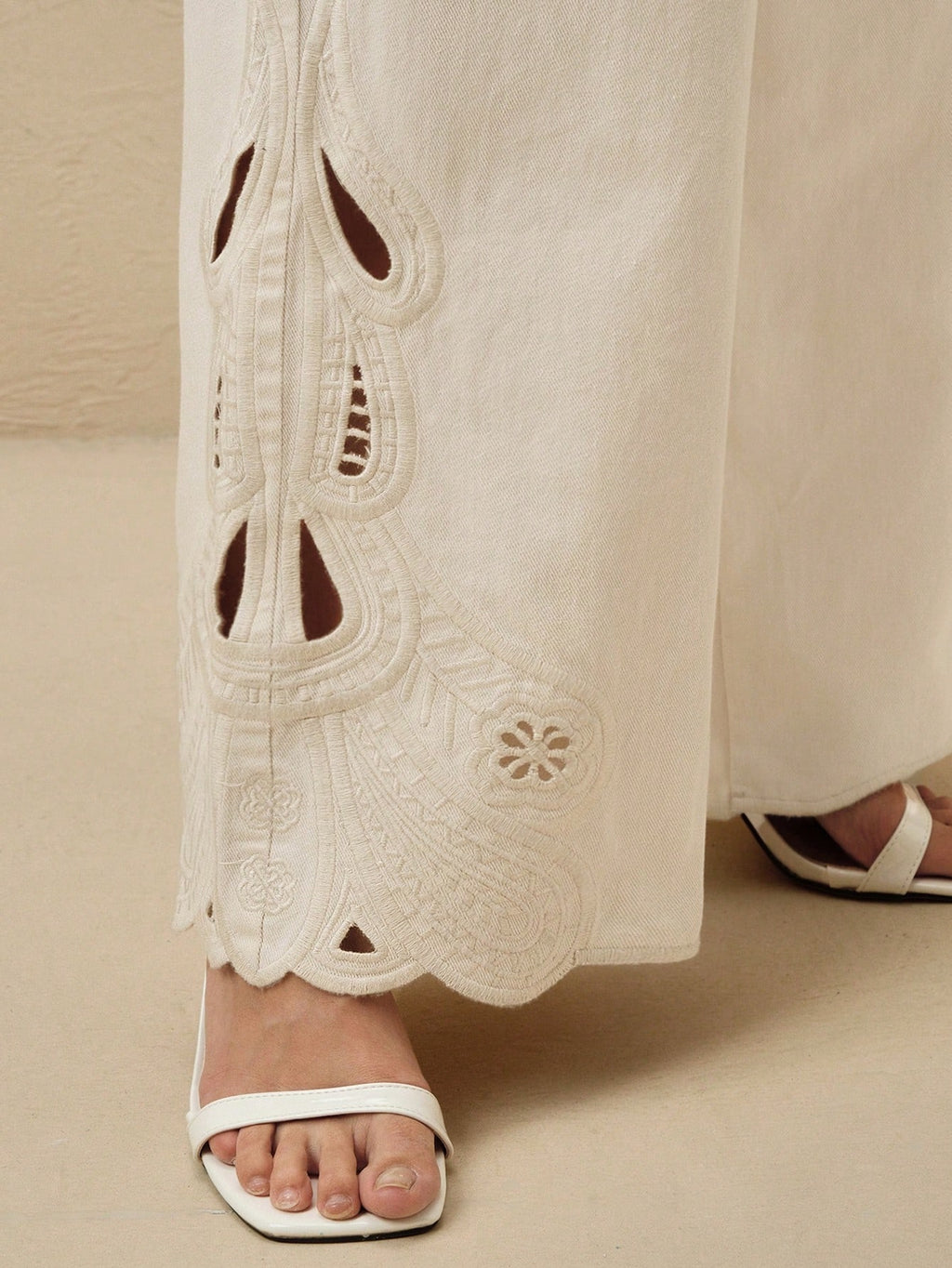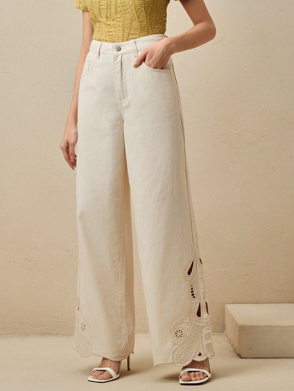 MIU Fashionable Women's Embroidery Beige Straight Leg Wide Leg Jeans