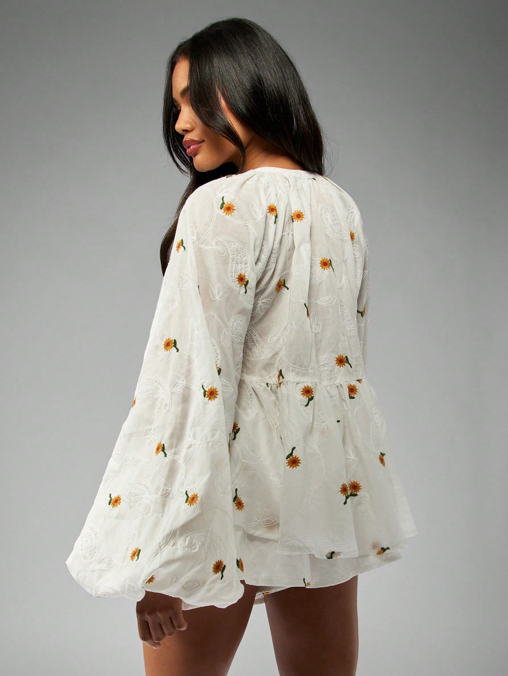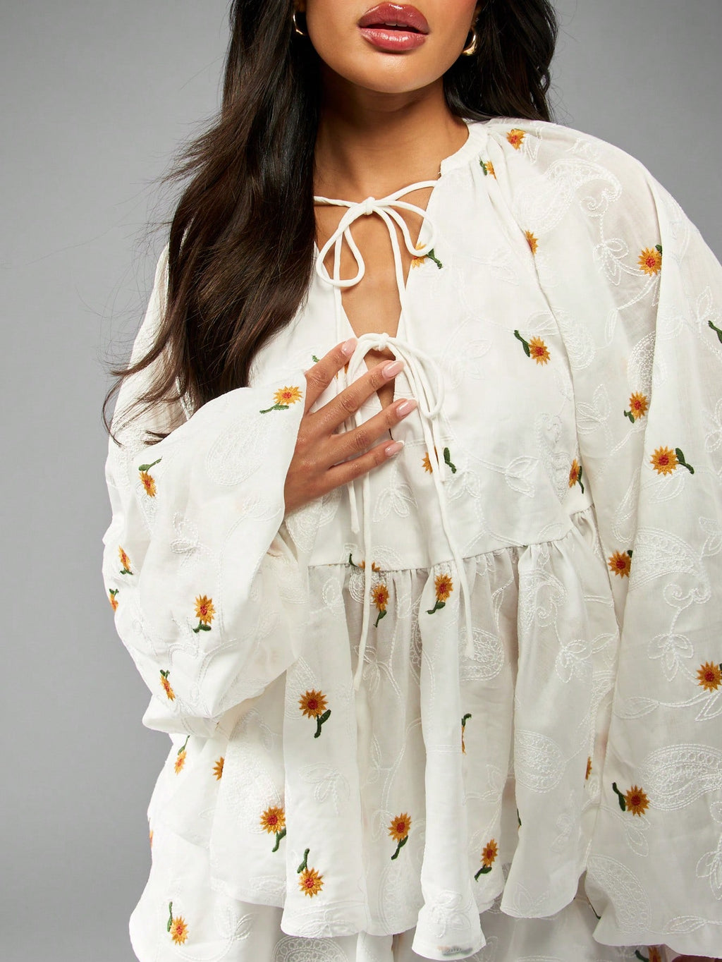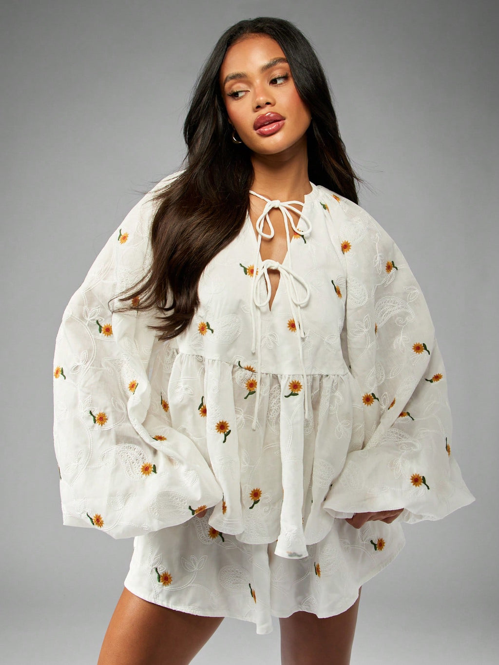 MIU Floral Embroidered Puff Sleeve Festival Summer Boho Co-Ord Set With Ruffle Hem Detail Tie Front Beach Holiday Resort Wear