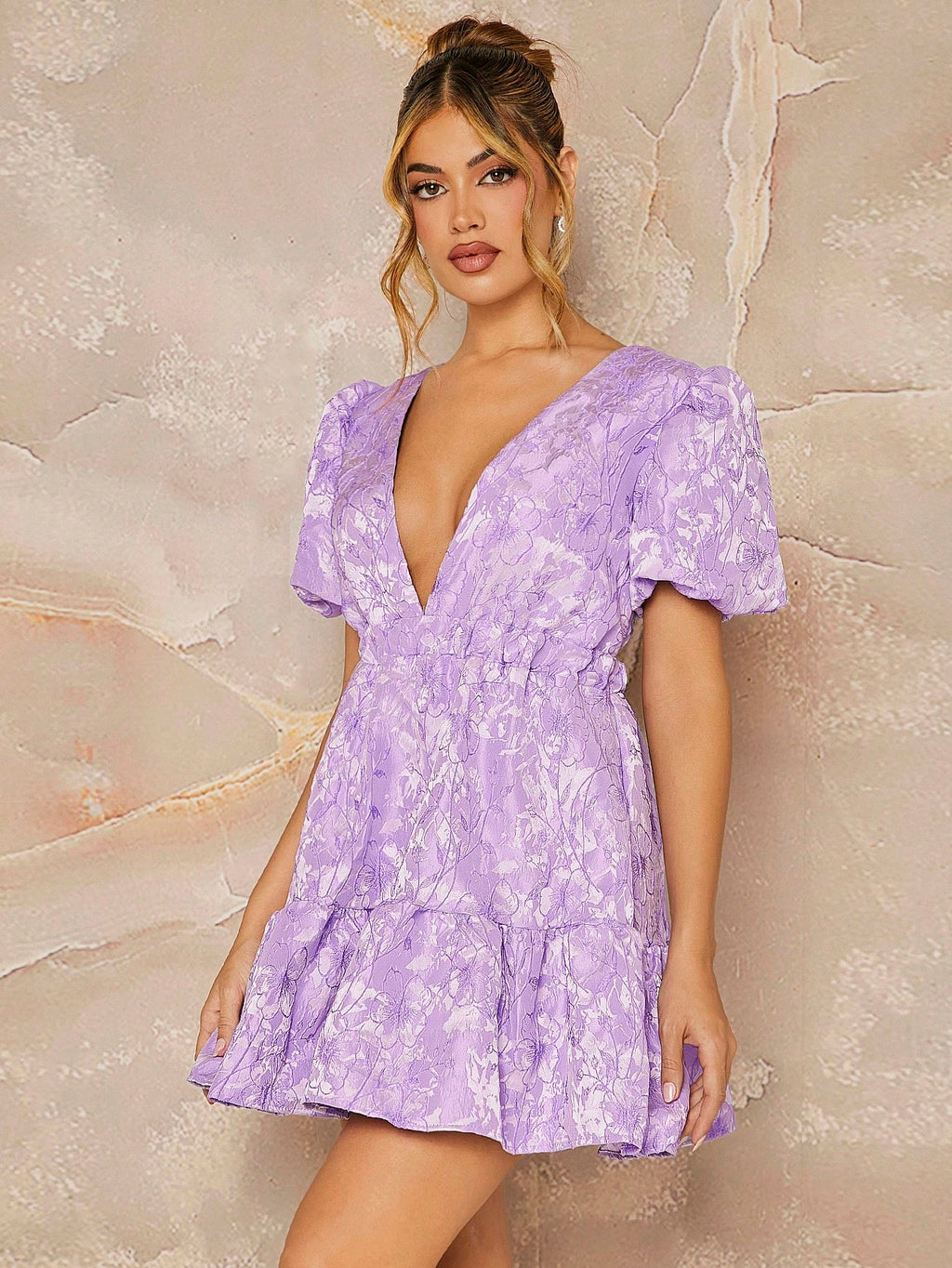 MIU Floral Jacquard Puff Sleeve Backless Mini Dress For Summer