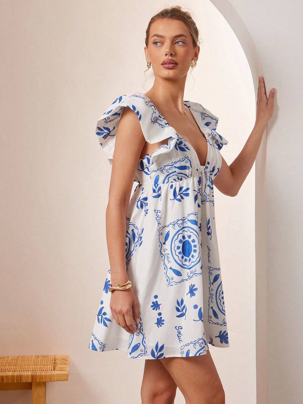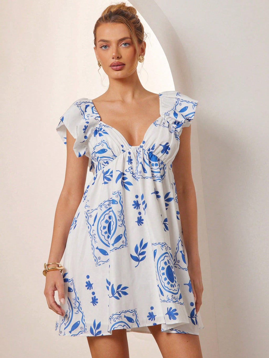 MIU Flutter Sleeve Tropical Print Flowy Vacation Summer Sun Dress, Summer Outfits For Women, Beach Outfits For Women