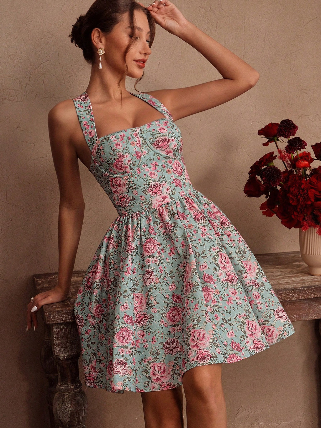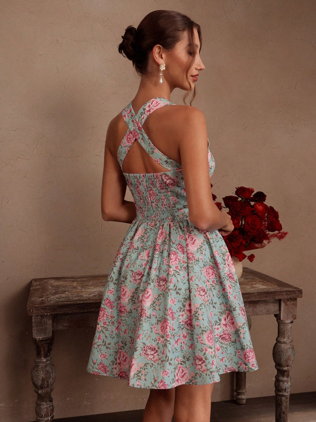 MIU French Romantic Rose Print Halter A-Line Backless Dress For Women, Suitable For Summer, Beach, Festival, Holiday