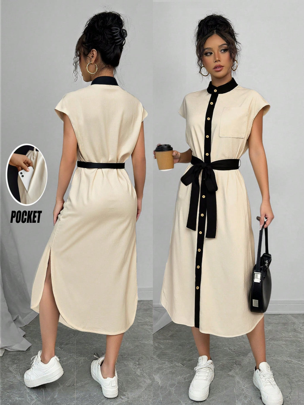 MIU AZRA Ženska Crna Crep Haljina sa Nabranom Ovratnikom i Rukavima u Zvonu