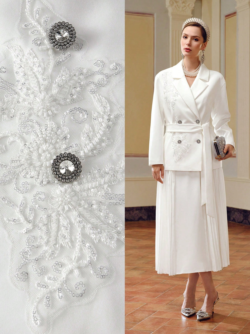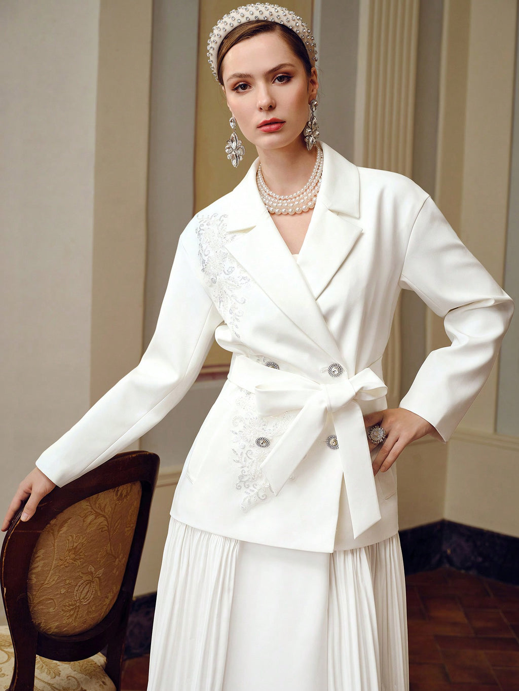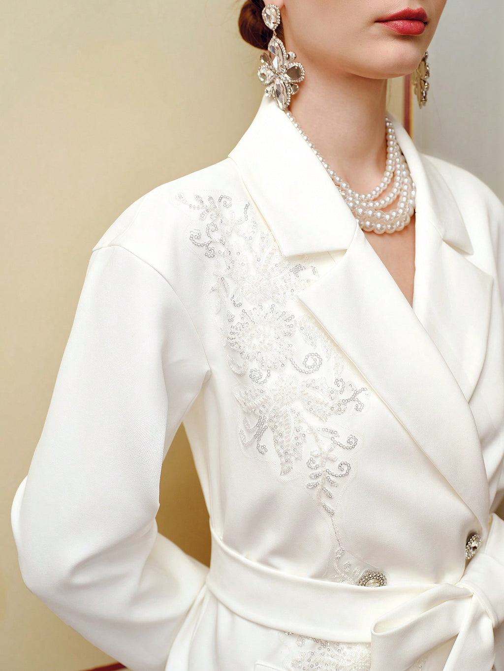 MIU LAPEL COLLAR SEQUIN DETAIL BELTED DOUBLE BREASTED PLACKET BLAZER