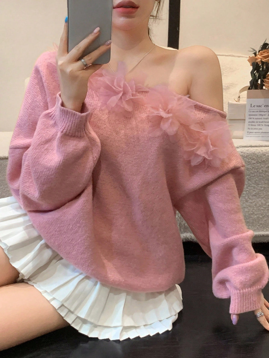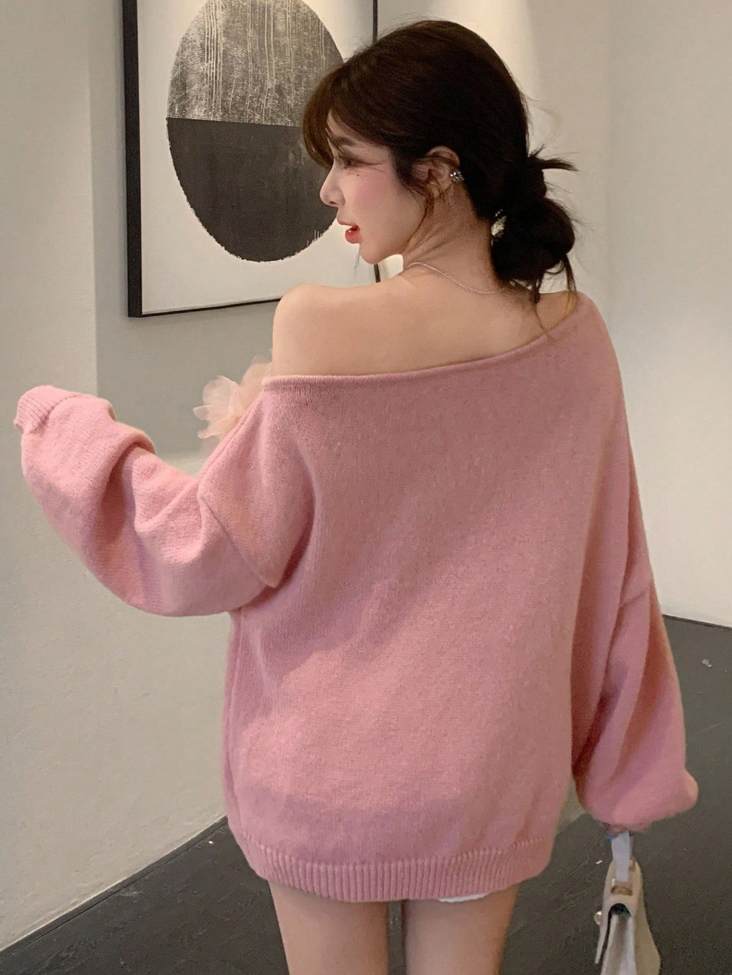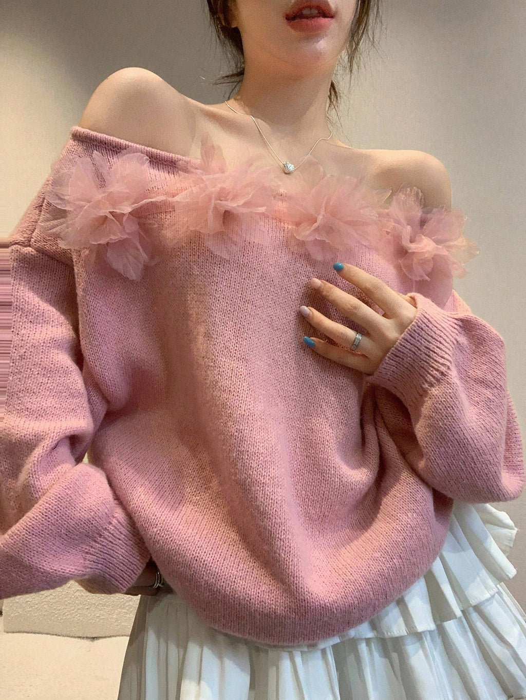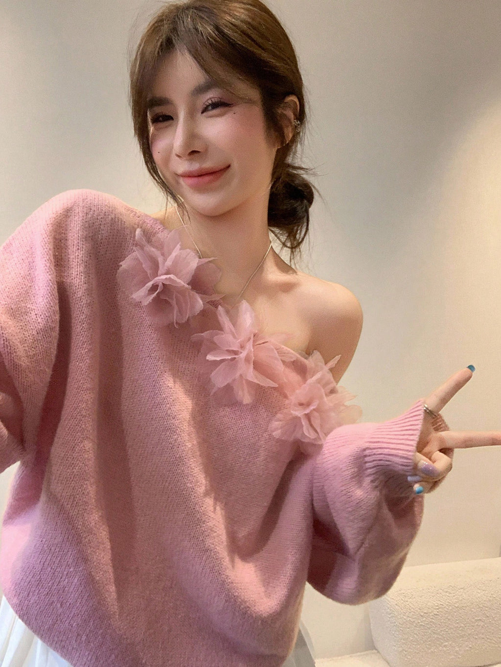 MIU Livesso New Loose Casual Sweater For Women With Sweet 3D Floral Off Shoulder Decor, Suitable For Autumn