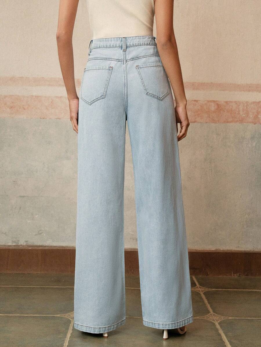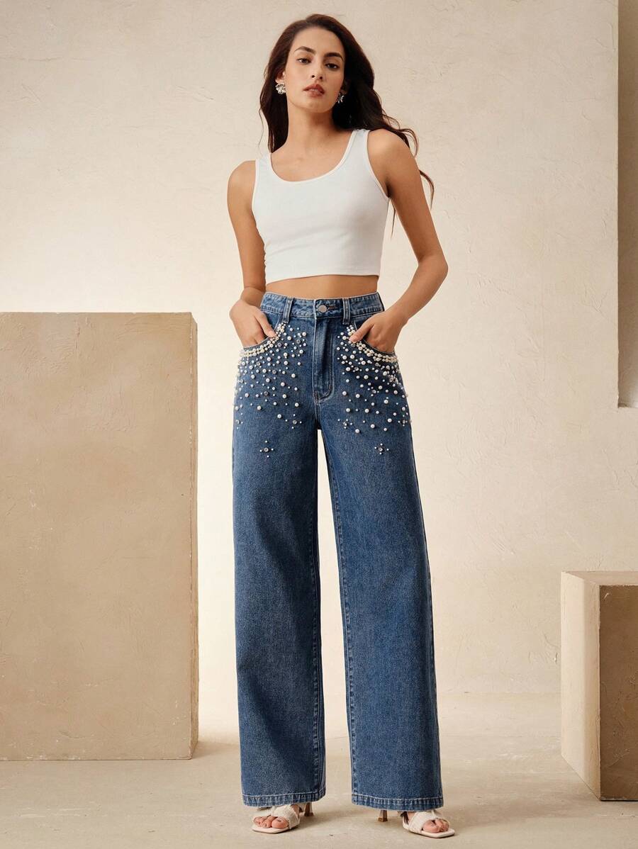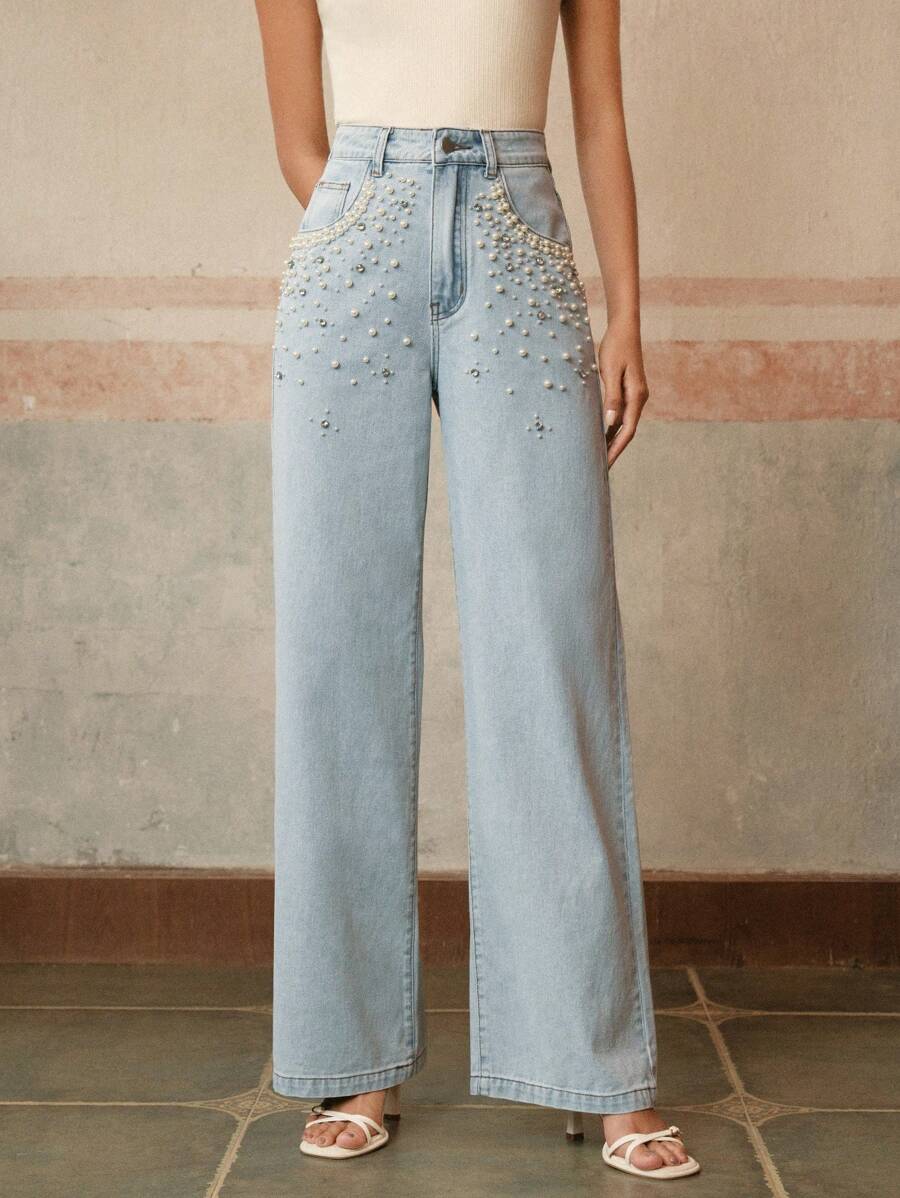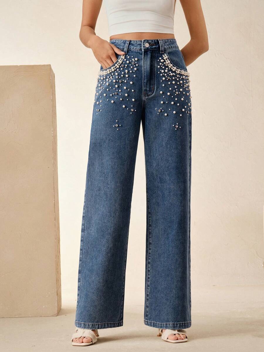 MIU Loose Beaded Decoration Wide Leg Jeans For Women, Versatile