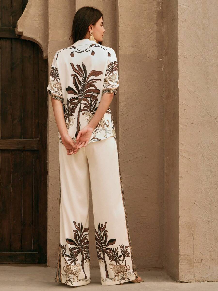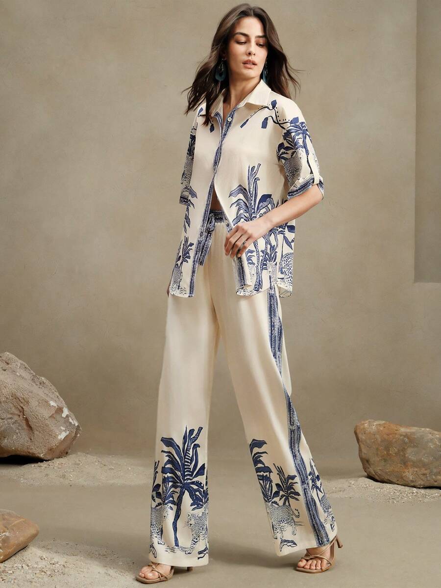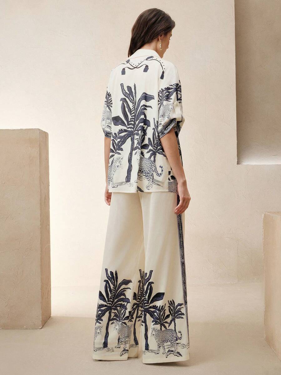 MIU Loose Casual Vintage Print 2Pcs Set, Including Shirt And Wide-Leg Pants, Suitable For Spring/Summer, Going Out, Vacation Outfits, Women