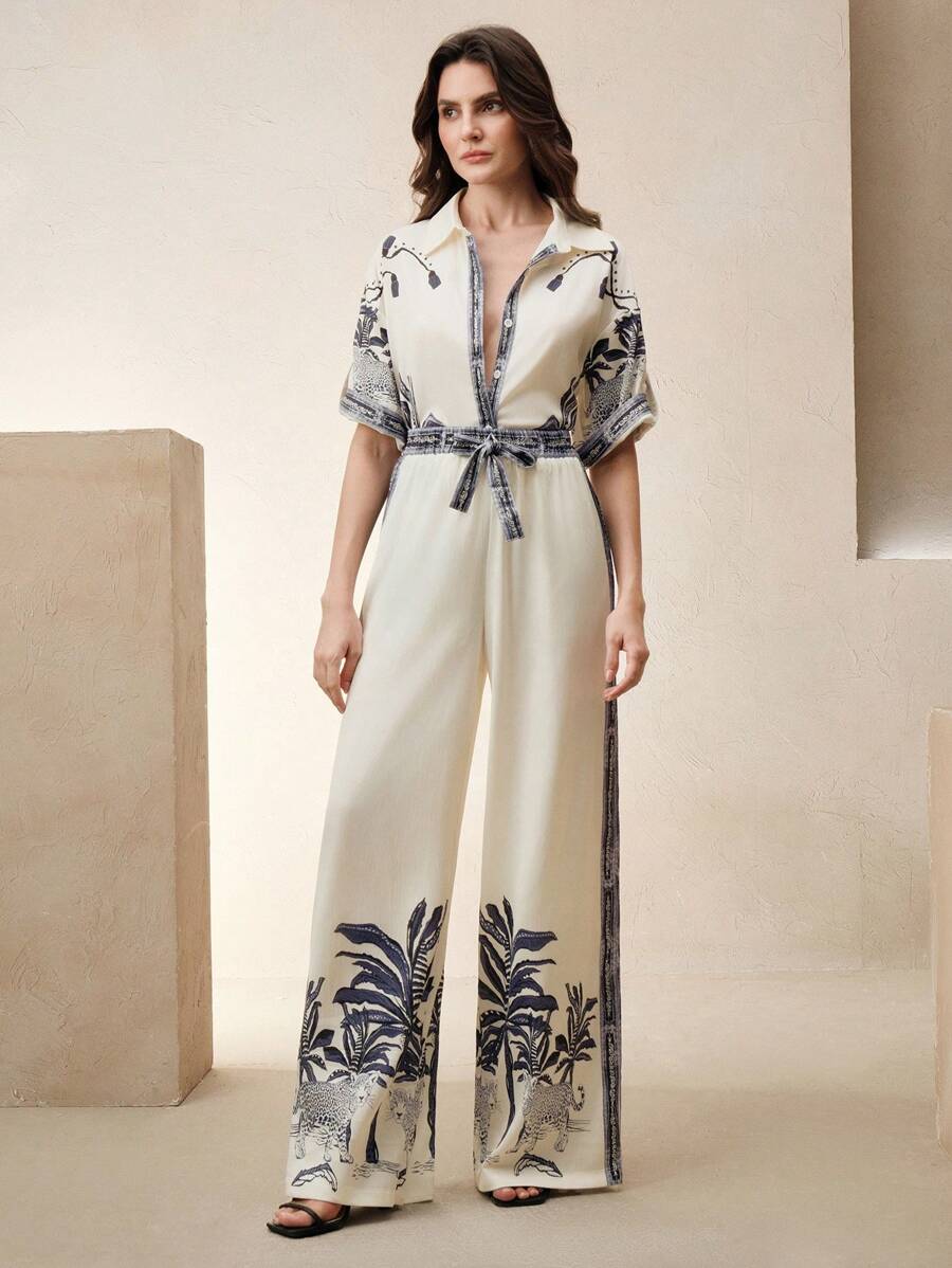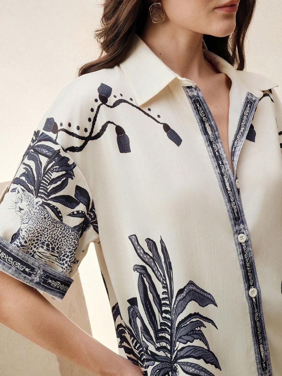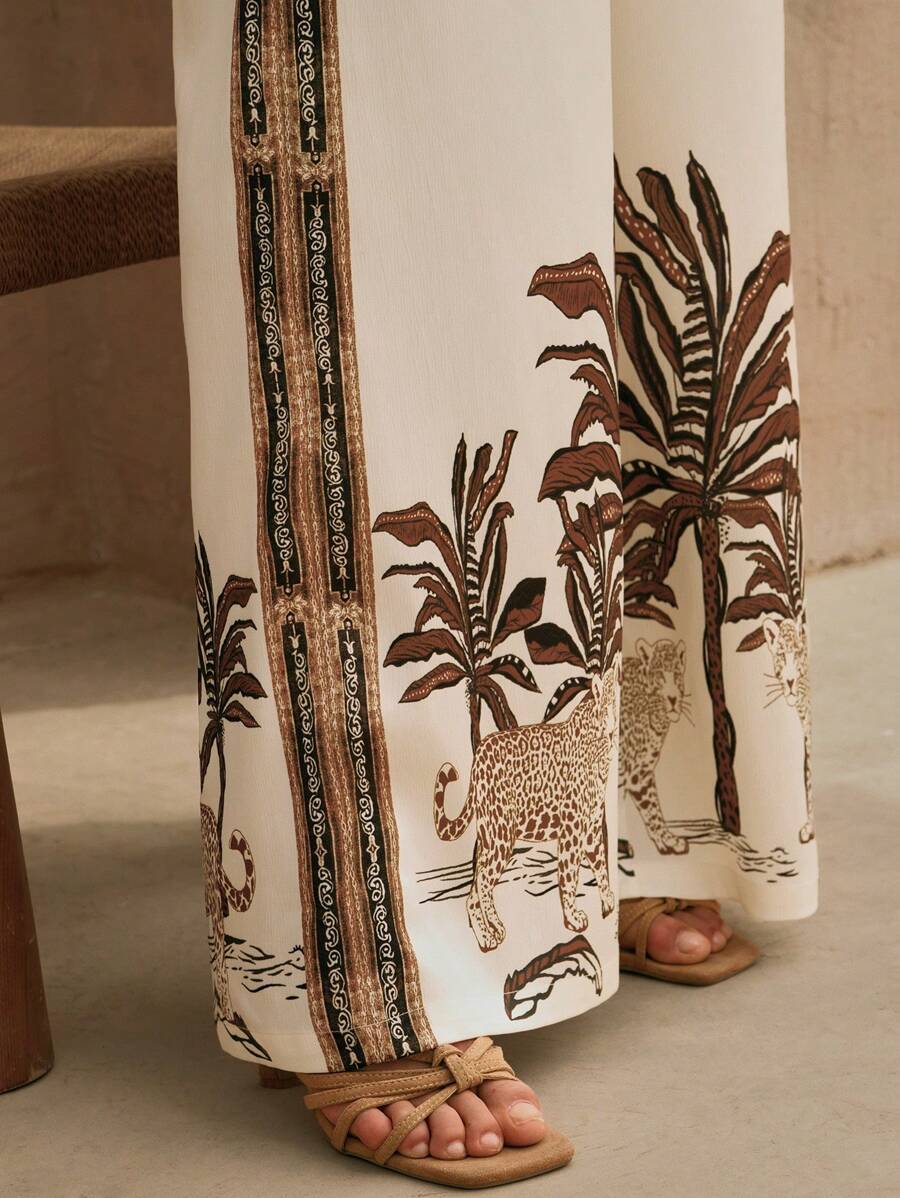 MIU Loose Casual Vintage Print 2Pcs Set, Including Shirt And Wide-Leg Pants, Suitable For Spring/Summer, Going Out, Vacation Outfits, Women