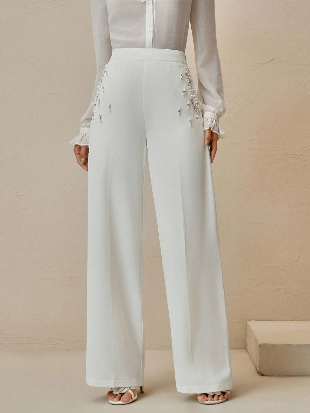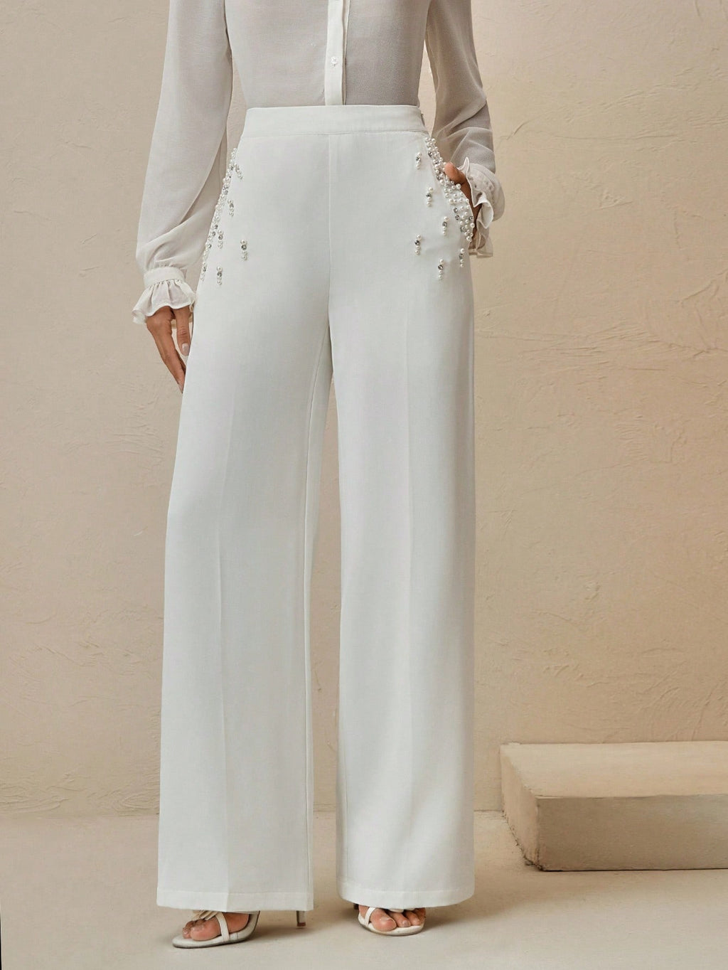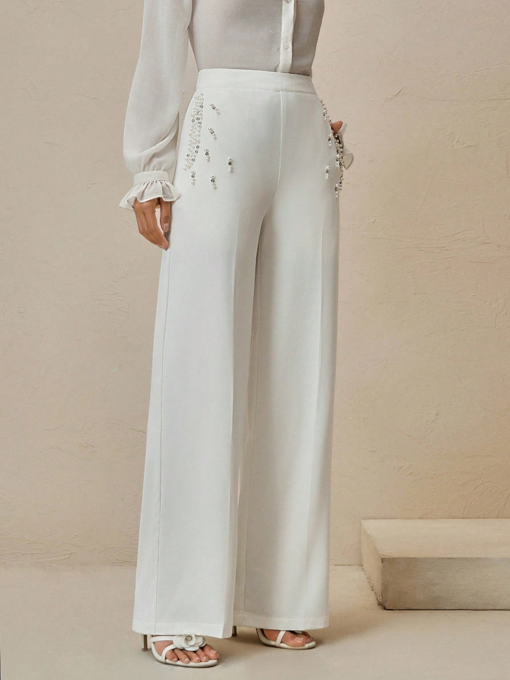 MIU Luxury Studded Embellished High Waist Loose Straight Leg Women Pants