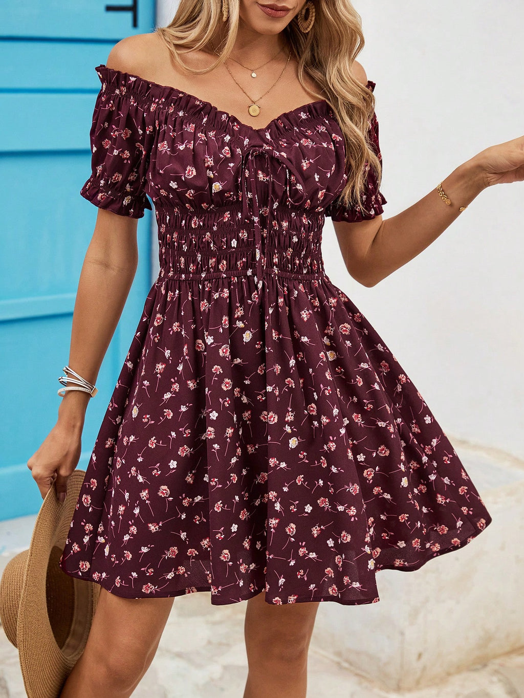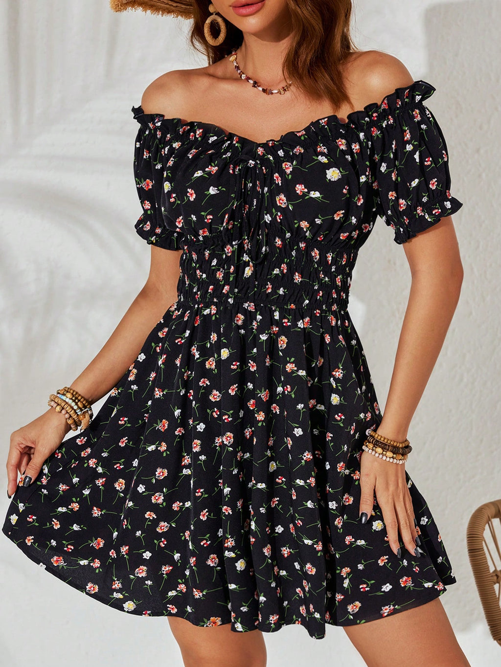MIU Off Shoulder Ruffle Hem Summer Beach Dress For Women, High Waist