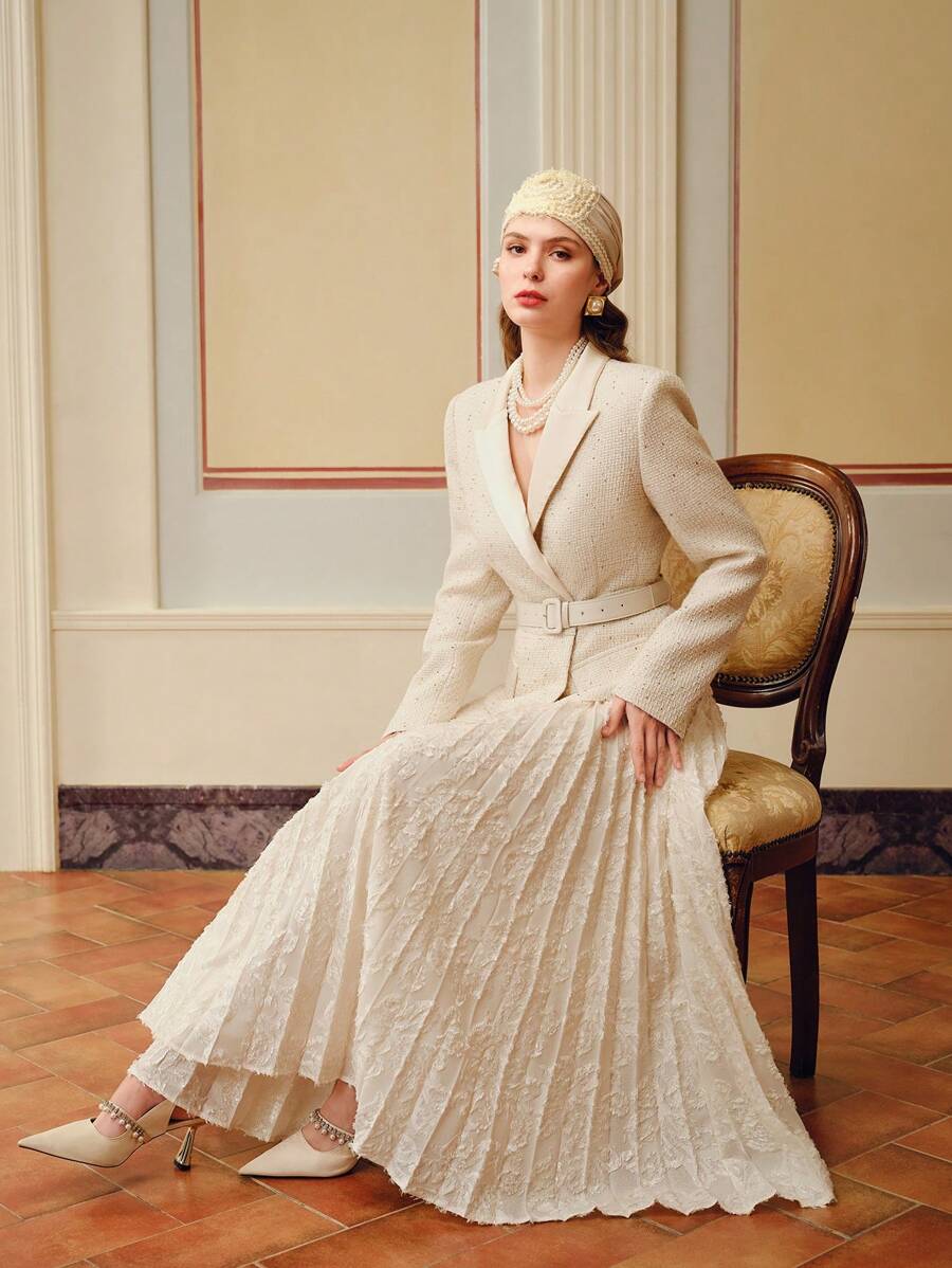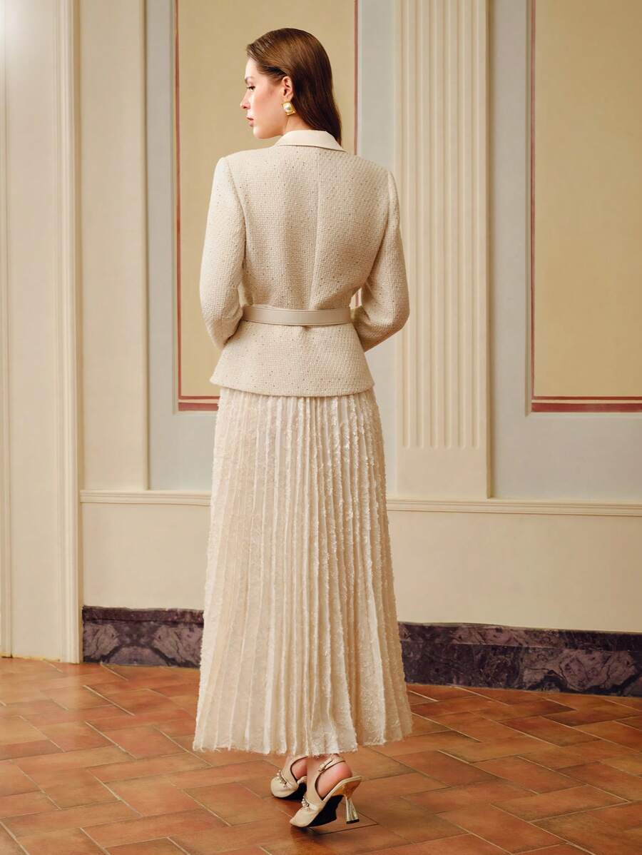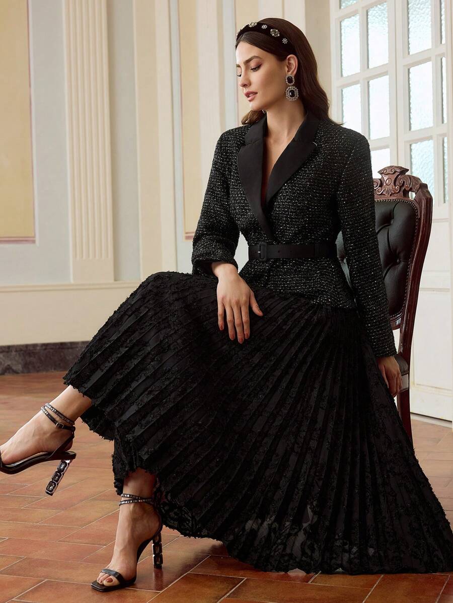 MIU PEAK COLLAR BUCKLE BELTED PLEATED HEM 2 IN 1 DRESS