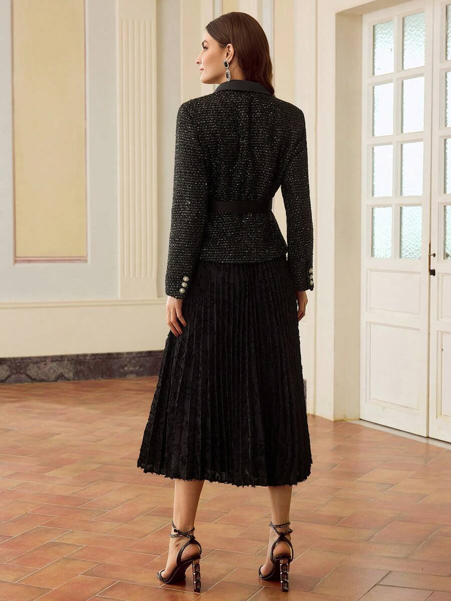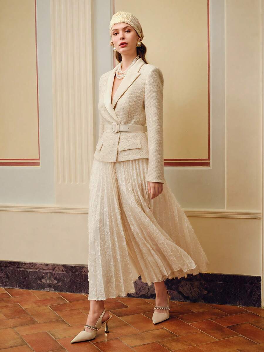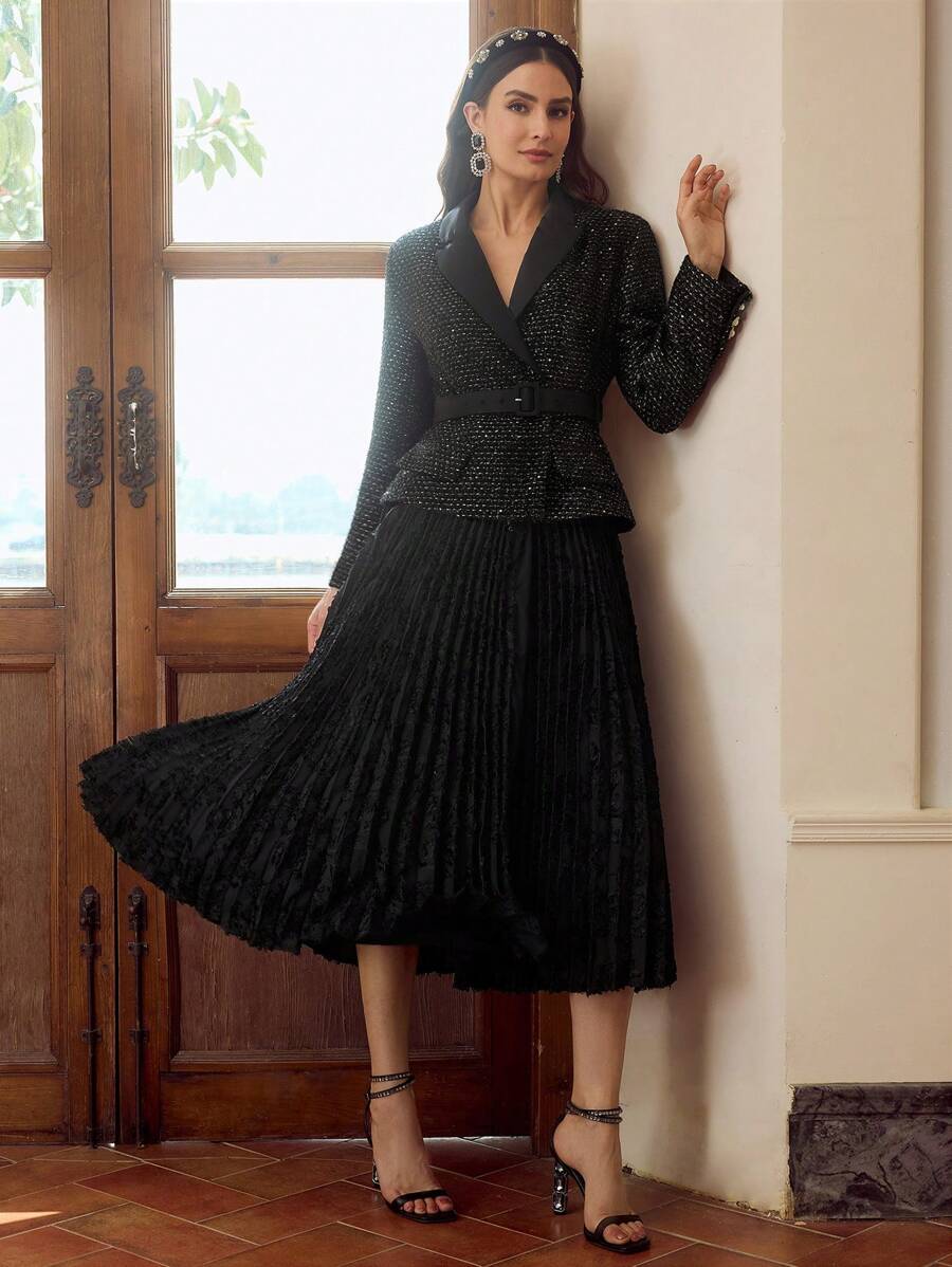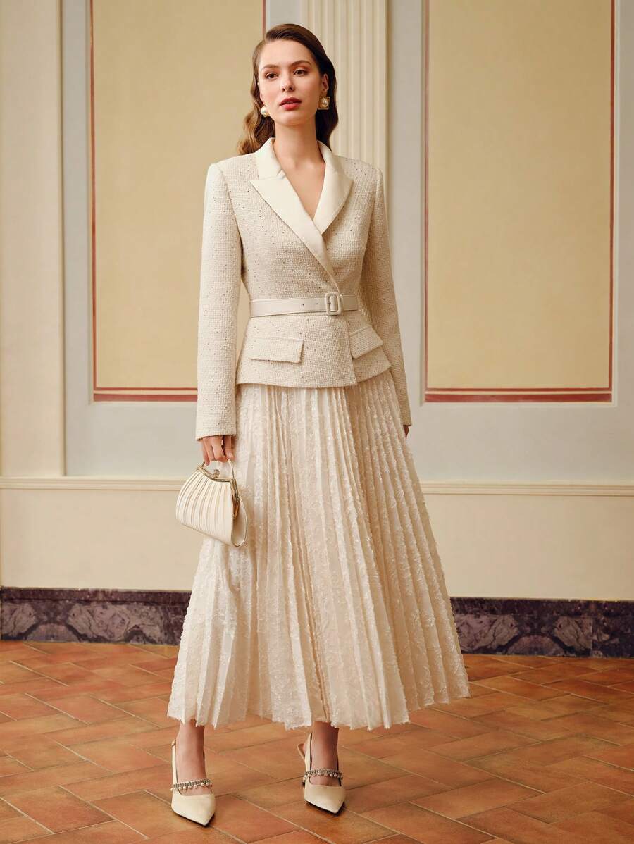 MIU PEAK COLLAR BUCKLE BELTED PLEATED HEM 2 IN 1 DRESS