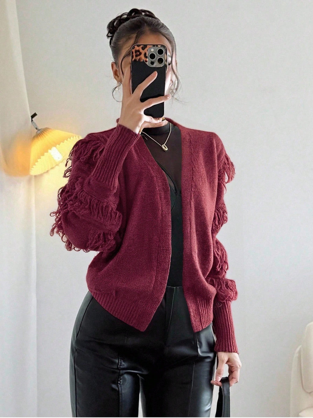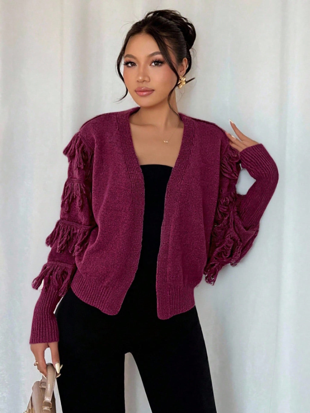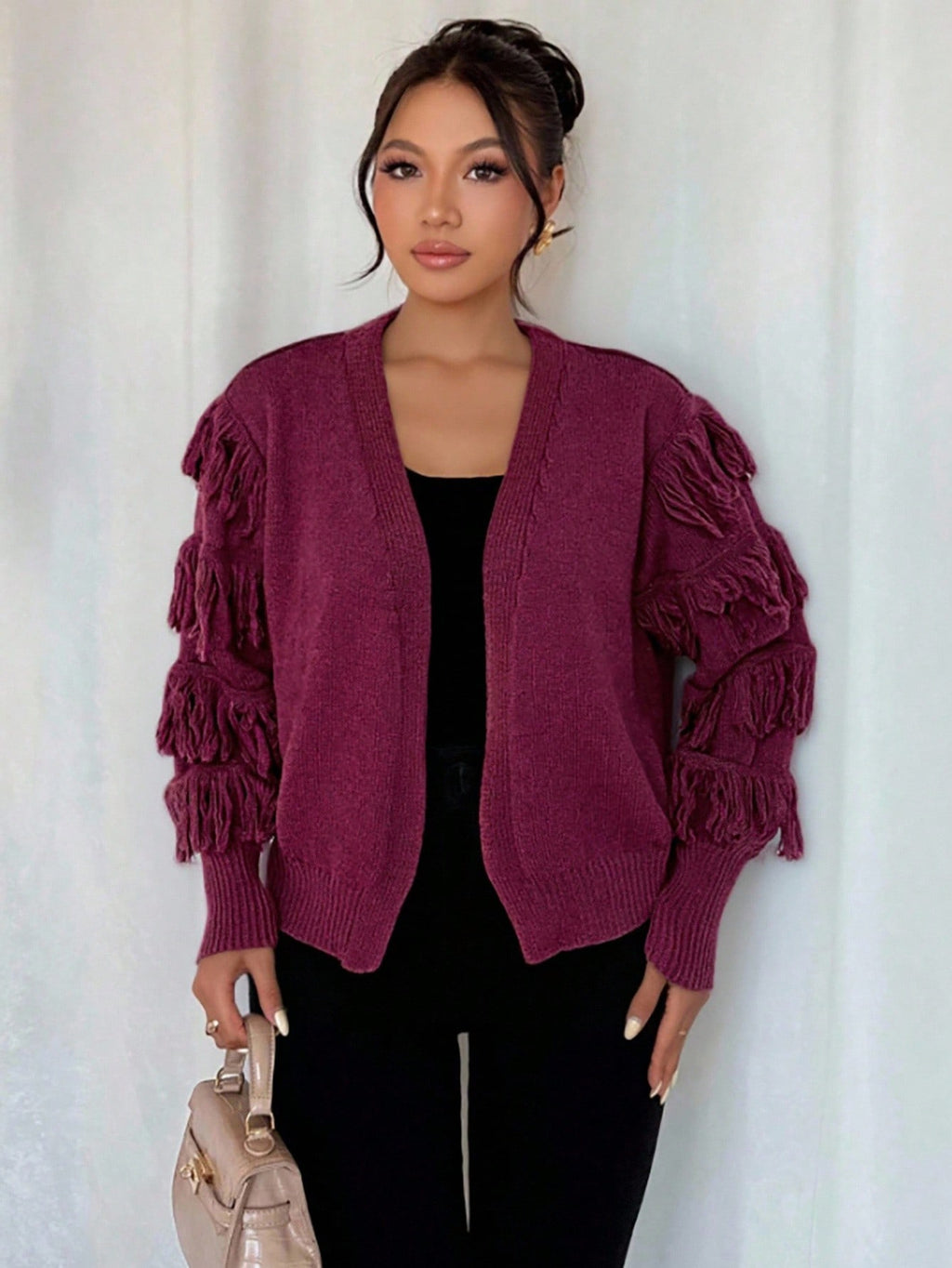 MIU PETITE Women's Basic Minimalist Elegant French Style Fringe Loose Knit Cardigan, Long Sleeve