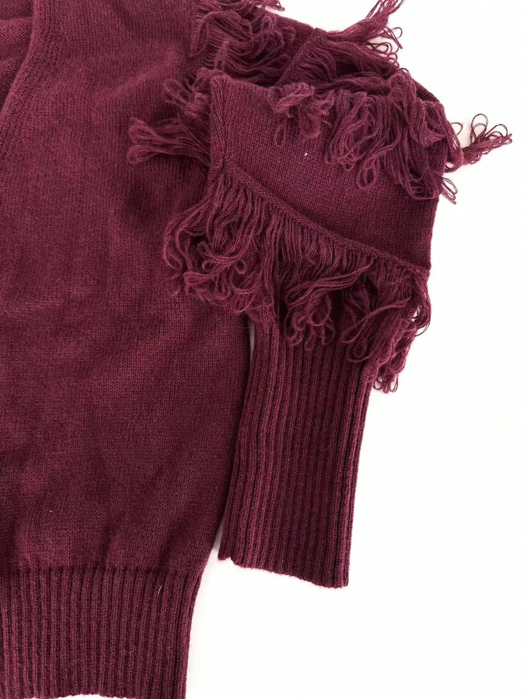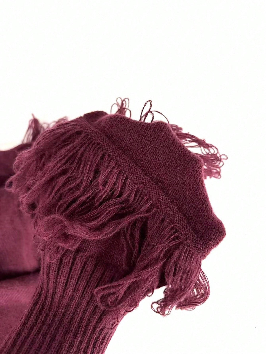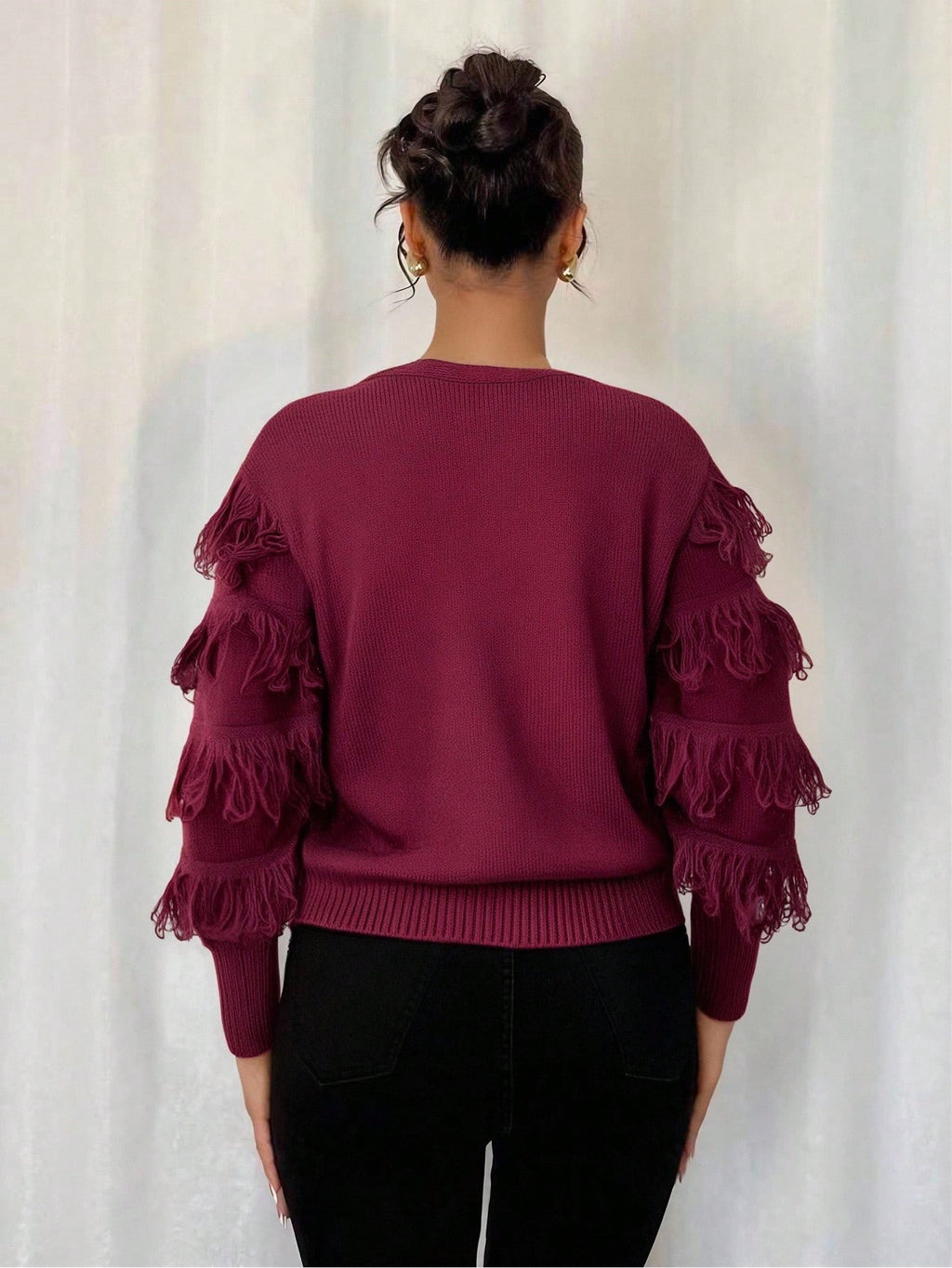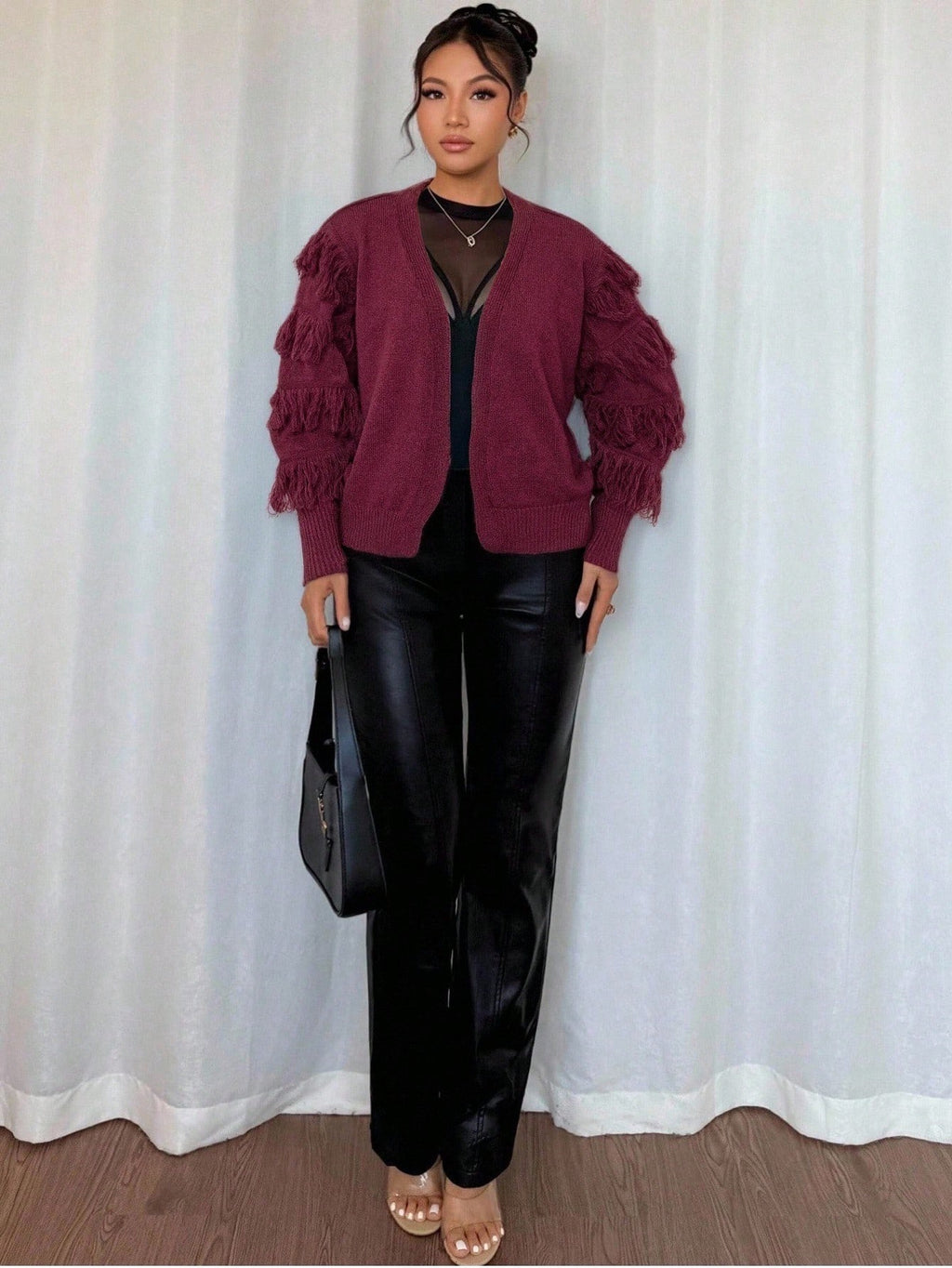 MIU PETITE Women's Basic Minimalist Elegant French Style Fringe Loose Knit Cardigan, Long Sleeve