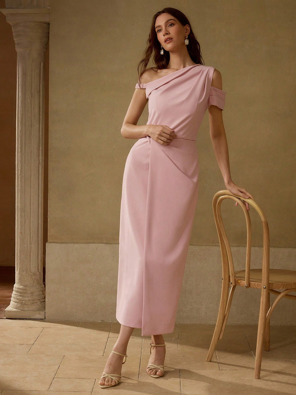 MIU PREMIUM ASYMMETRICAL SHOULDER RUCHED WRAP HEM DRESS