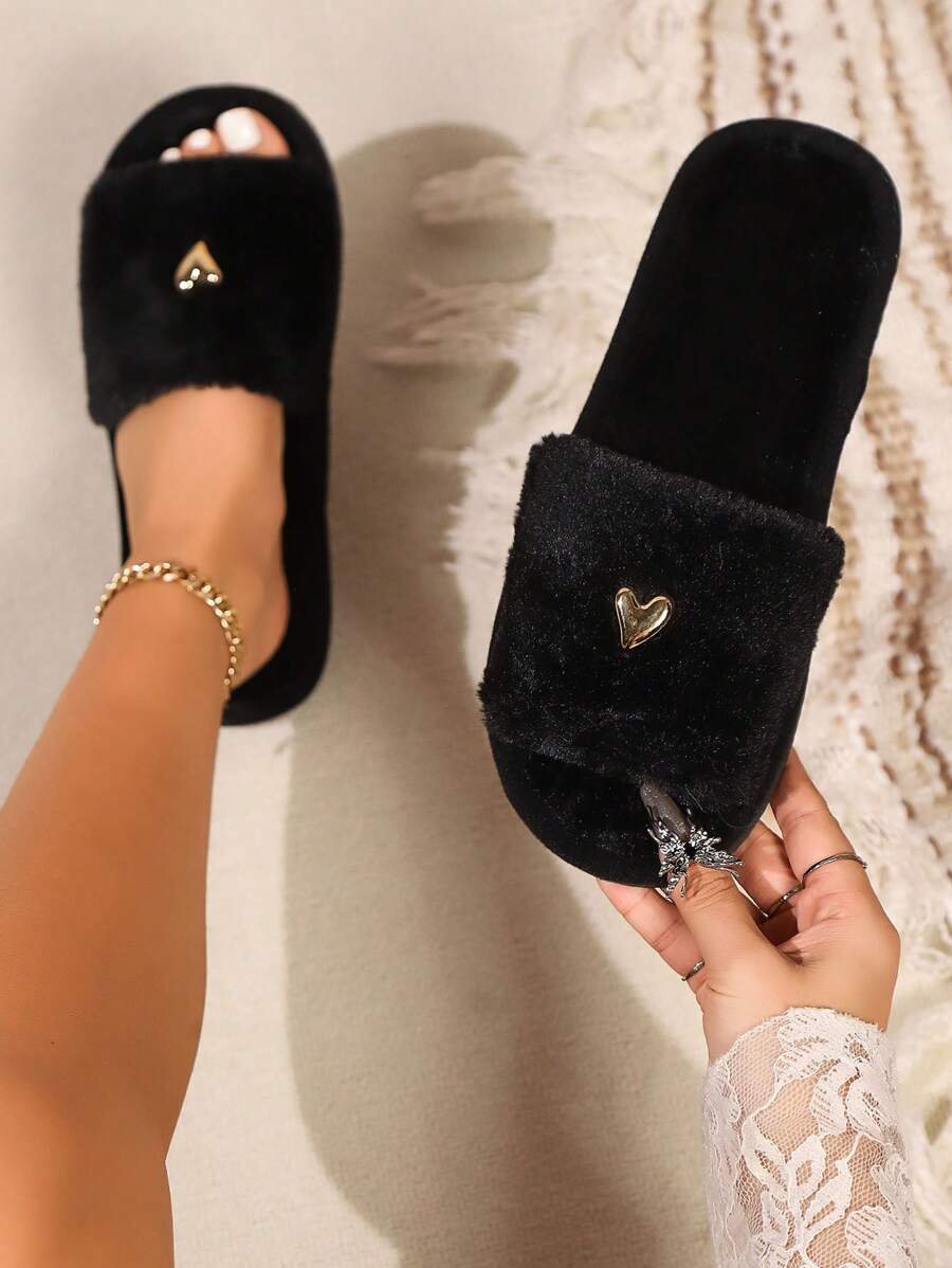 MIU Premium Fashion Heart Decor Plush Slippers For Women, Soft Comfortable Lightweight Slip-On, Suitable For Living Room And Bedroom, All Season