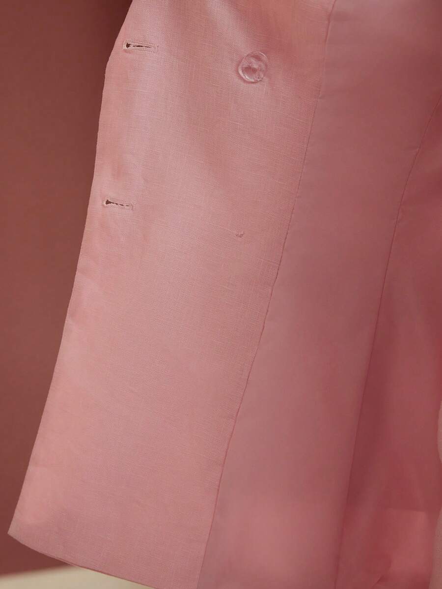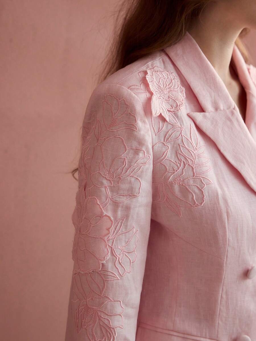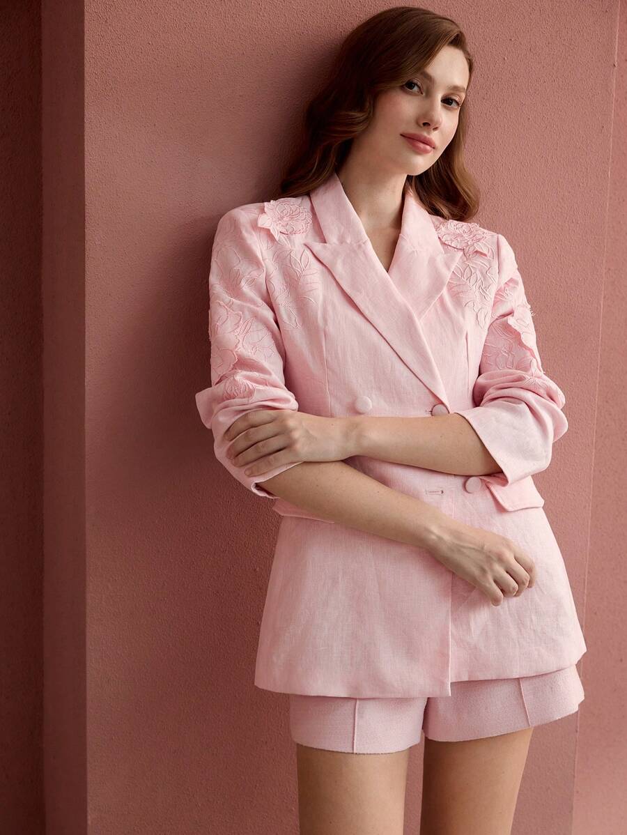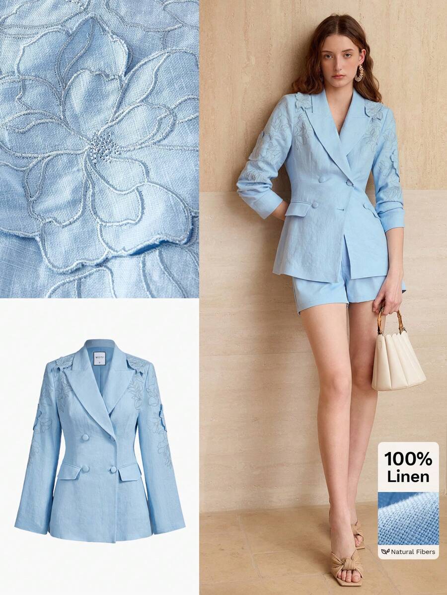 MIU PREMIUM LINEN EMBROIDERED FLORAL DOUBLE BUTTON BLAZER,SPRING/SUMMER
