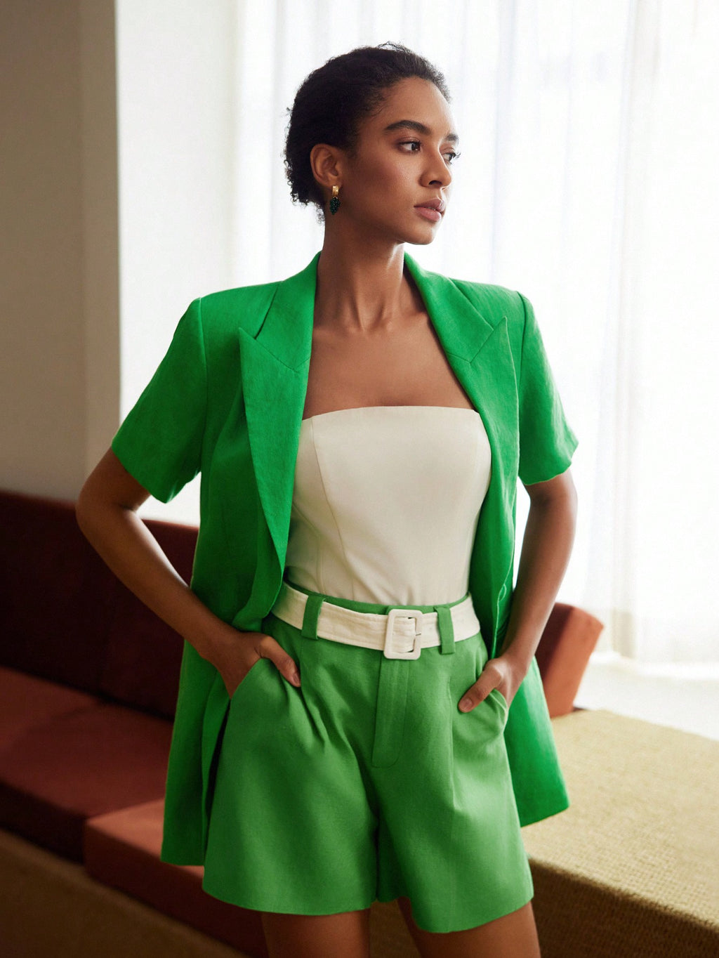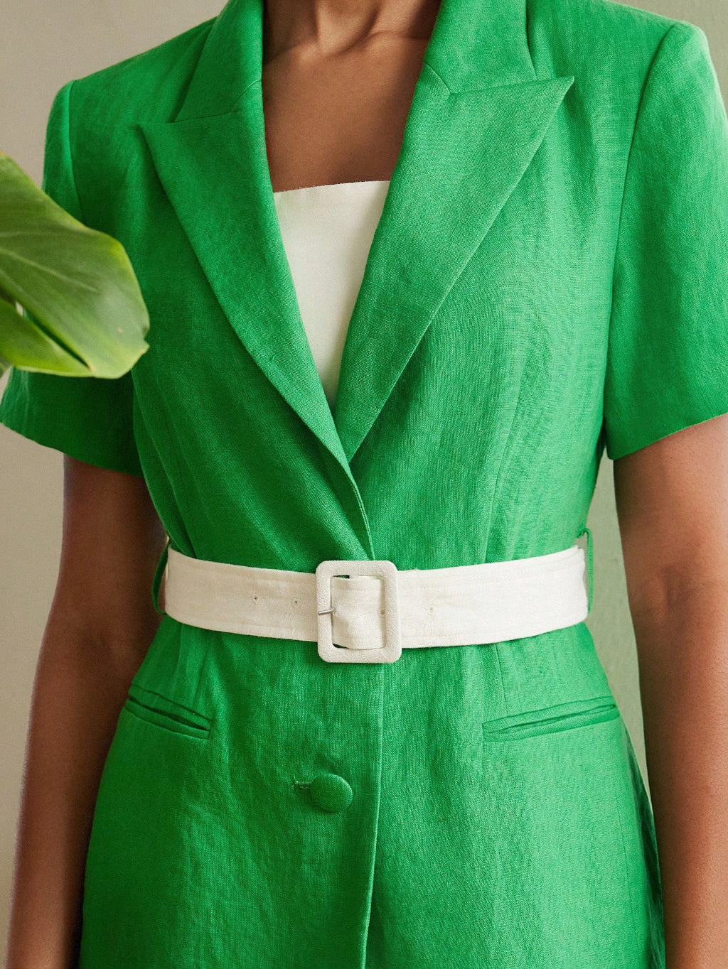 MIU PREMIUM PURE LINEN SOLID PEAK COLLAR CONTRAST BELTED BLAZER