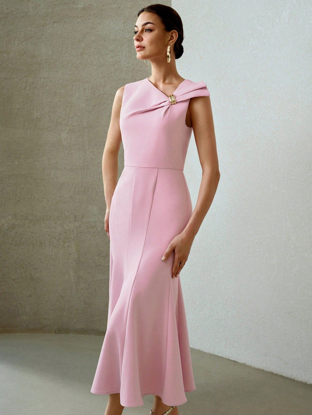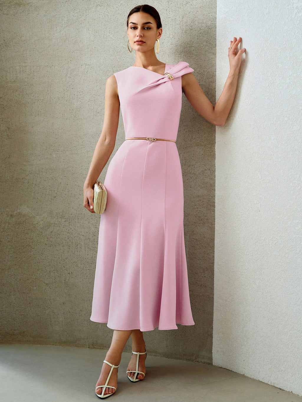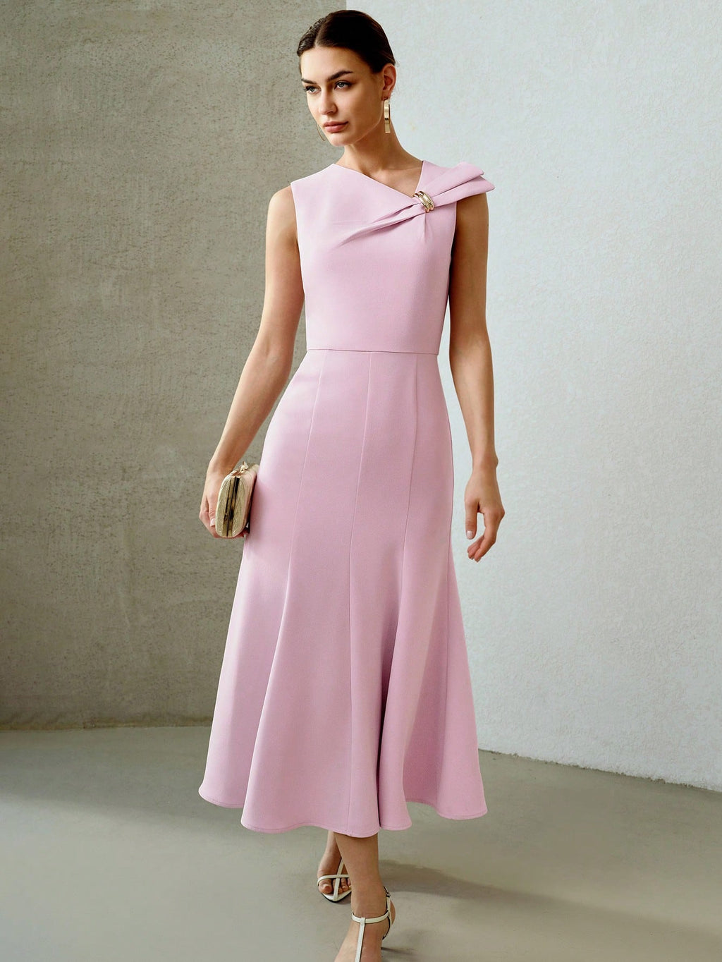 MIU PREMIUM SOLID ASYMMETRICAL NECK FLOWY HEM DRESS WITHOUT BELT