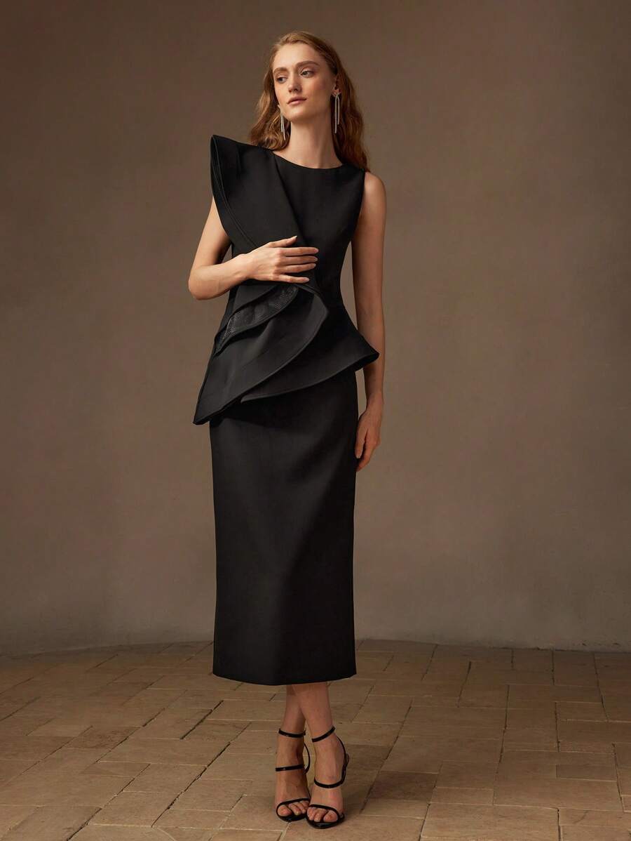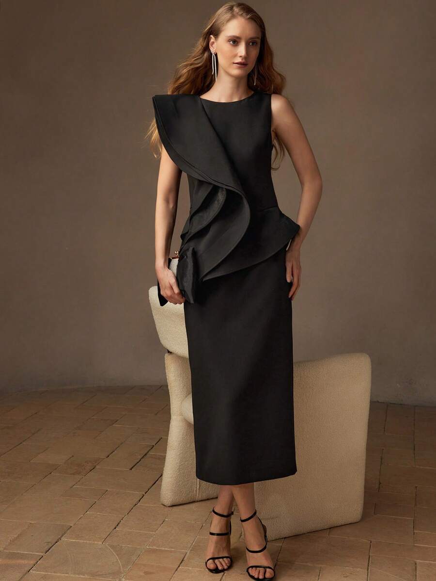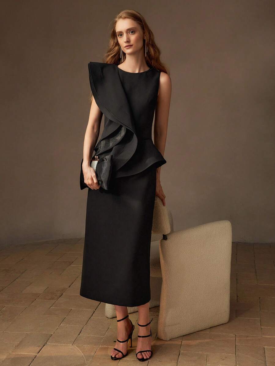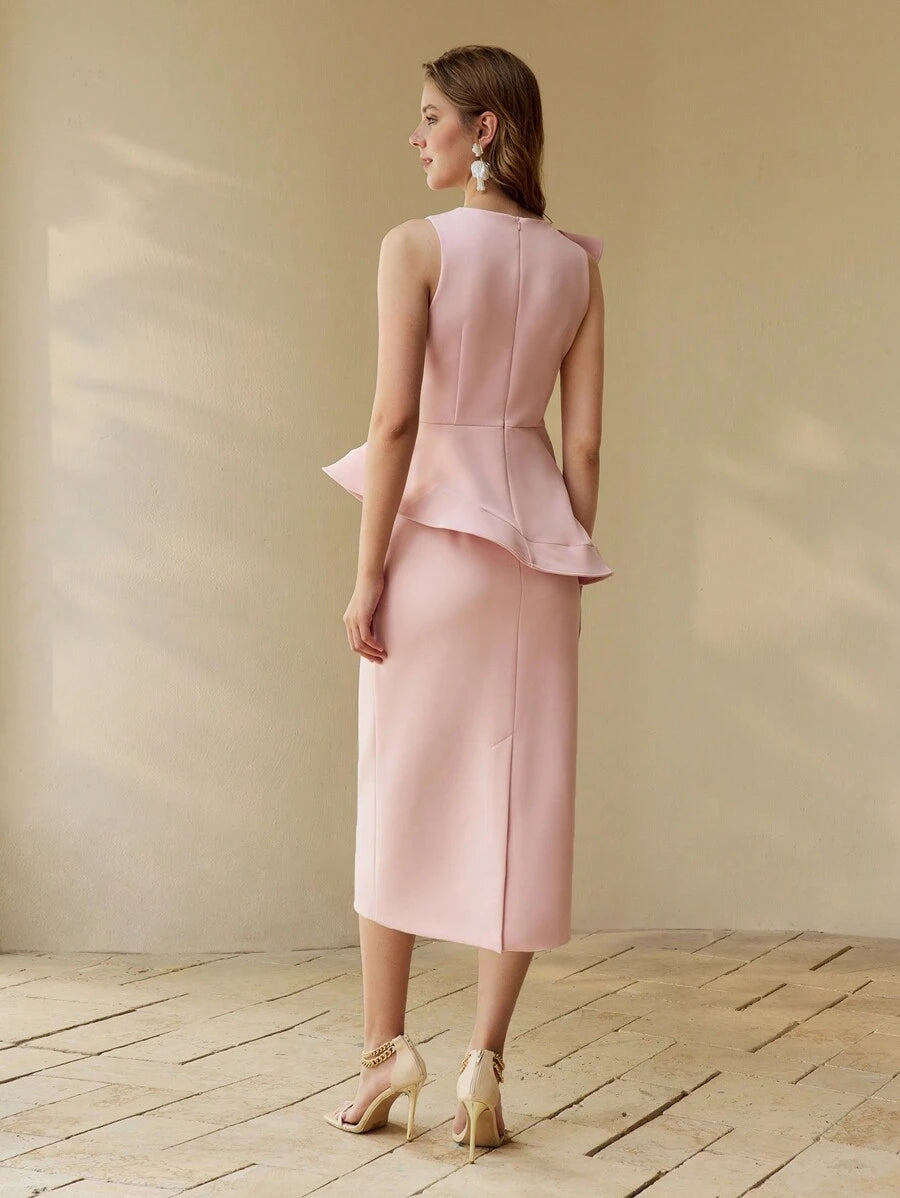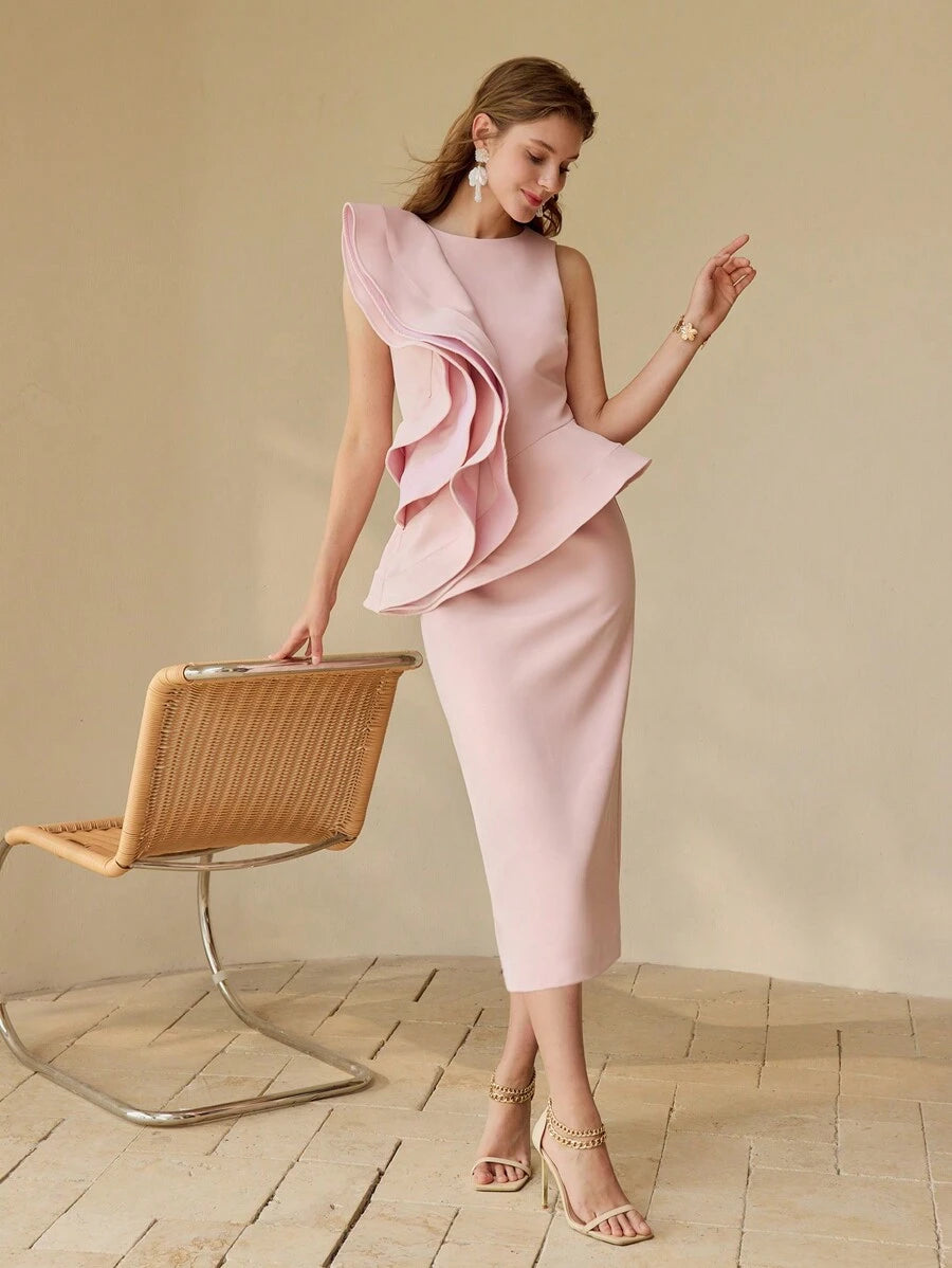 MIU PREMIUM SOLID LAYERED RUFFLE TRIM PEPLUM WAIST MIDI DRESS