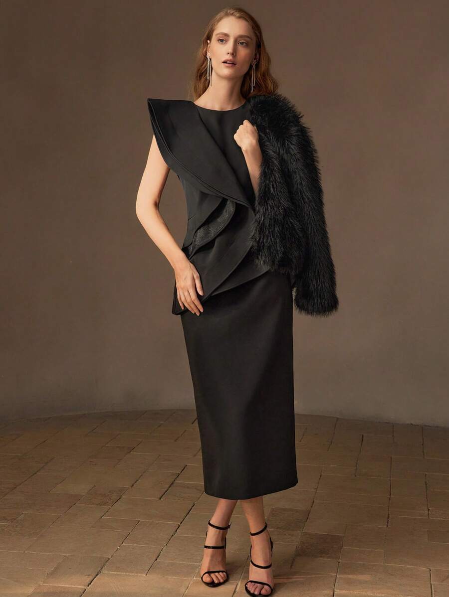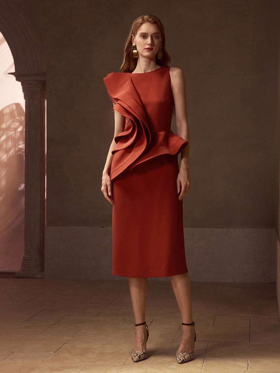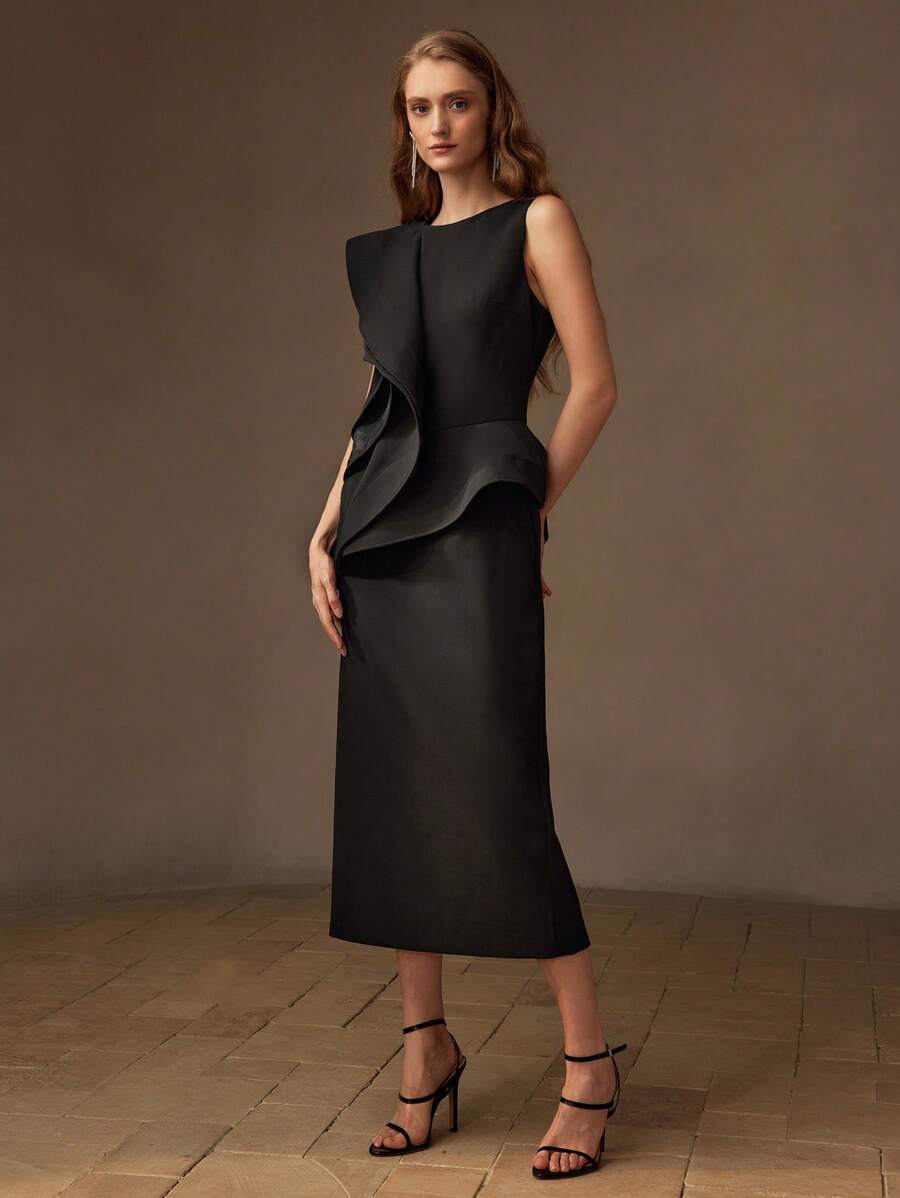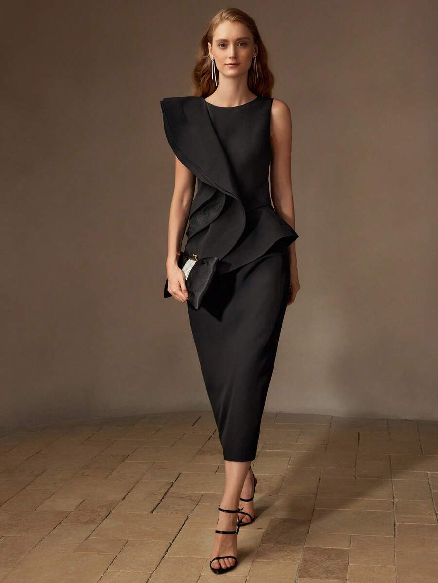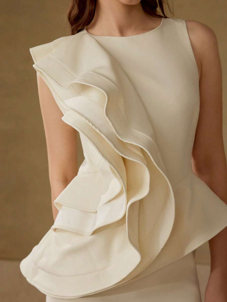MIU PREMIUM SOLID LAYERED RUFFLE TRIM PEPLUM WAIST MIDI DRESS