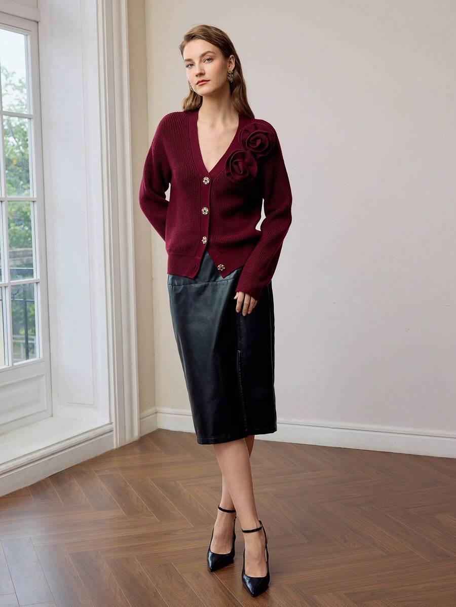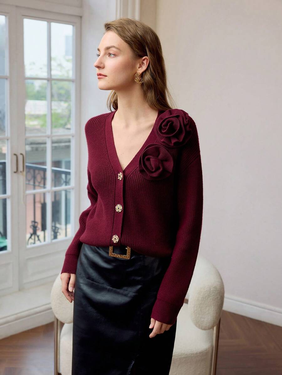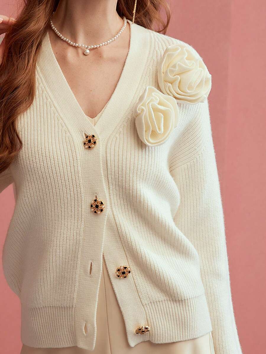 MIU PREMIUM SOLID STEREO FLOWER DETAIL V-NECK DROP SHOULDER OVERSIZE CARDIGAN