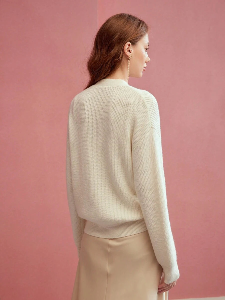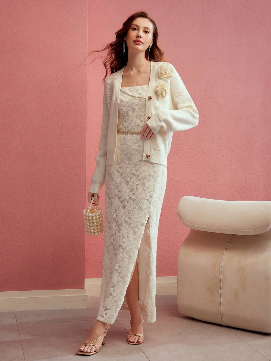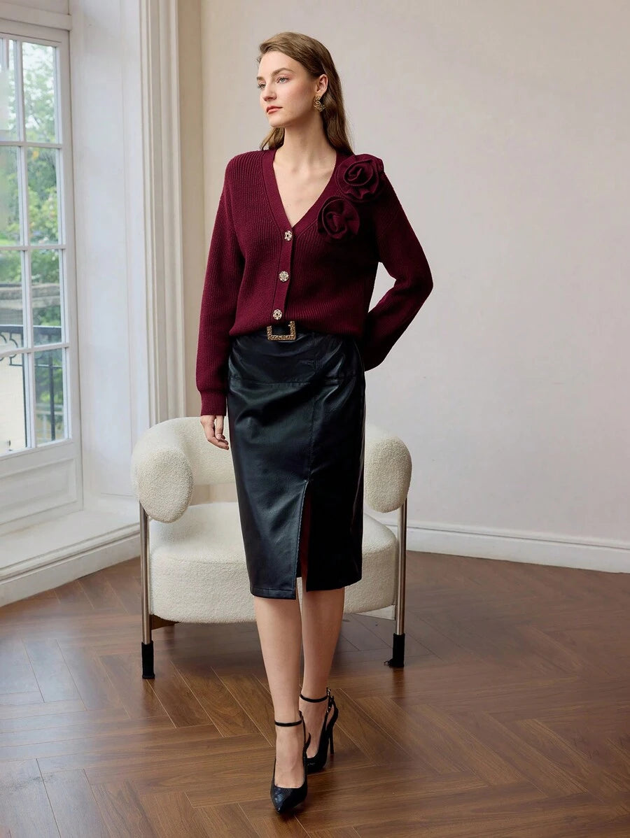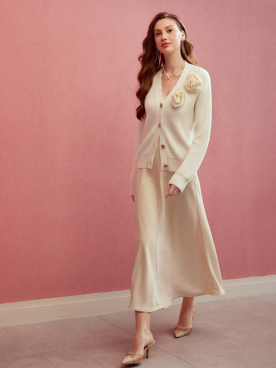 MIU PREMIUM SOLID STEREO FLOWER DETAIL V-NECK DROP SHOULDER OVERSIZE CARDIGAN