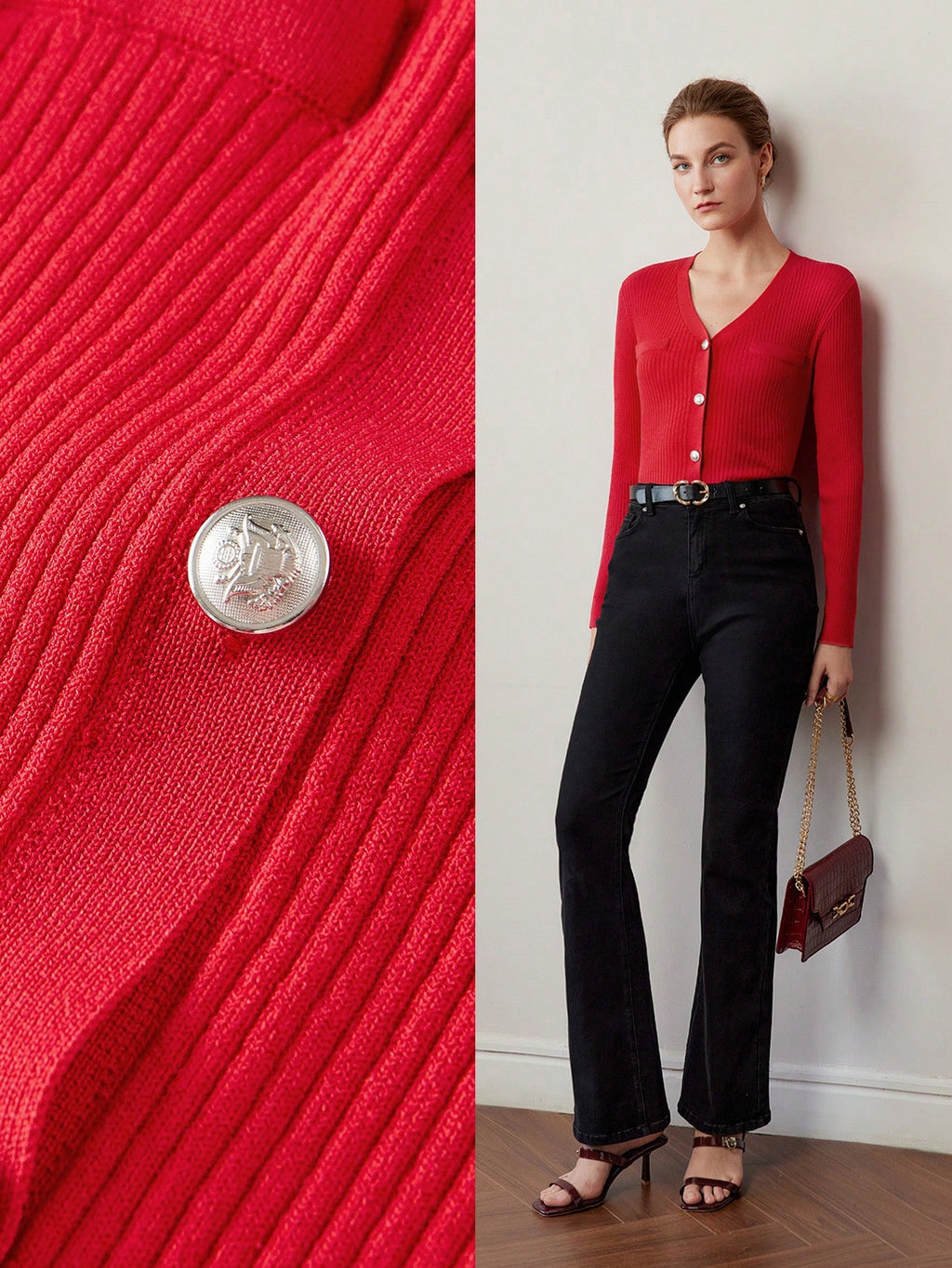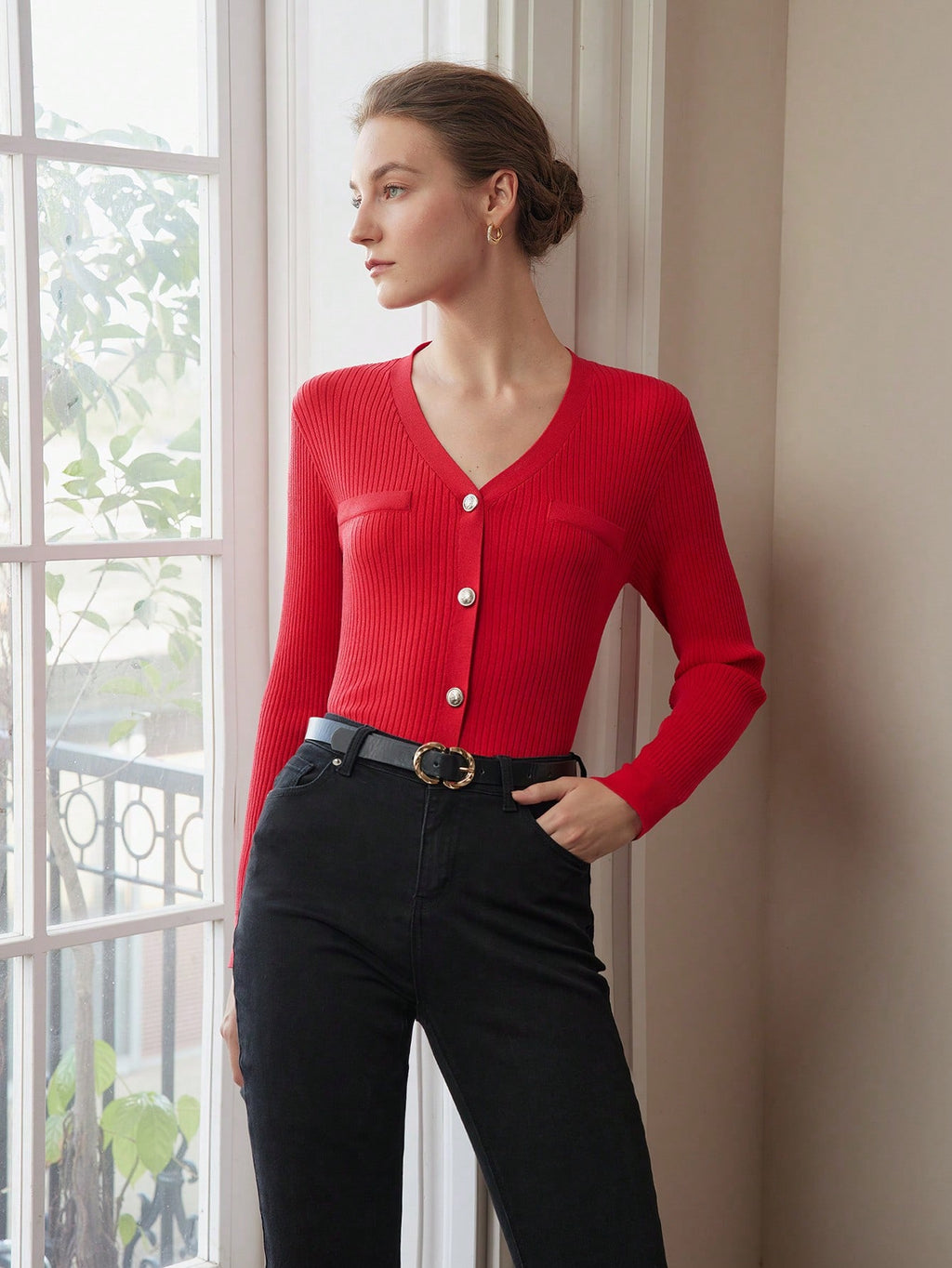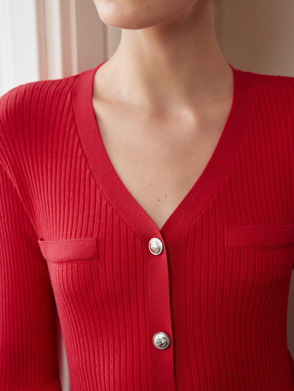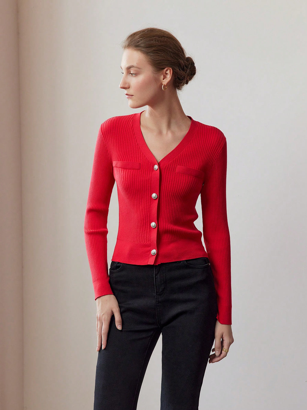 MIU PREMIUM SOLID V-NECK BUTTON PLACKET SLIM FIT CARDIGAN