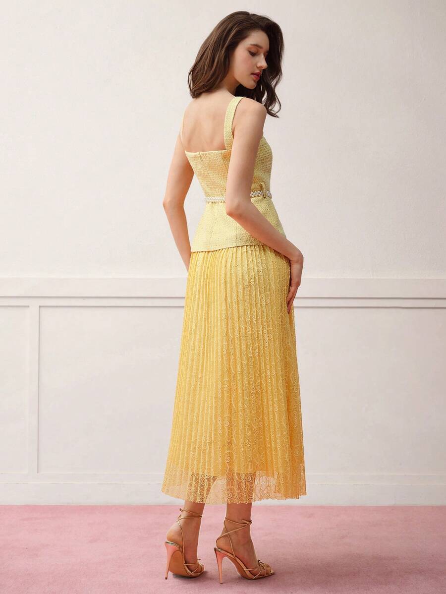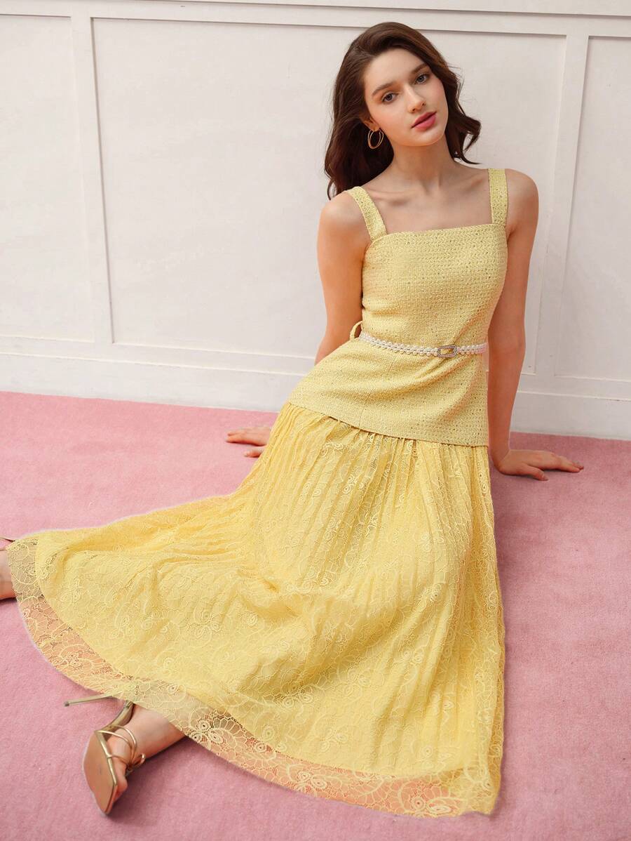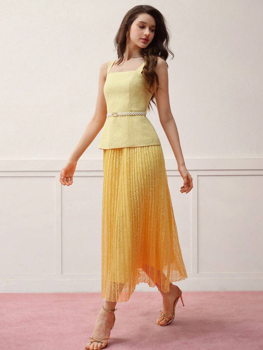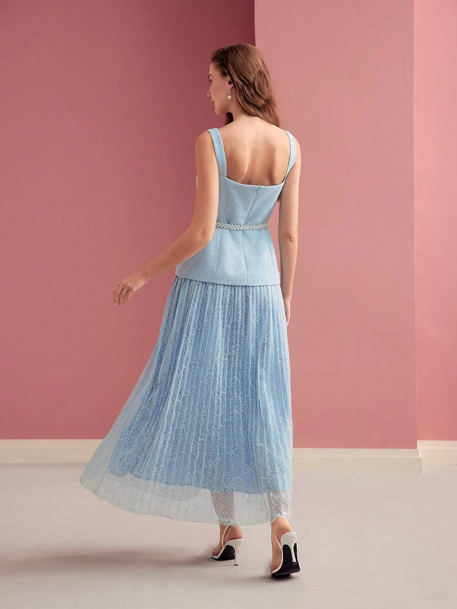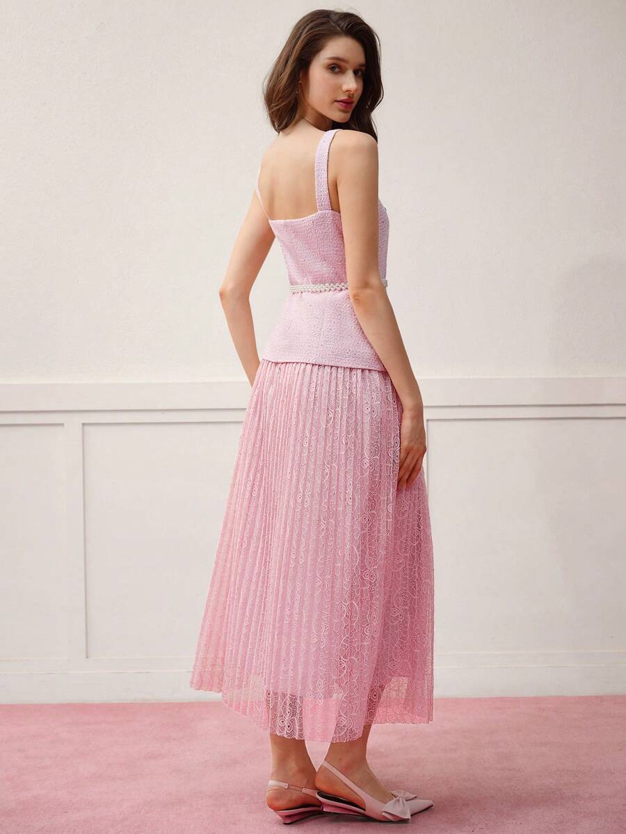 MIU PREMIUM TWEED CONTRAST LACE TANK DRESS, PLEATED MIDI DRESS,SPRING/SUMMER