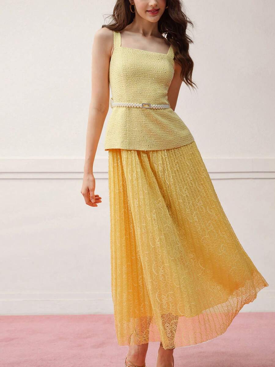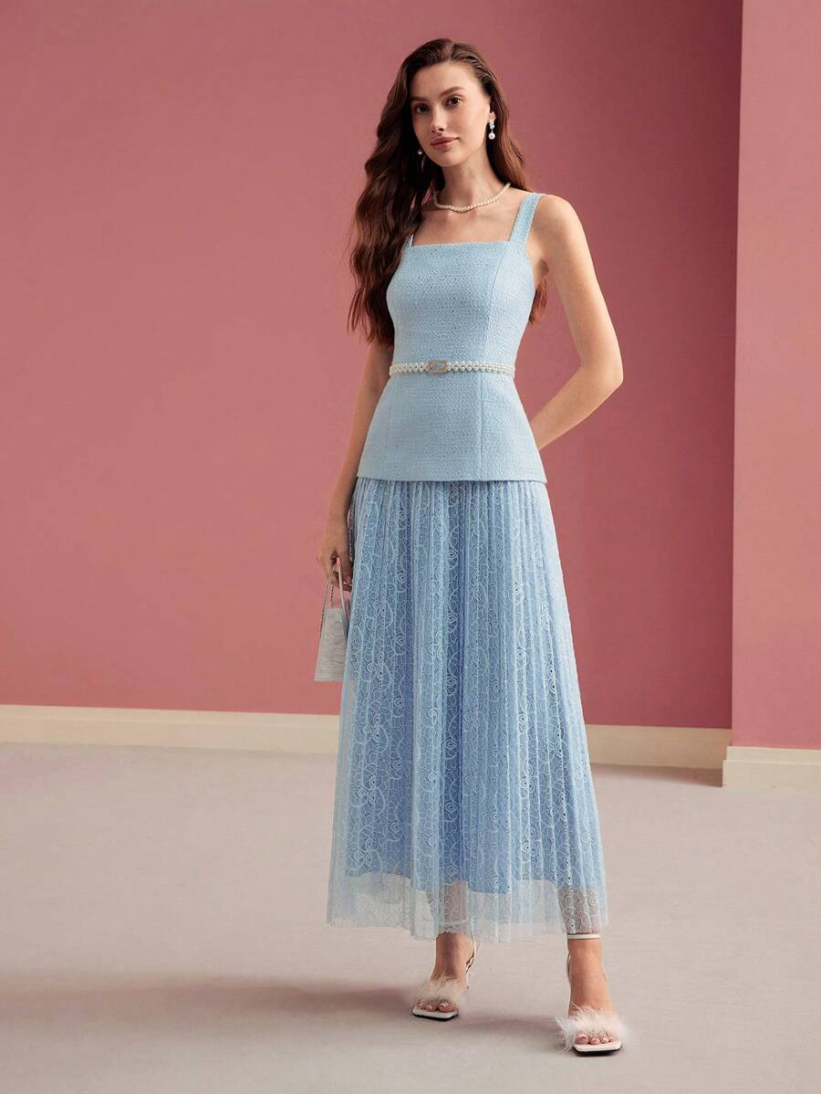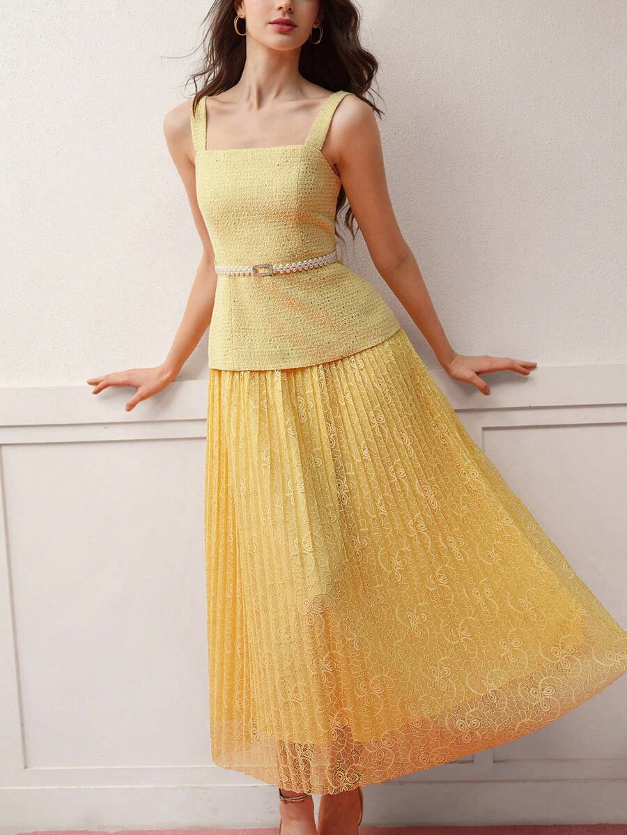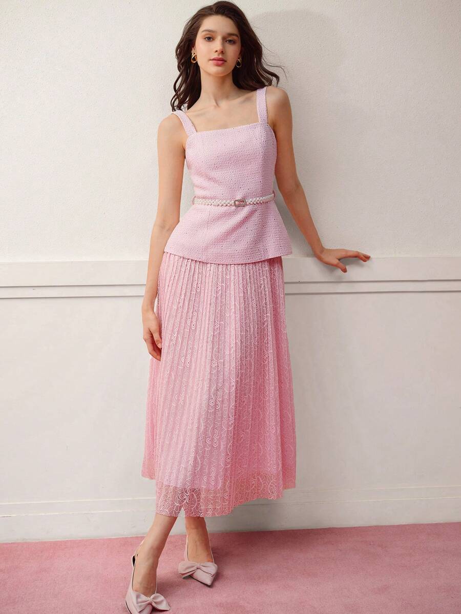 MIU PREMIUM TWEED CONTRAST LACE TANK DRESS, PLEATED MIDI DRESS,SPRING/SUMMER