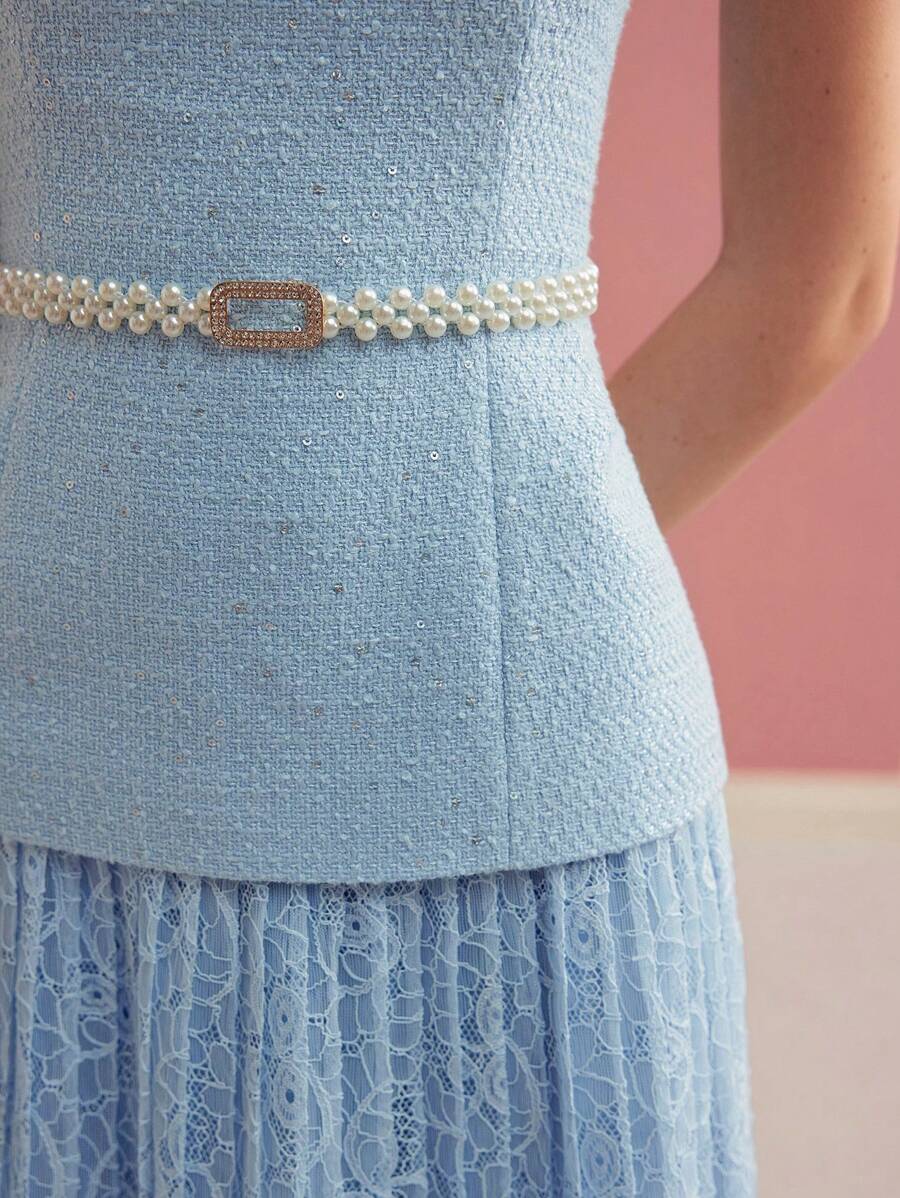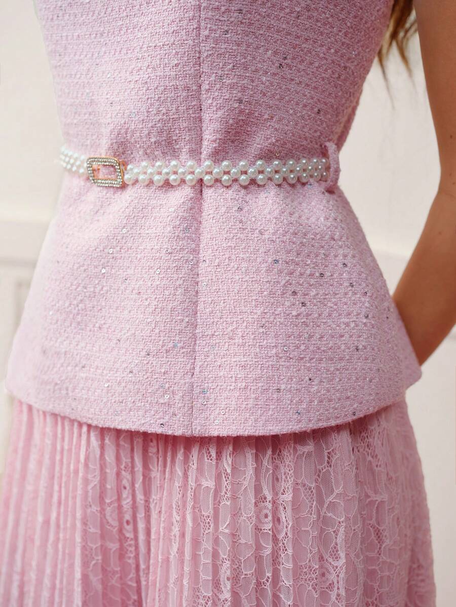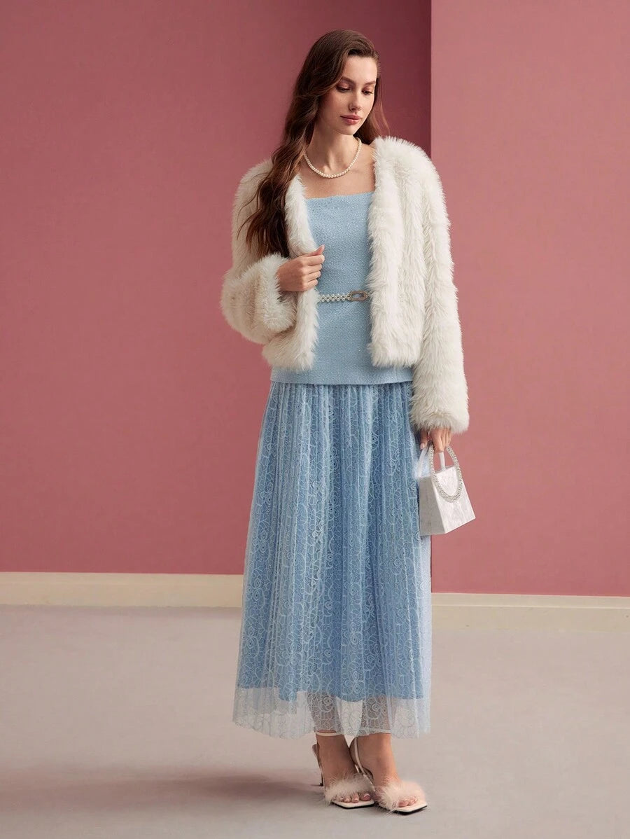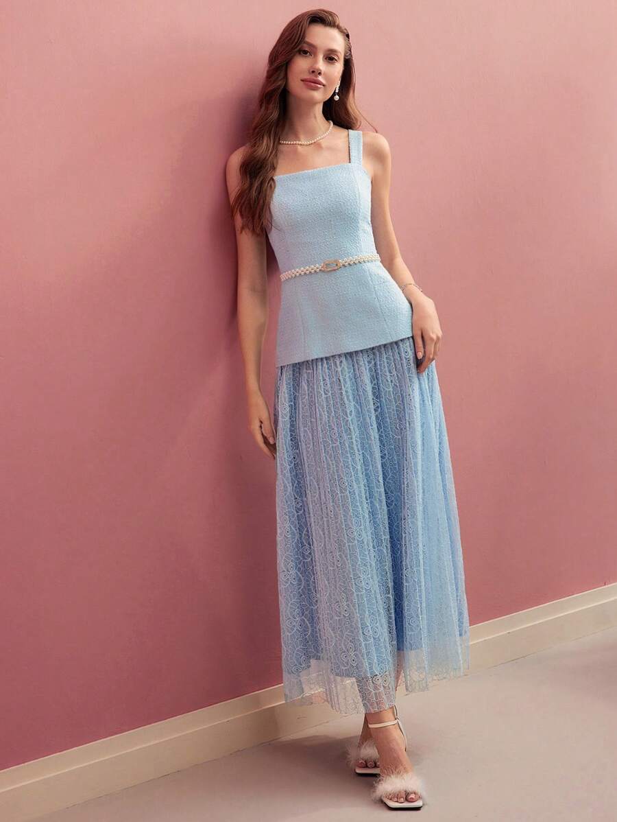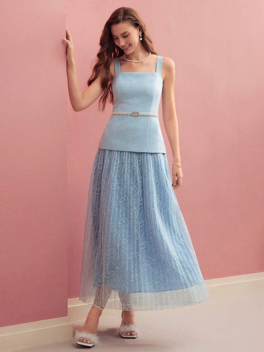 MIU PREMIUM TWEED CONTRAST LACE TANK DRESS, PLEATED MIDI DRESS,SPRING/SUMMER