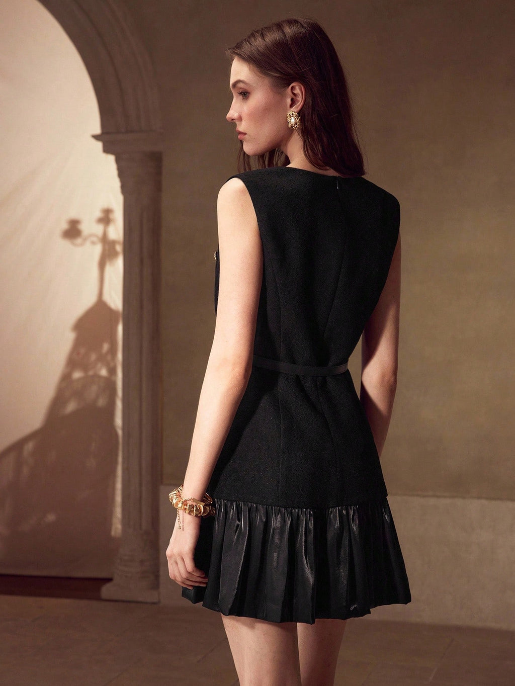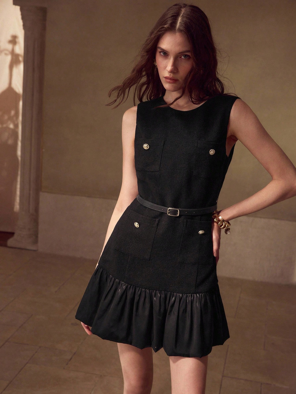 MIU PREMIUM TWEED GOLD BUTTON DETAIL PATCH POCKET RUFFLE HEM BUCKLE BELTED SLEEVELESS SHORT DRESS