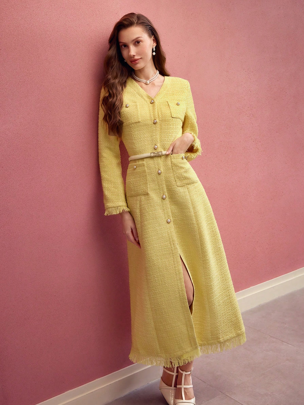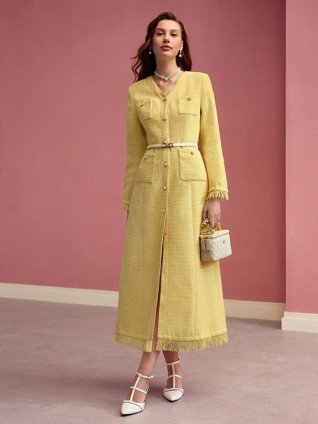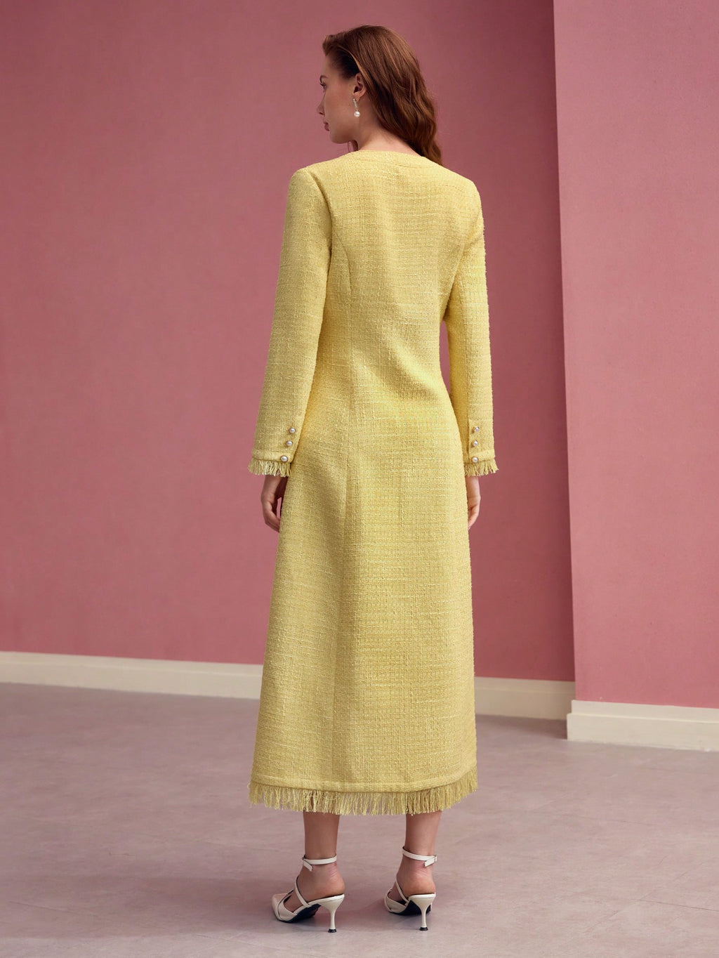 MIU PREMIUM TWEED RAW TRIM BUTTON UP DRESS, LONG SLEEVES, LONG DRESS