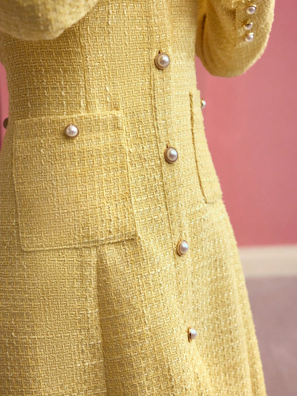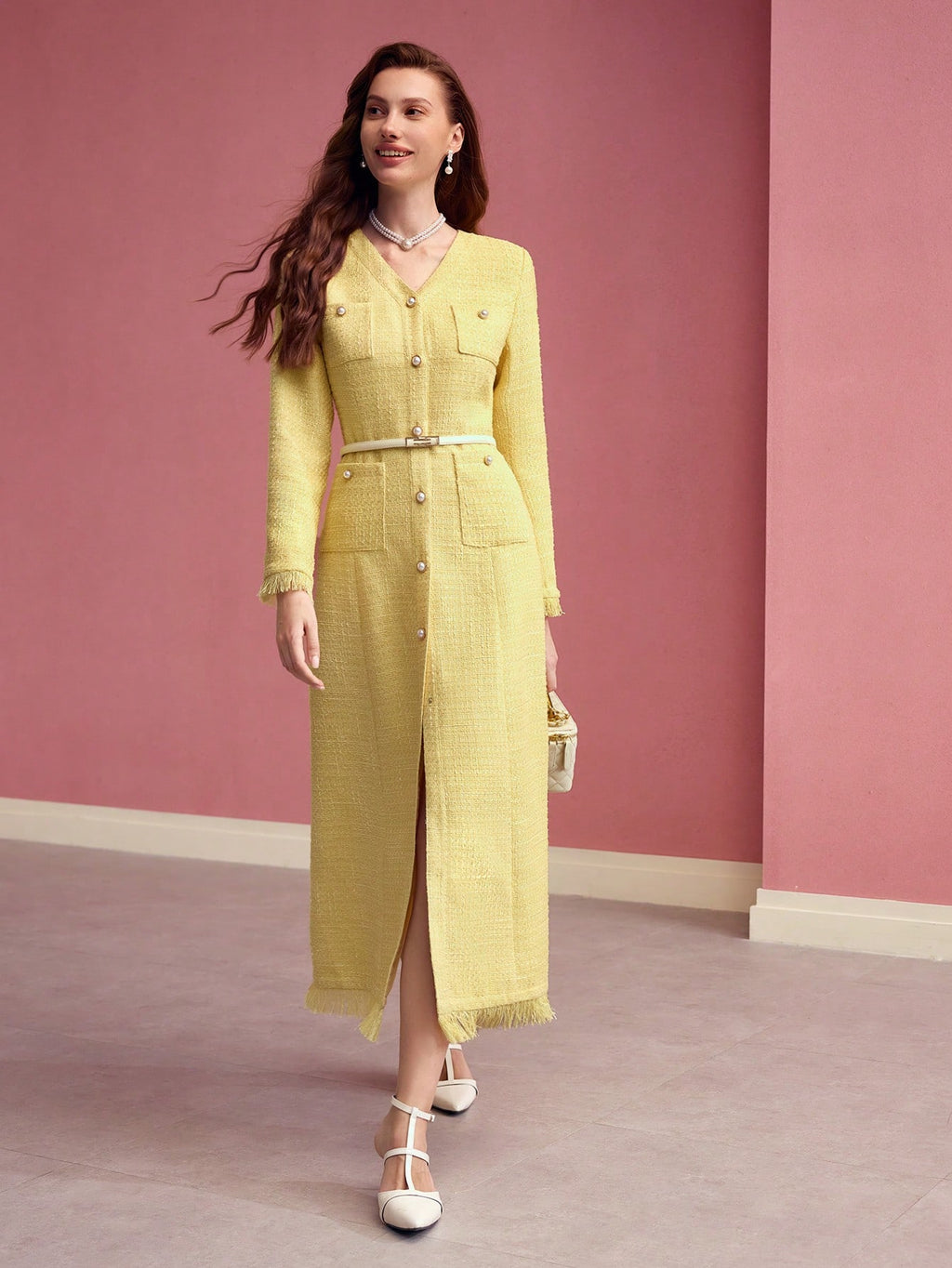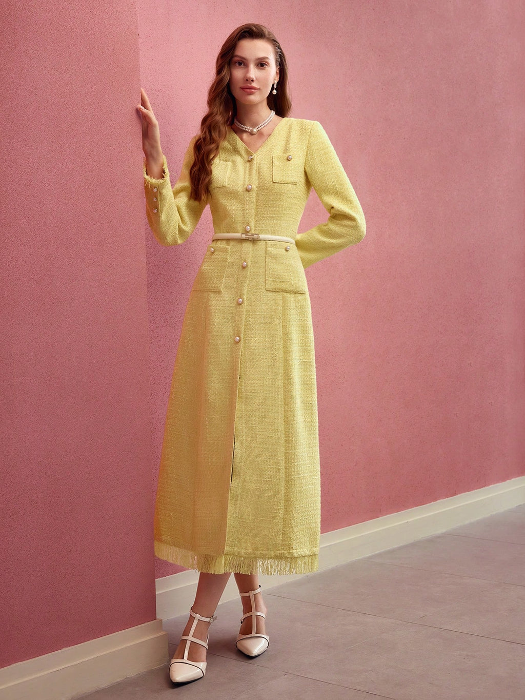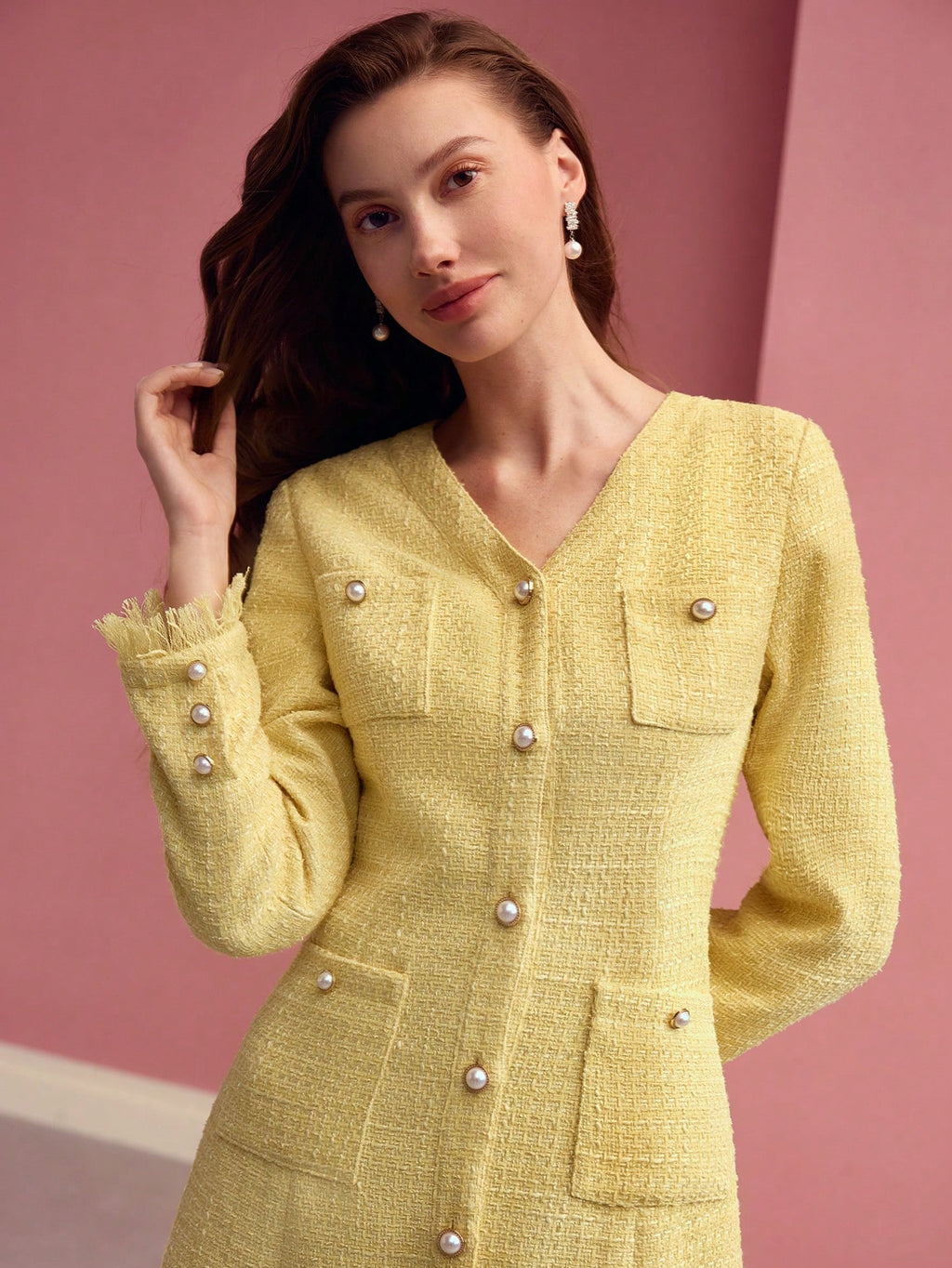 MIU PREMIUM TWEED RAW TRIM BUTTON UP DRESS, LONG SLEEVES, LONG DRESS