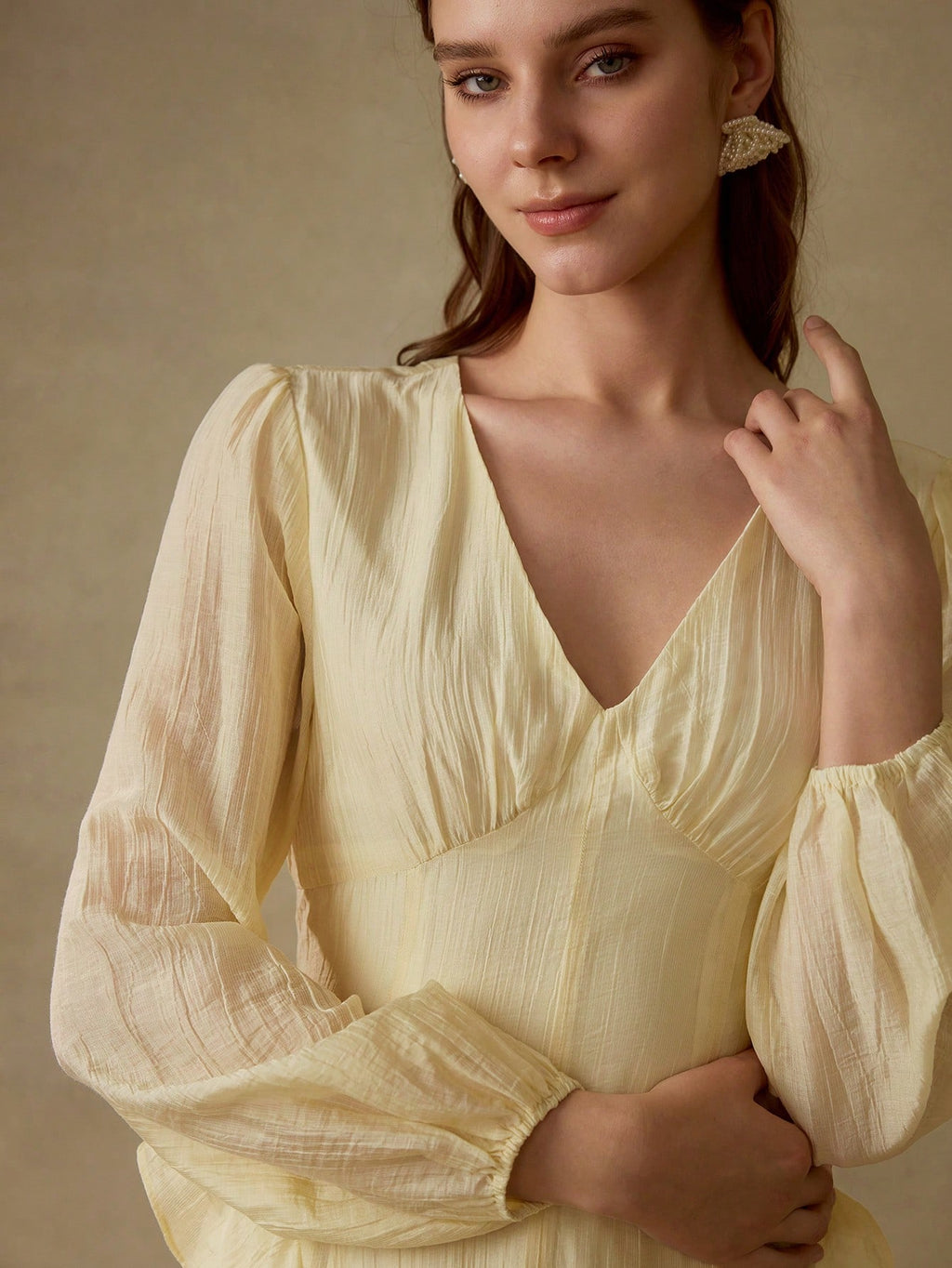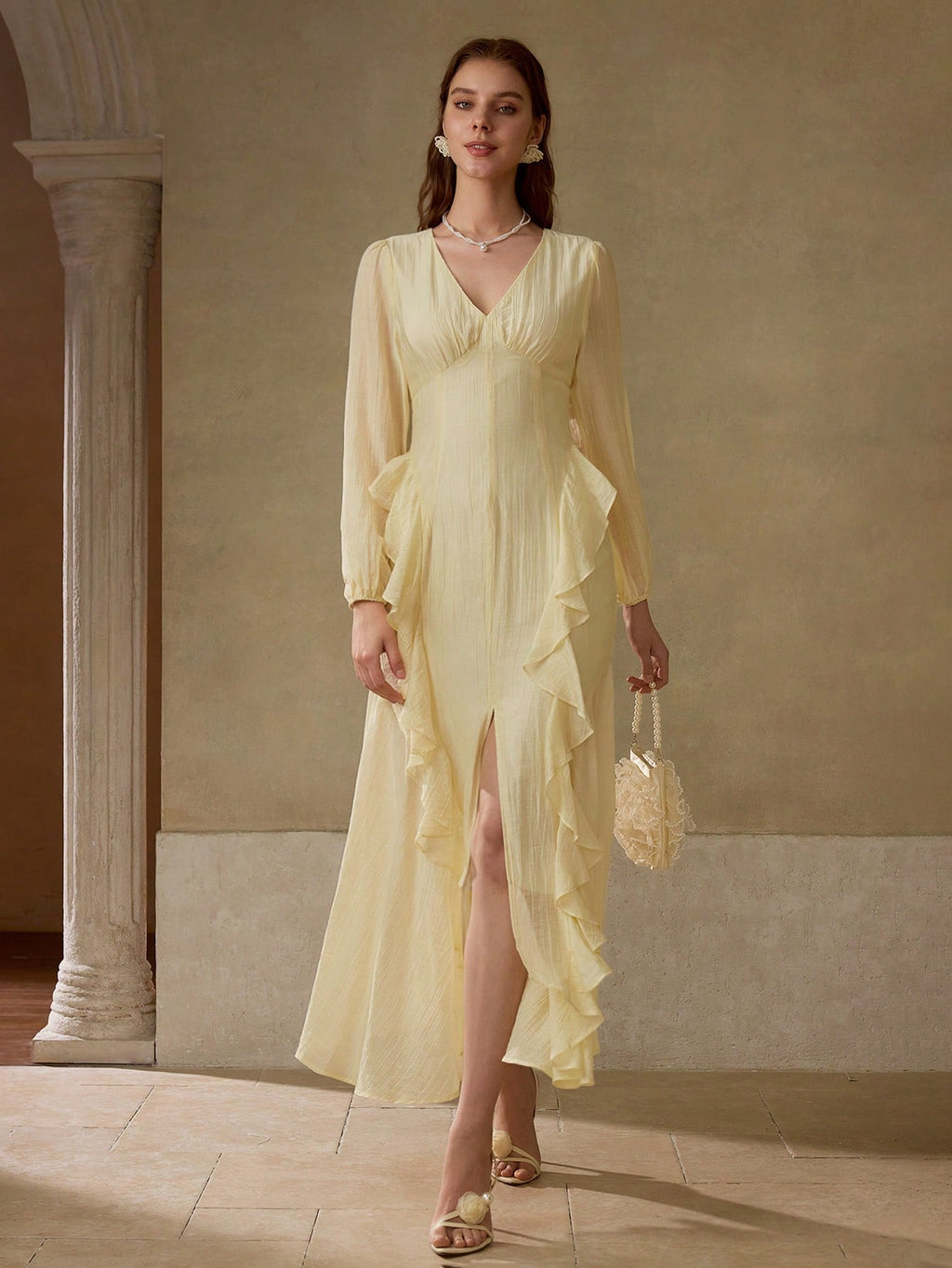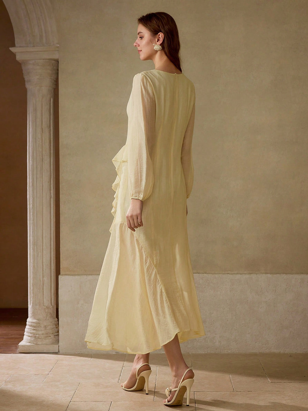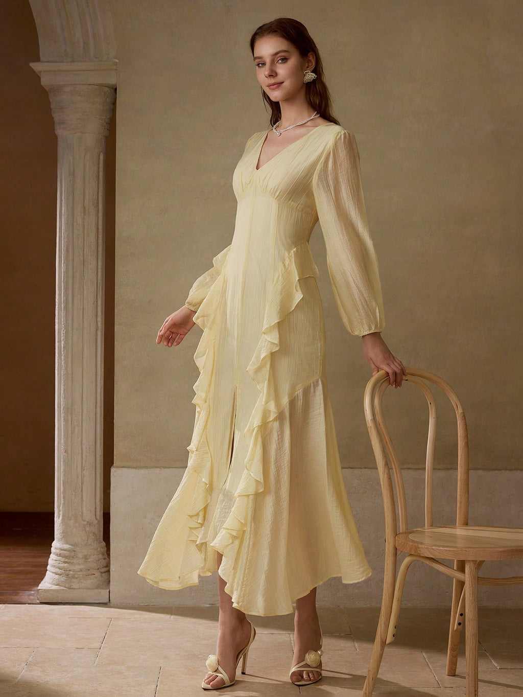 MIU PREMIUM V-NECK LONG SLEEVE WAIST CINCHED RUFFLED ASYMMETRIC HEM DRESS, MINIMALIST