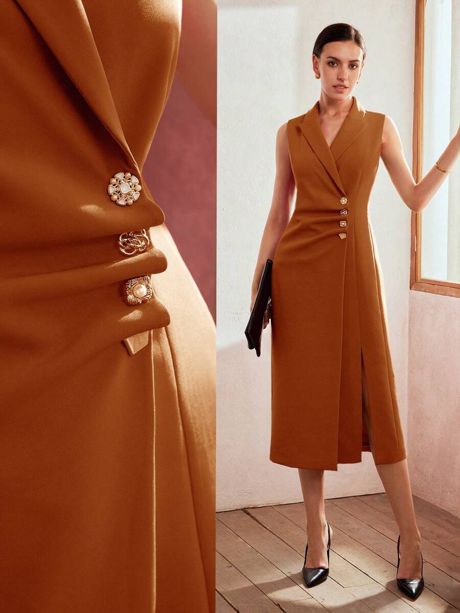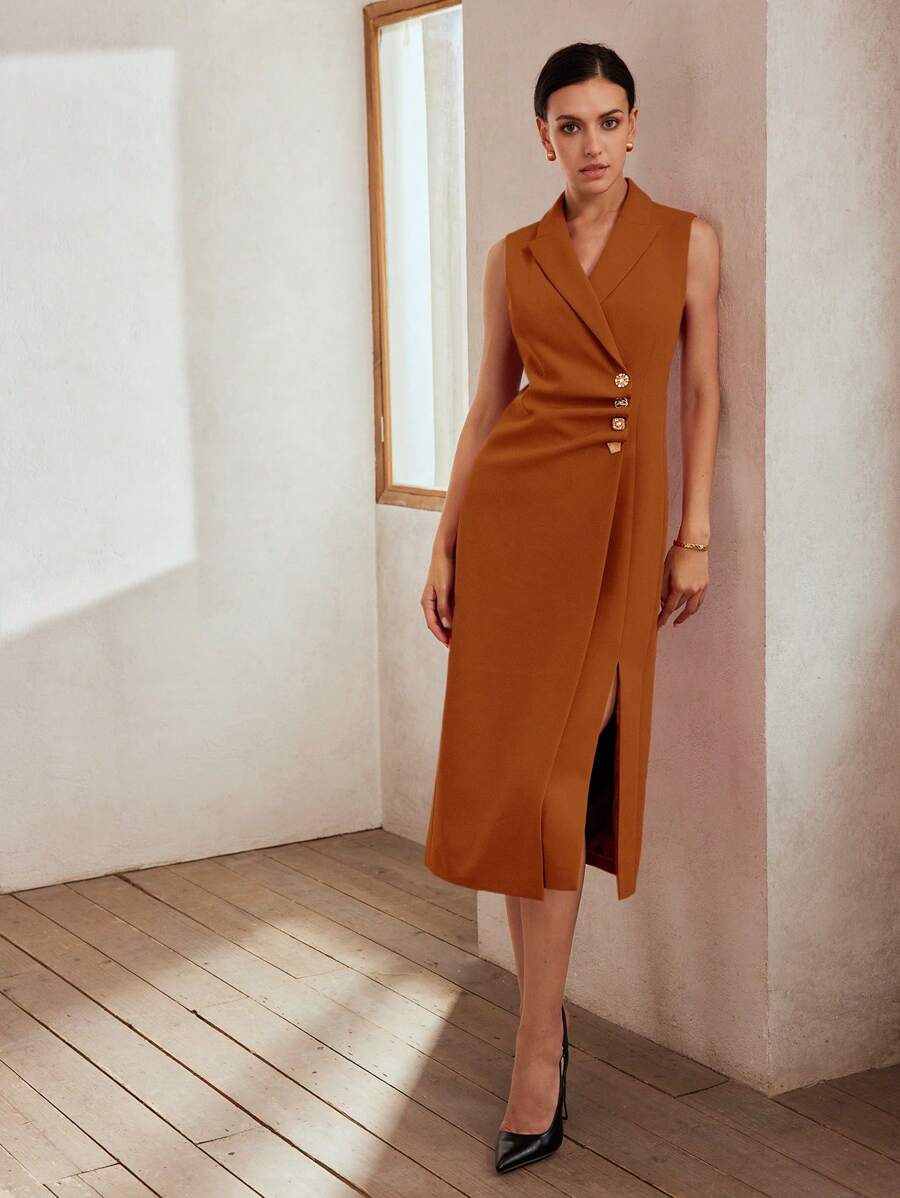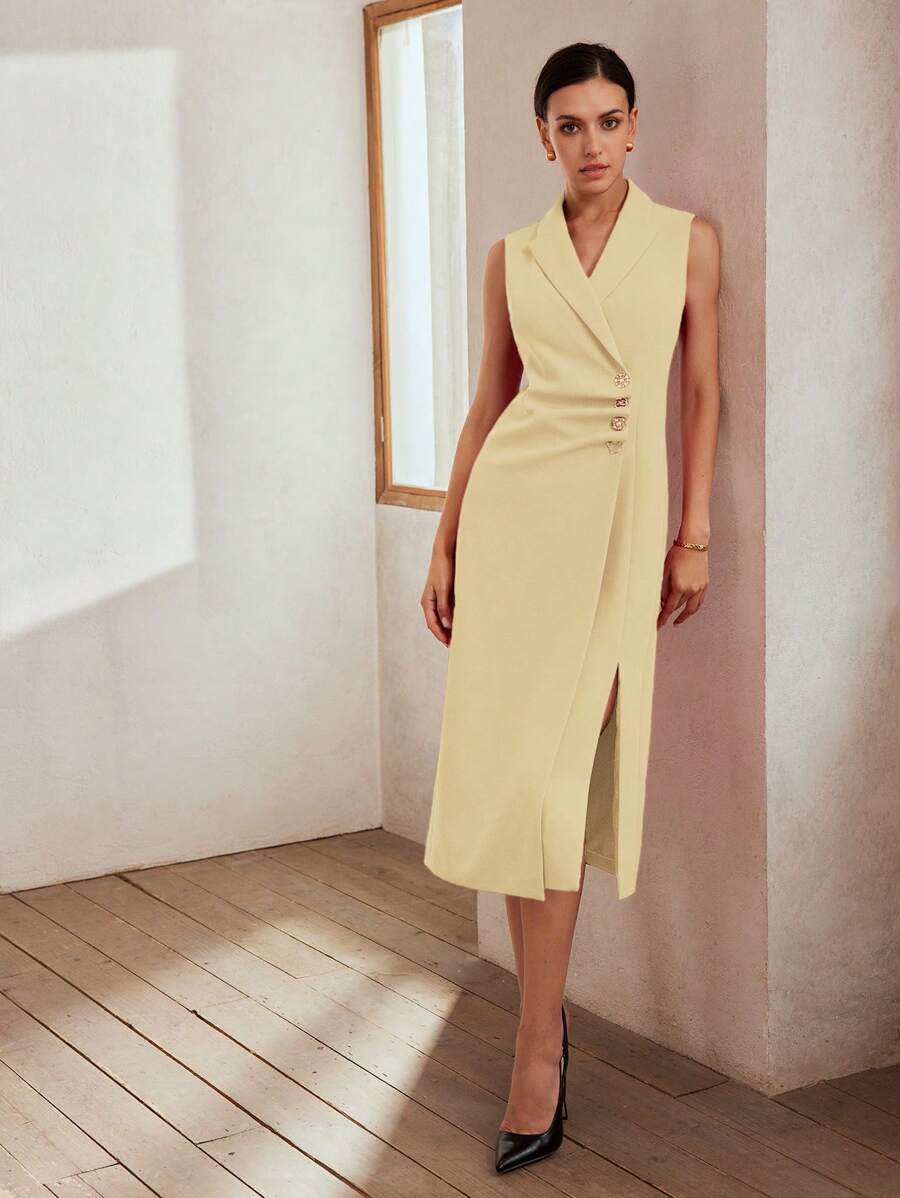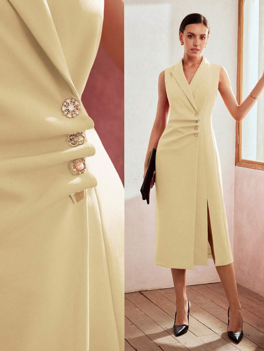 MIU PREMIUM WOMEN SLEEVELESS METAL-BUTTON COLLAR WOVEN DRESS