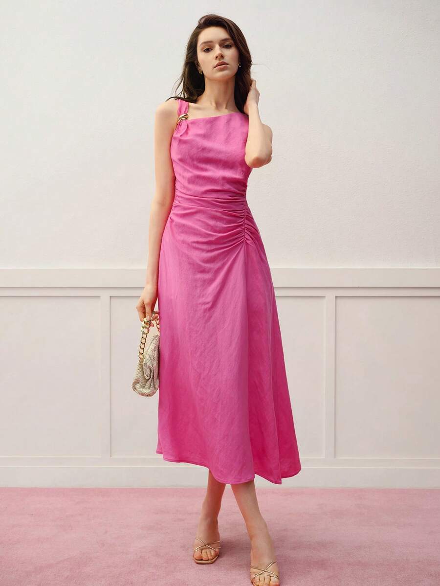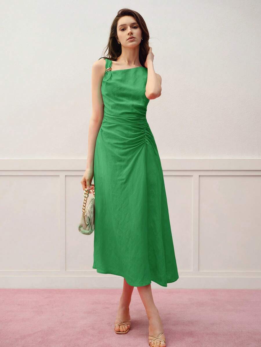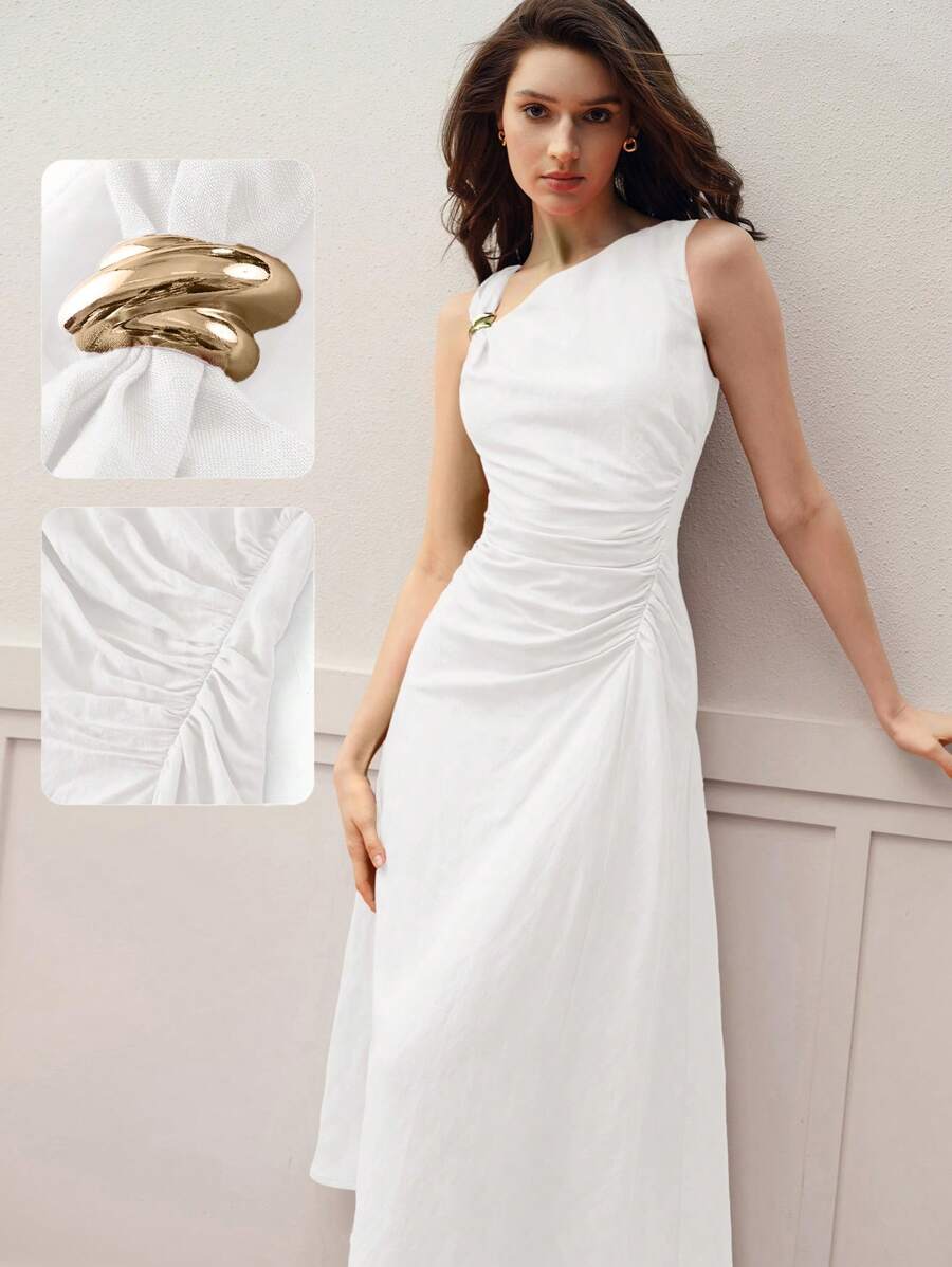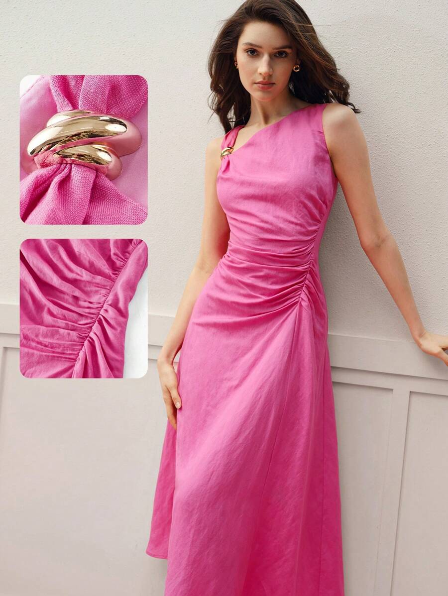 MIU PREMIUM WOMEN'S LINEN BLEND ASYMMETRICAL SHOULDER RUCHED WAIST DRESS