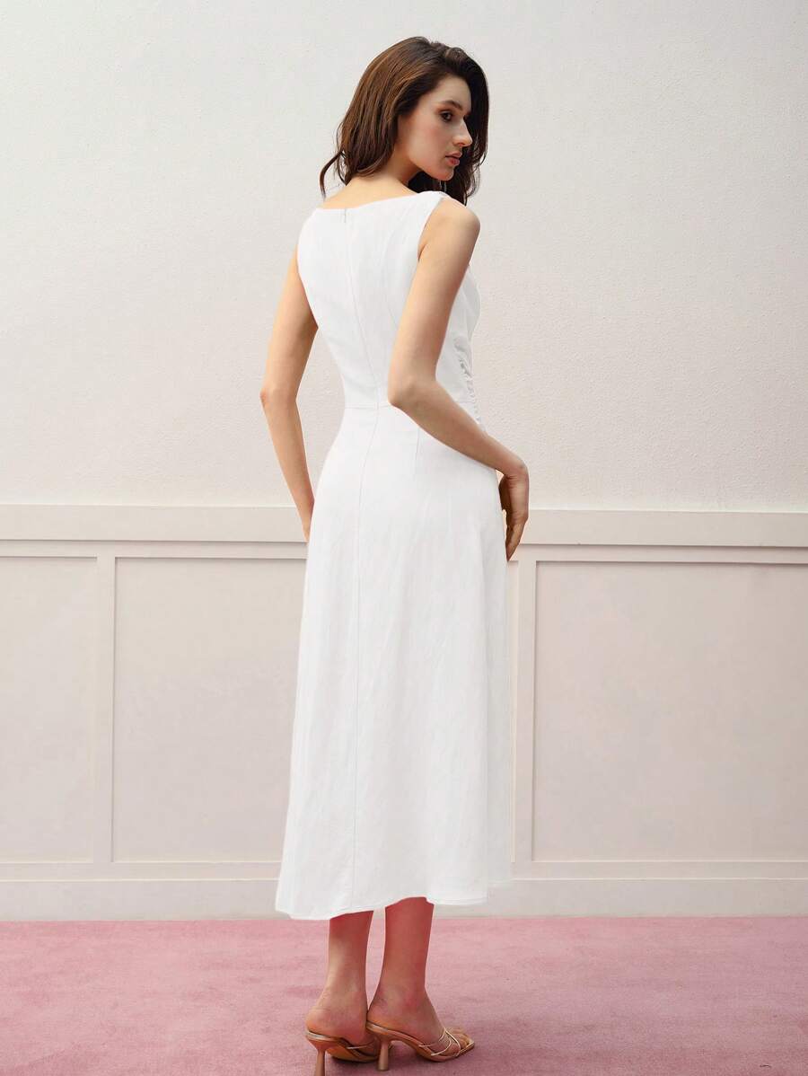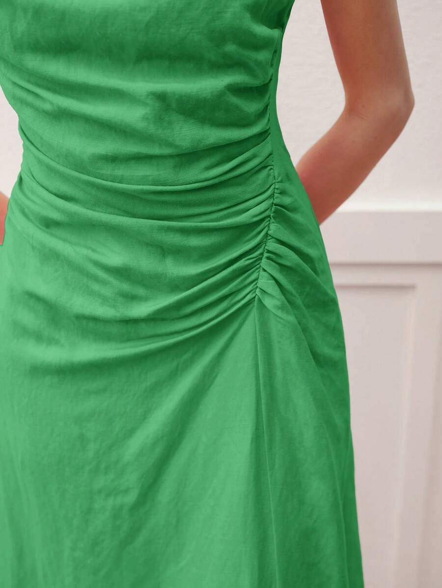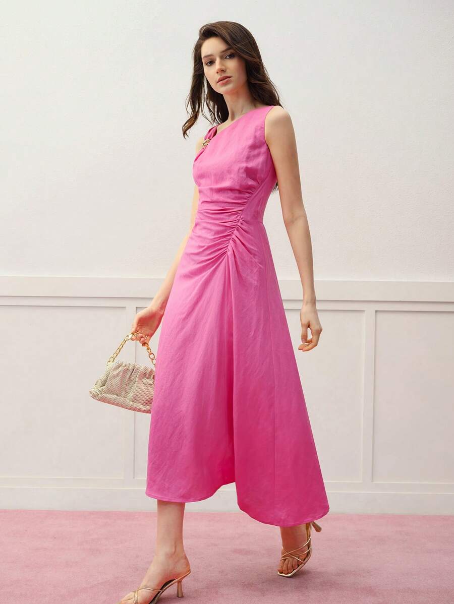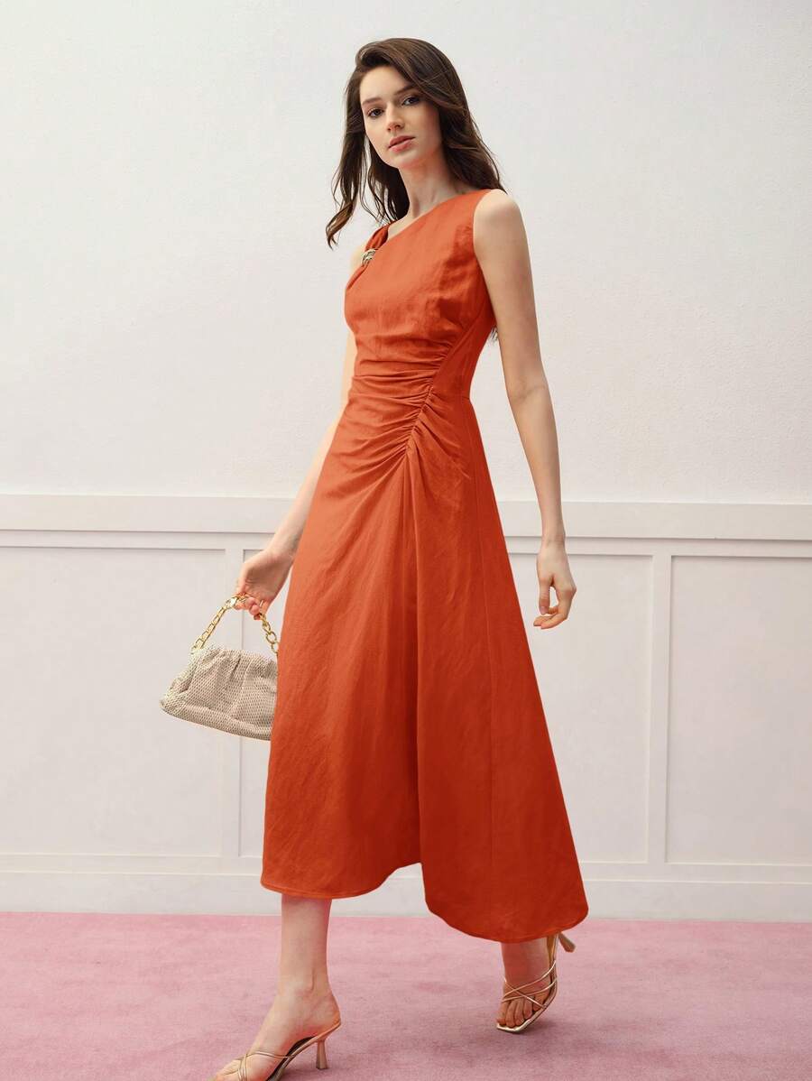 MIU PREMIUM WOMEN'S LINEN BLEND ASYMMETRICAL SHOULDER RUCHED WAIST DRESS