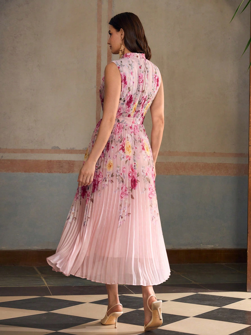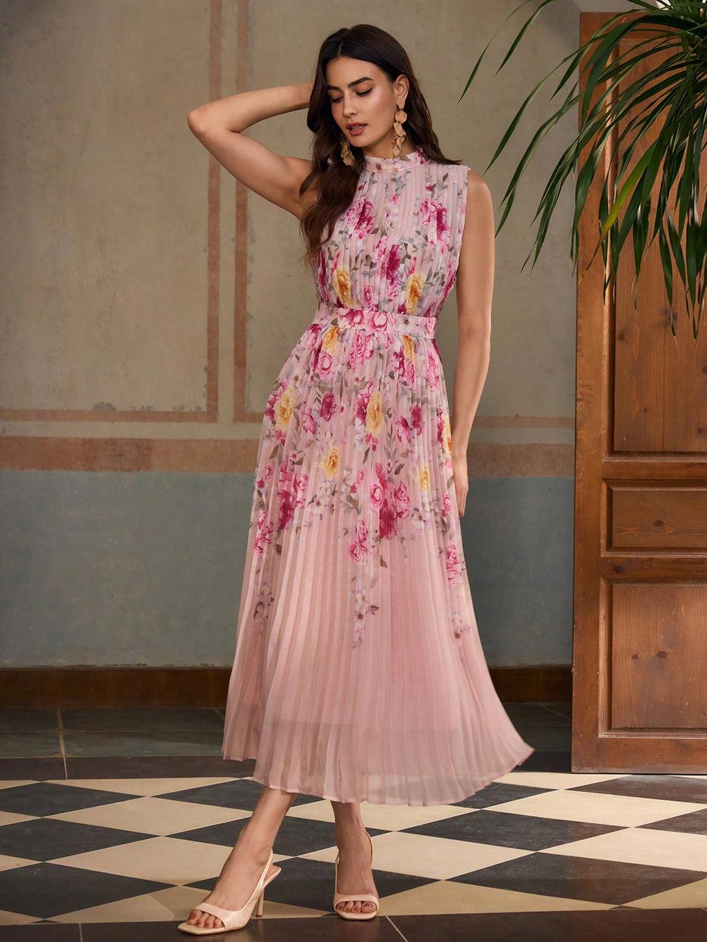 MIU Printed Neckline Tie Long Dress, Sleeveless, With Vacation Vibe, Spring/Summer