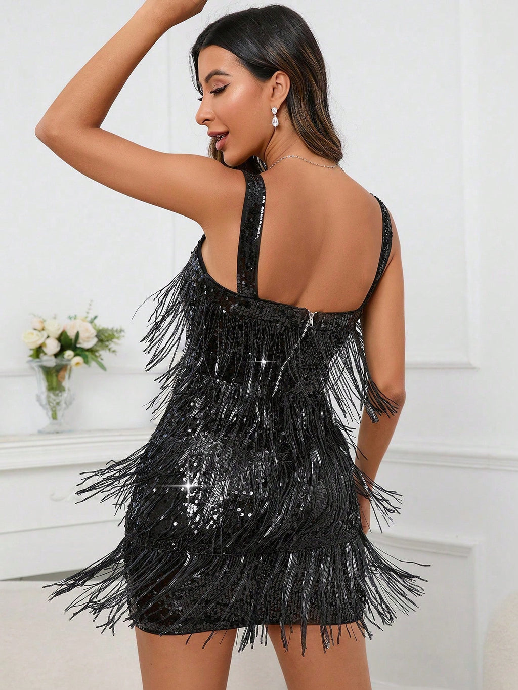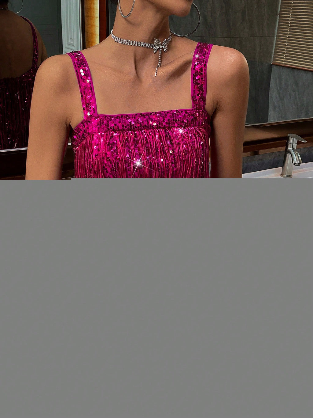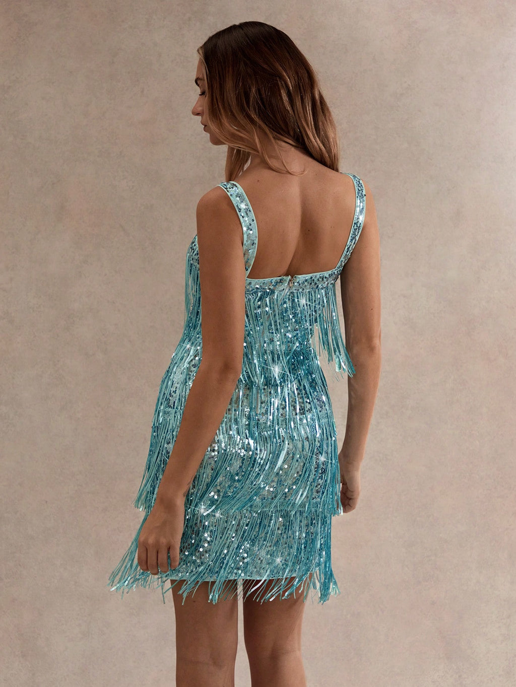 MIU Rave Summer Dress Fashion Sequin Backless Dress Suspender Tassel Short Women Dresses Green Dress For Holiday Party Clothes