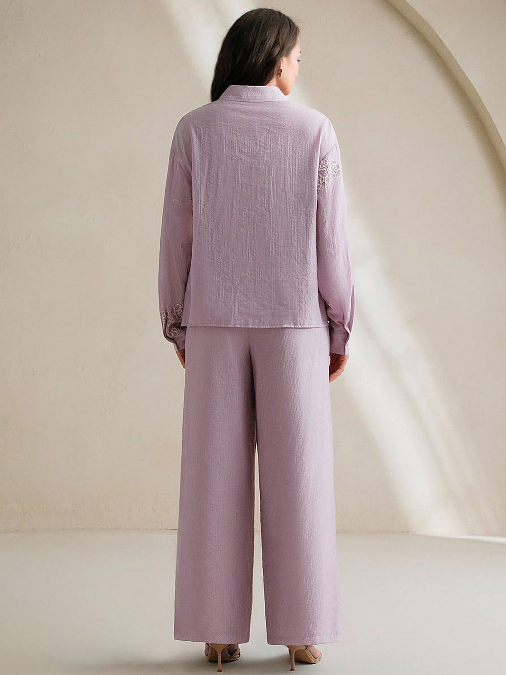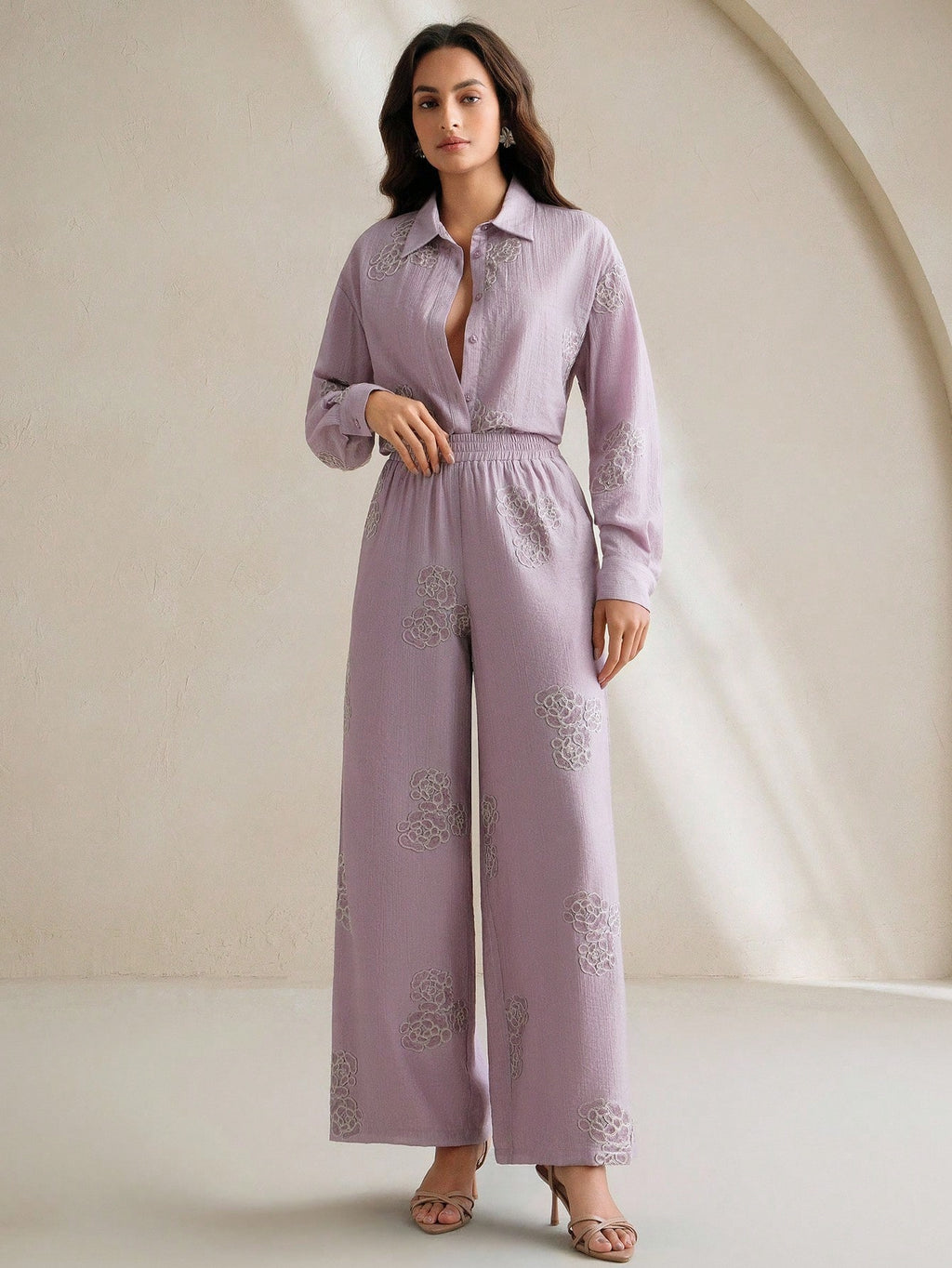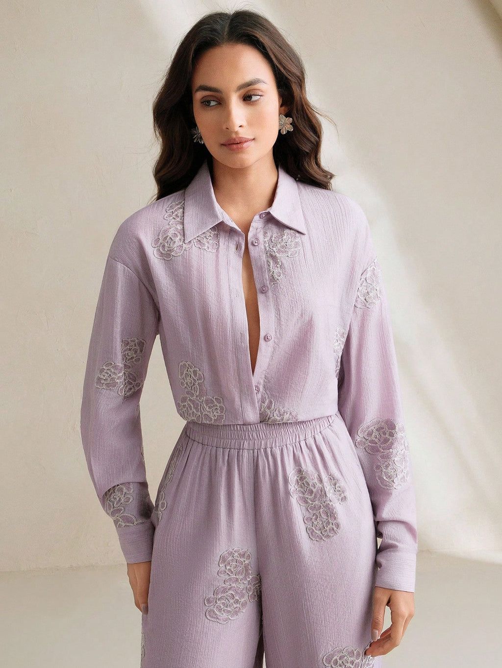 MIU Solid Color 3D Embroidered Floral Collar Drop Shoulder Long Sleeve Shirt And Shorts Set