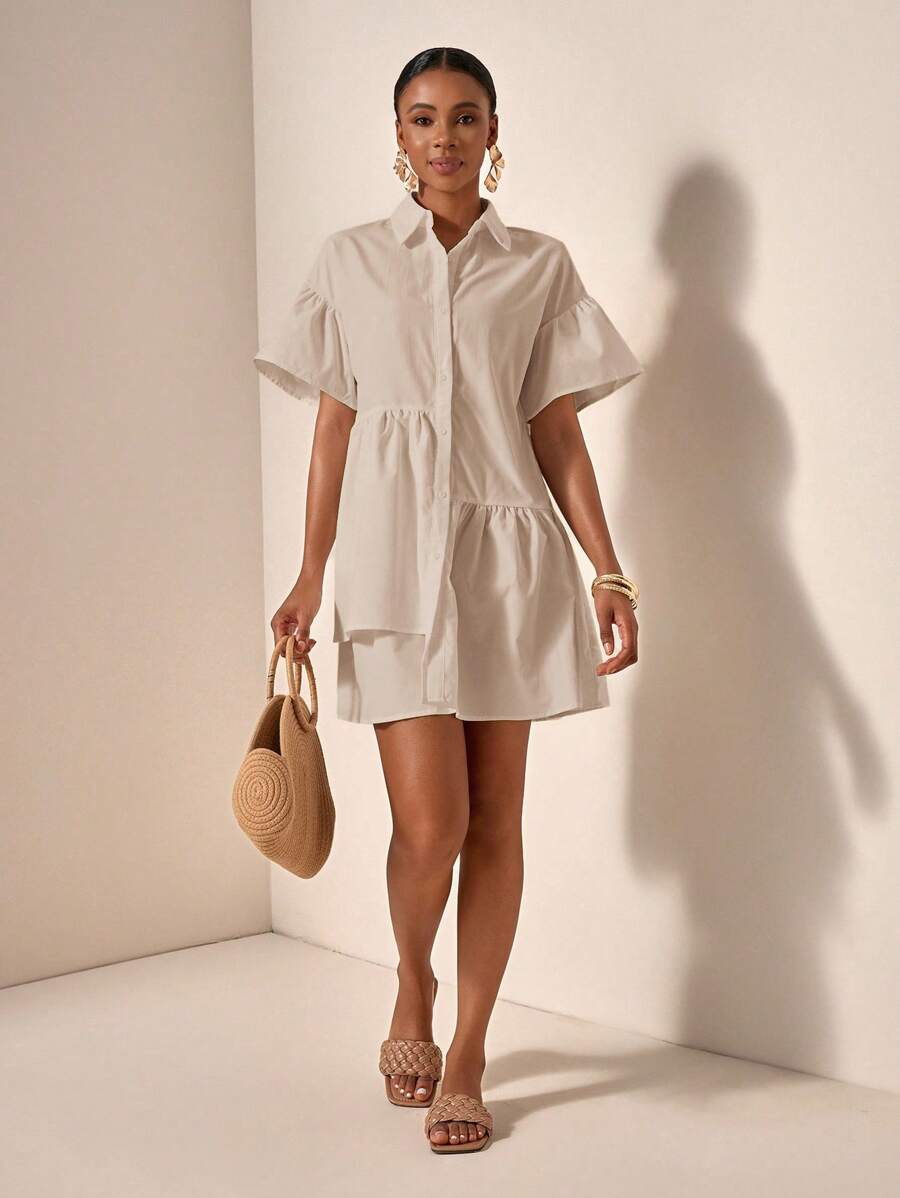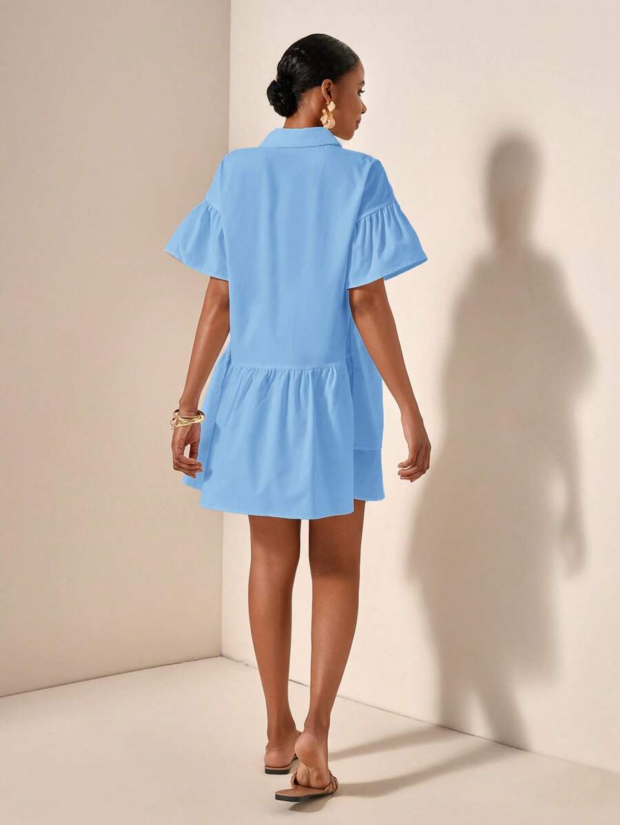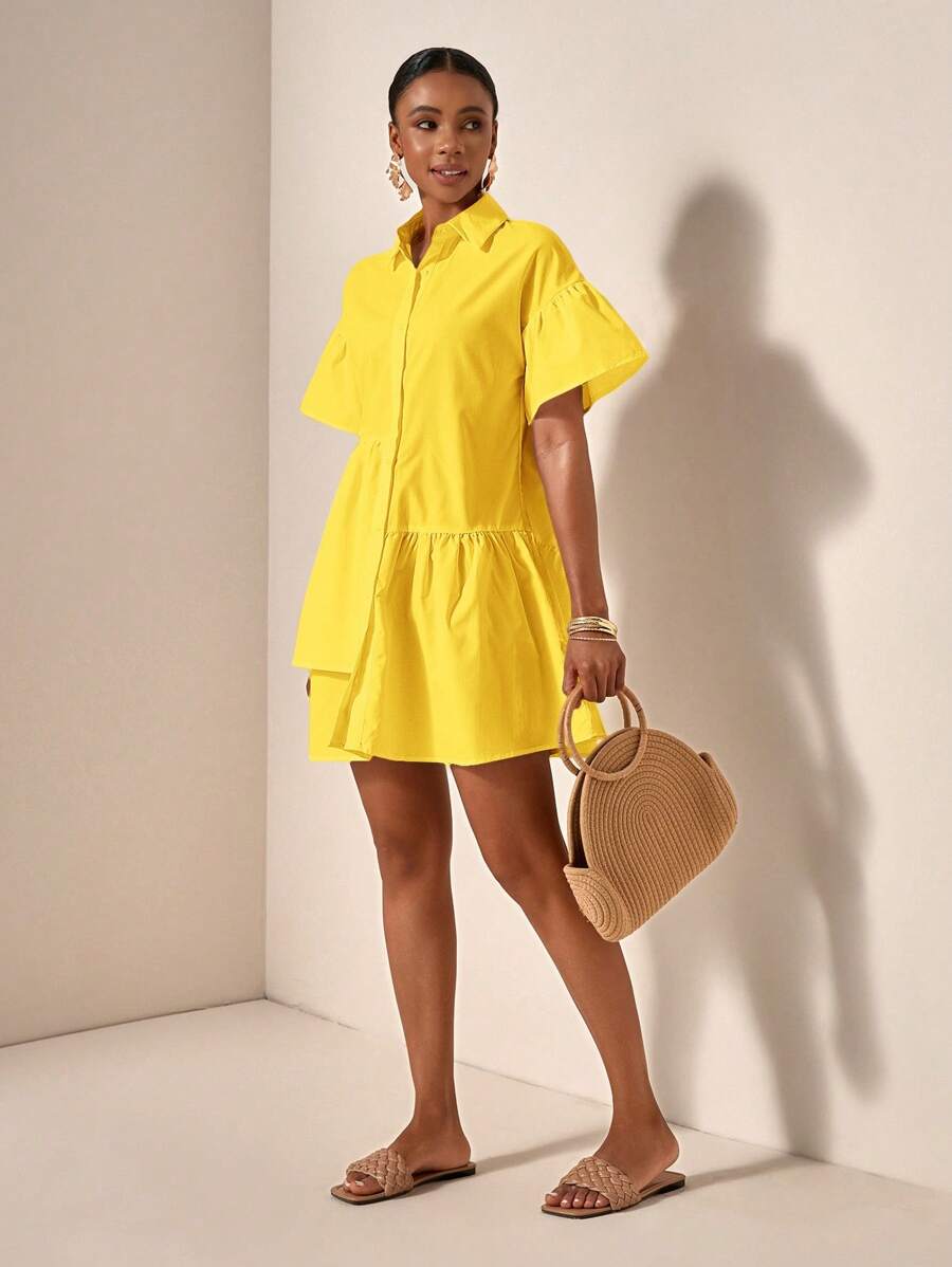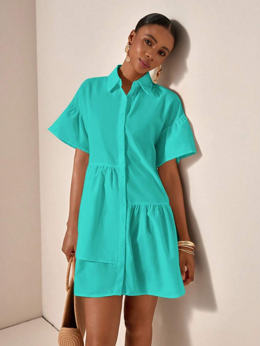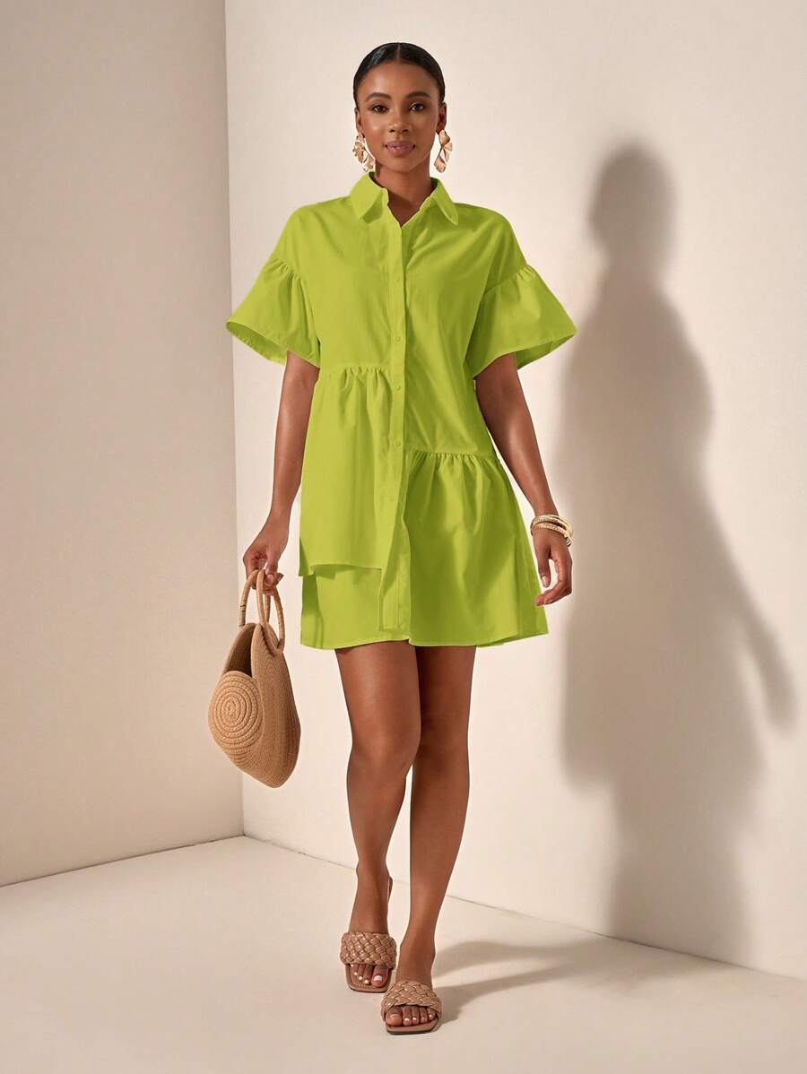 MIU Solid Color Front Button Ruffle Hem Short Sleeve Vacation Dress, Summer