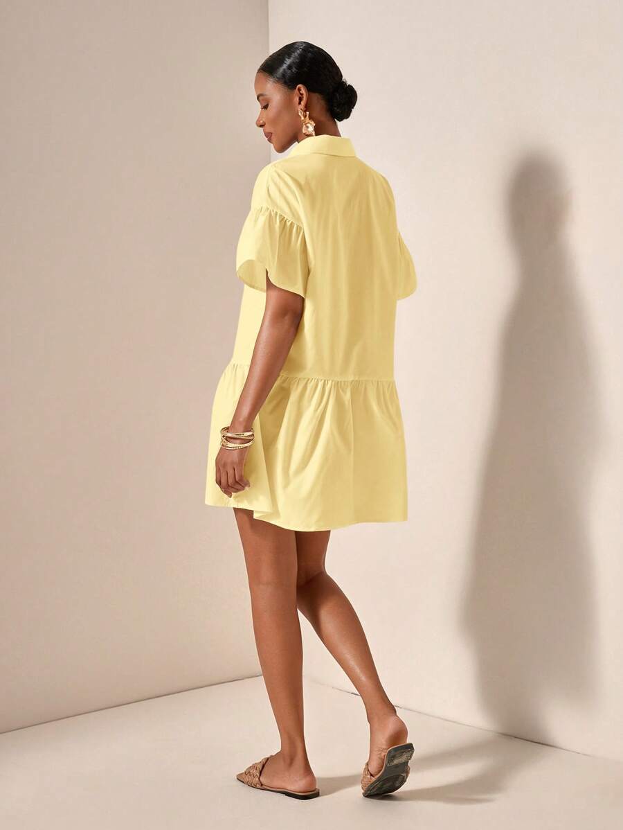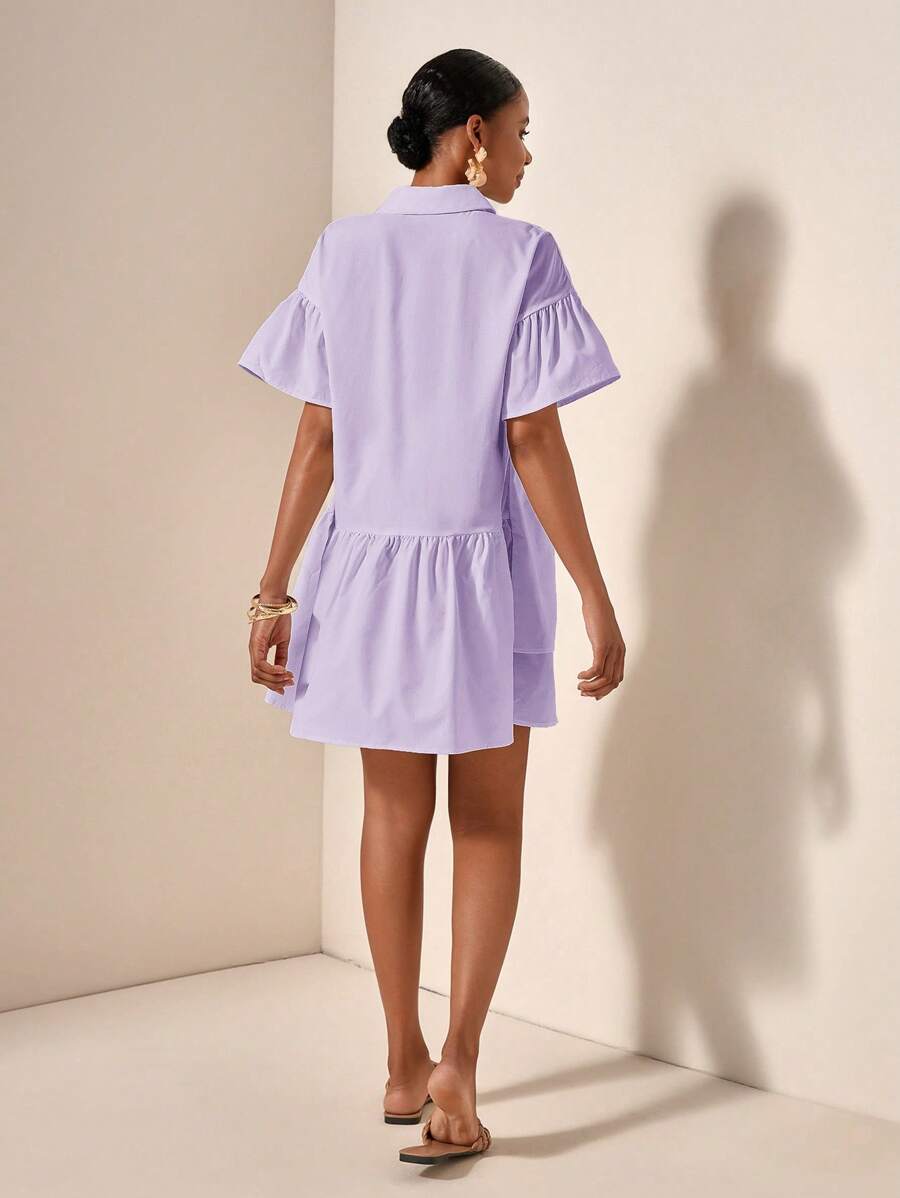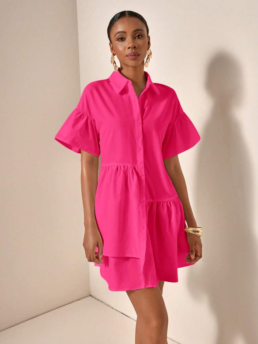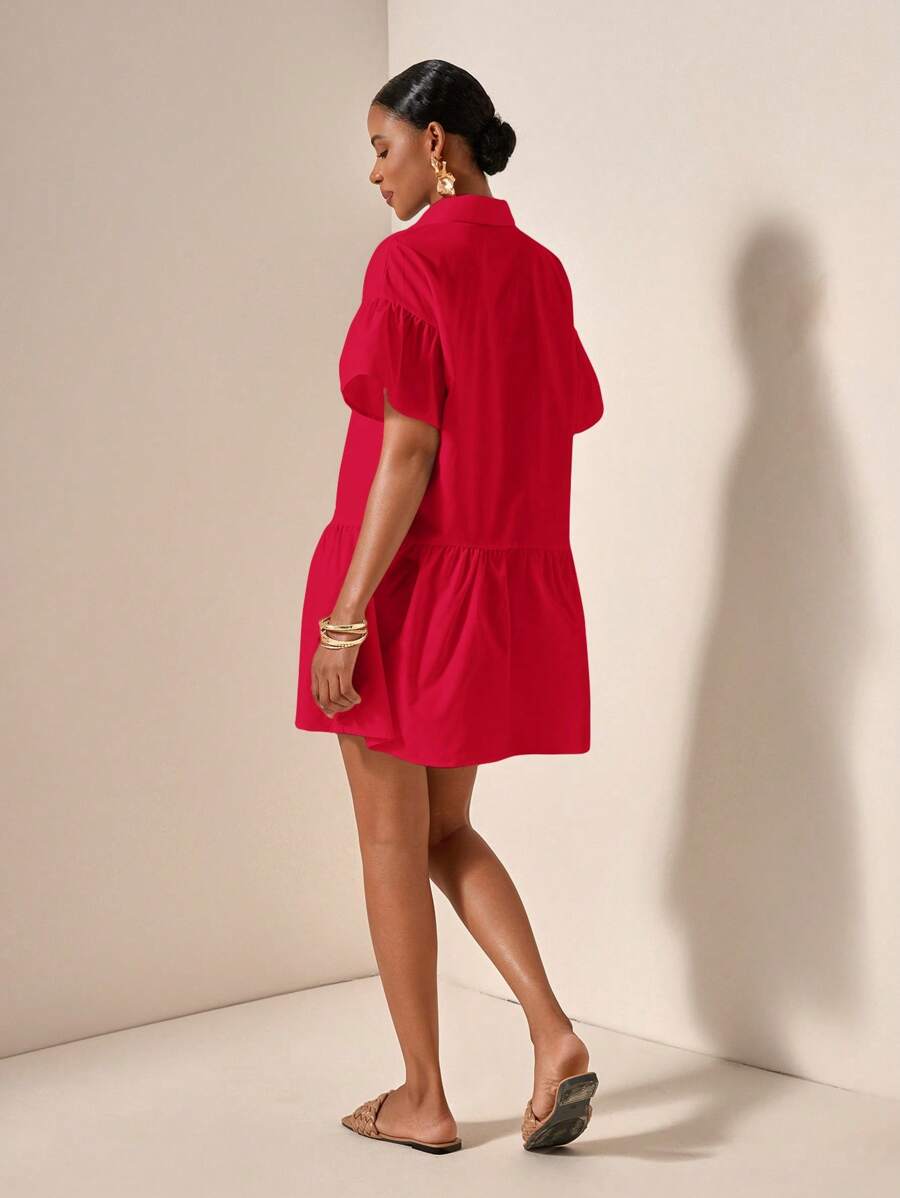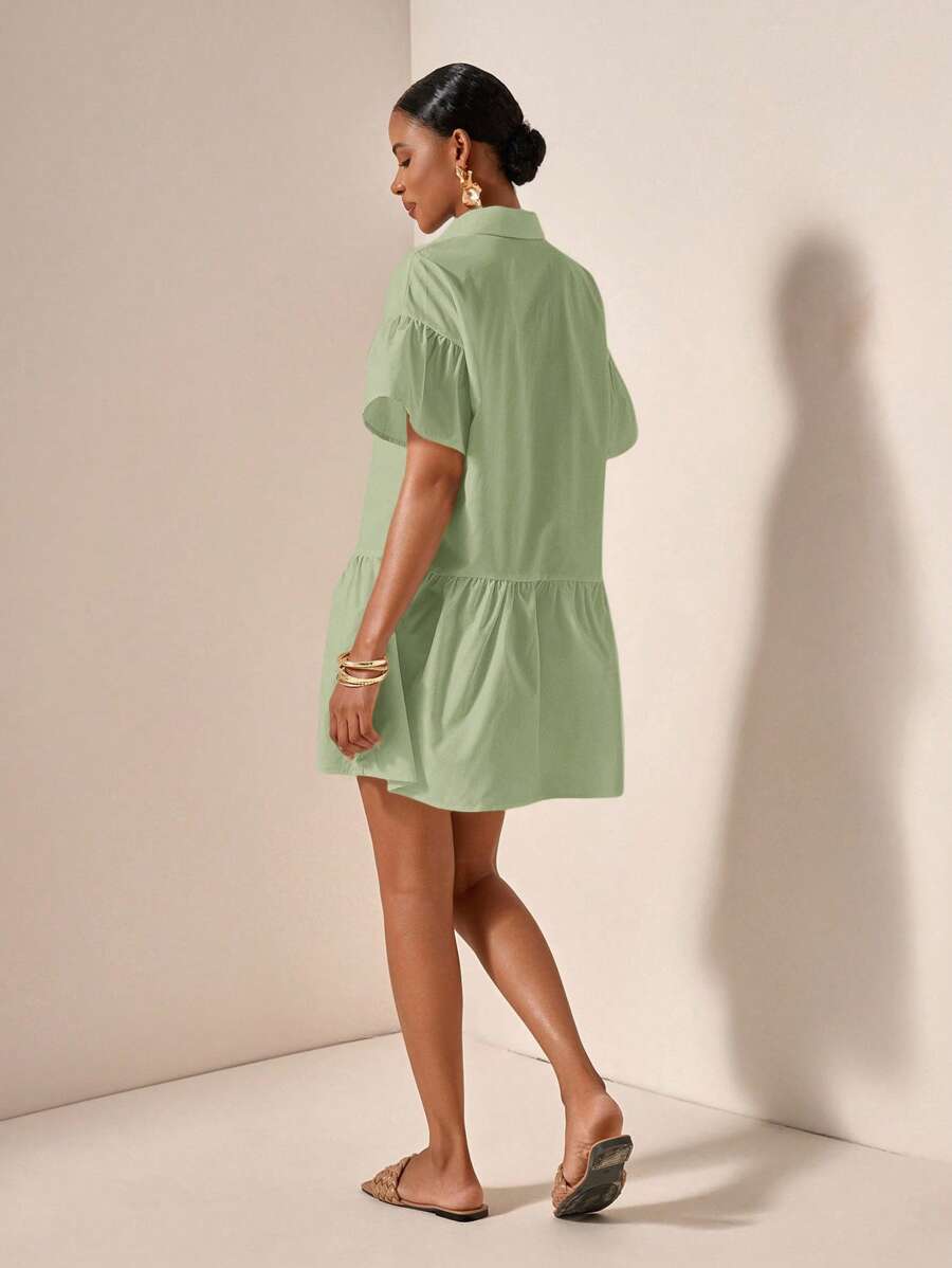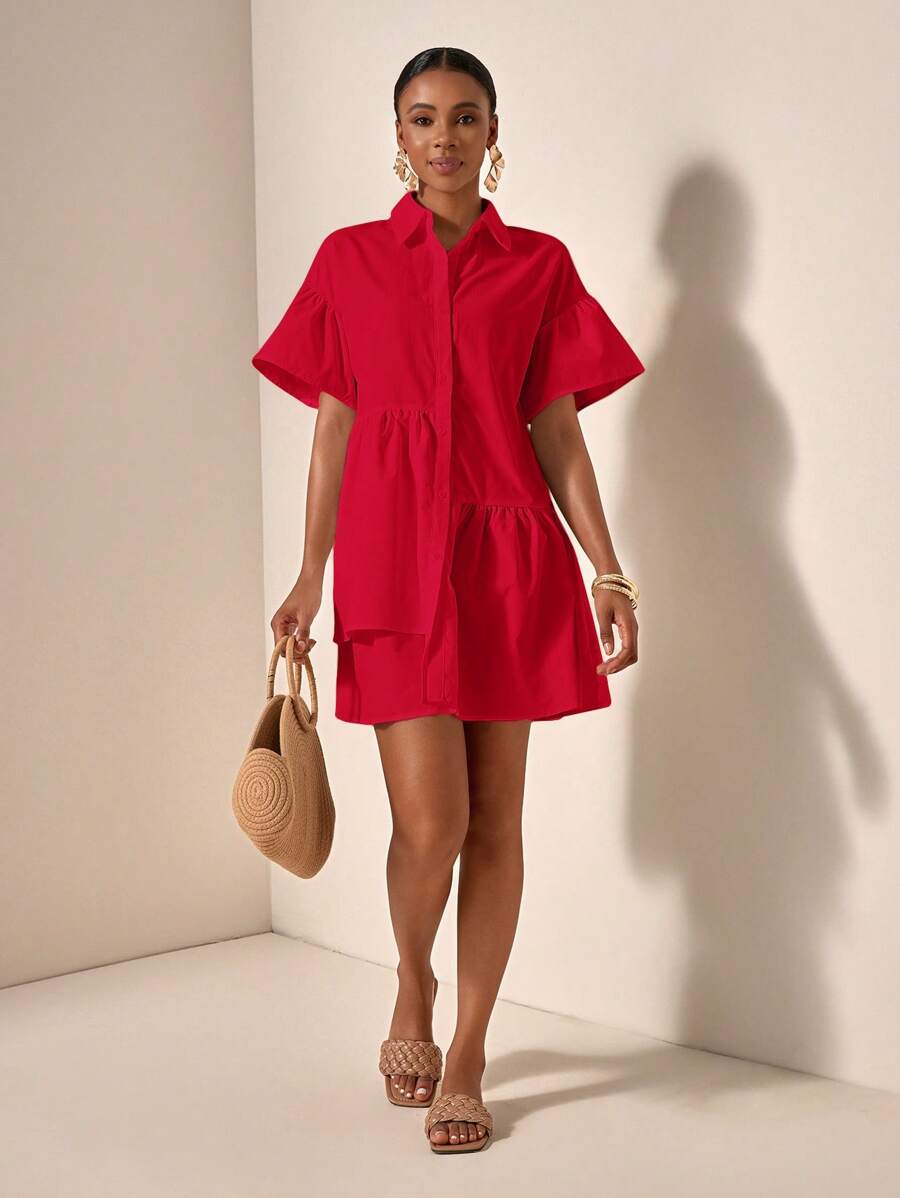 MIU Solid Color Front Button Ruffle Hem Short Sleeve Vacation Dress, Summer