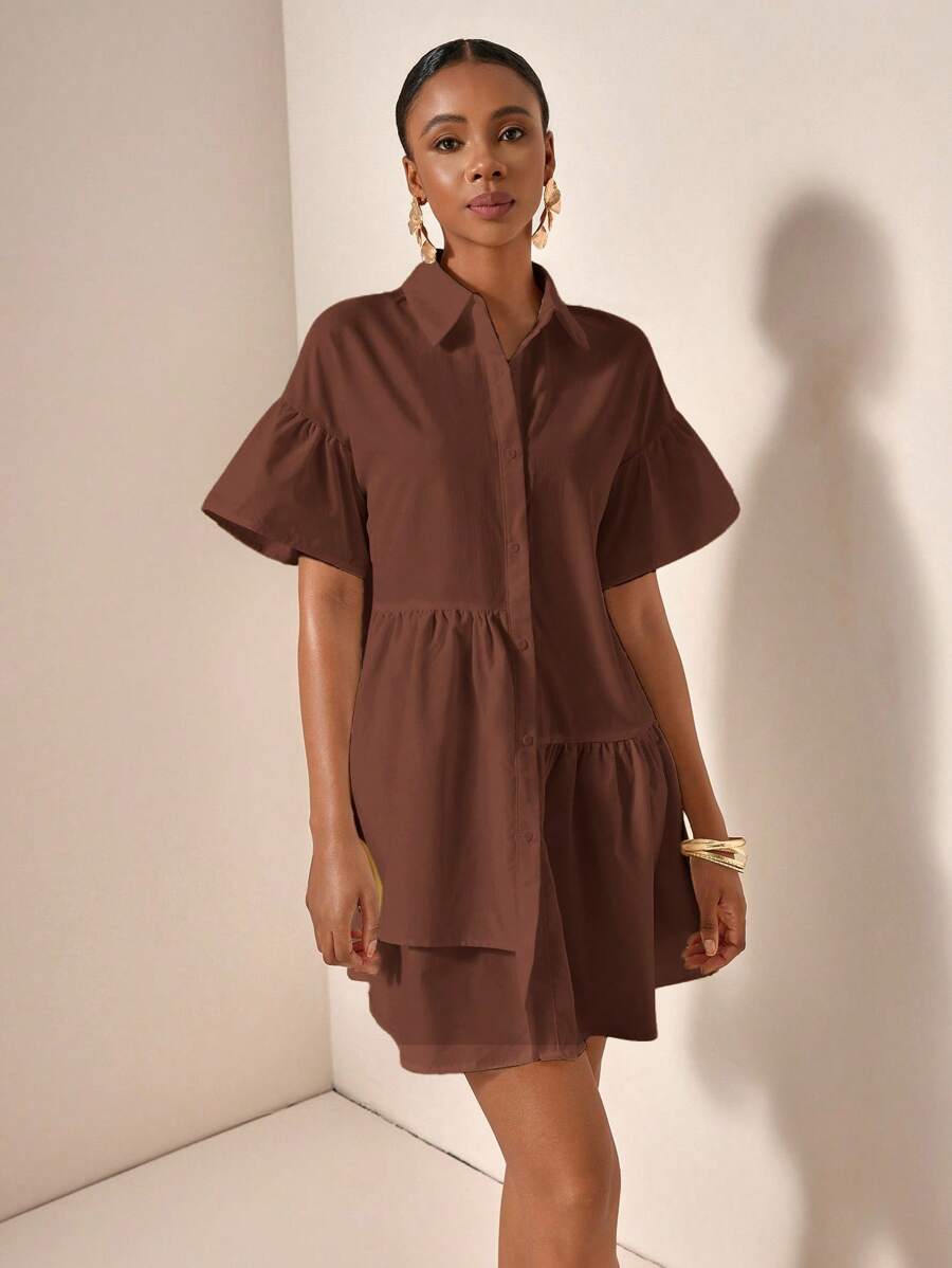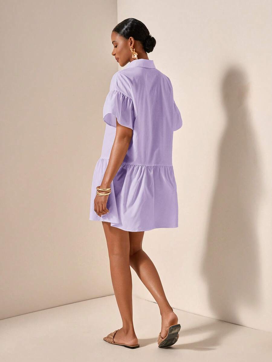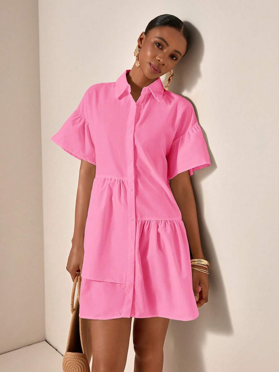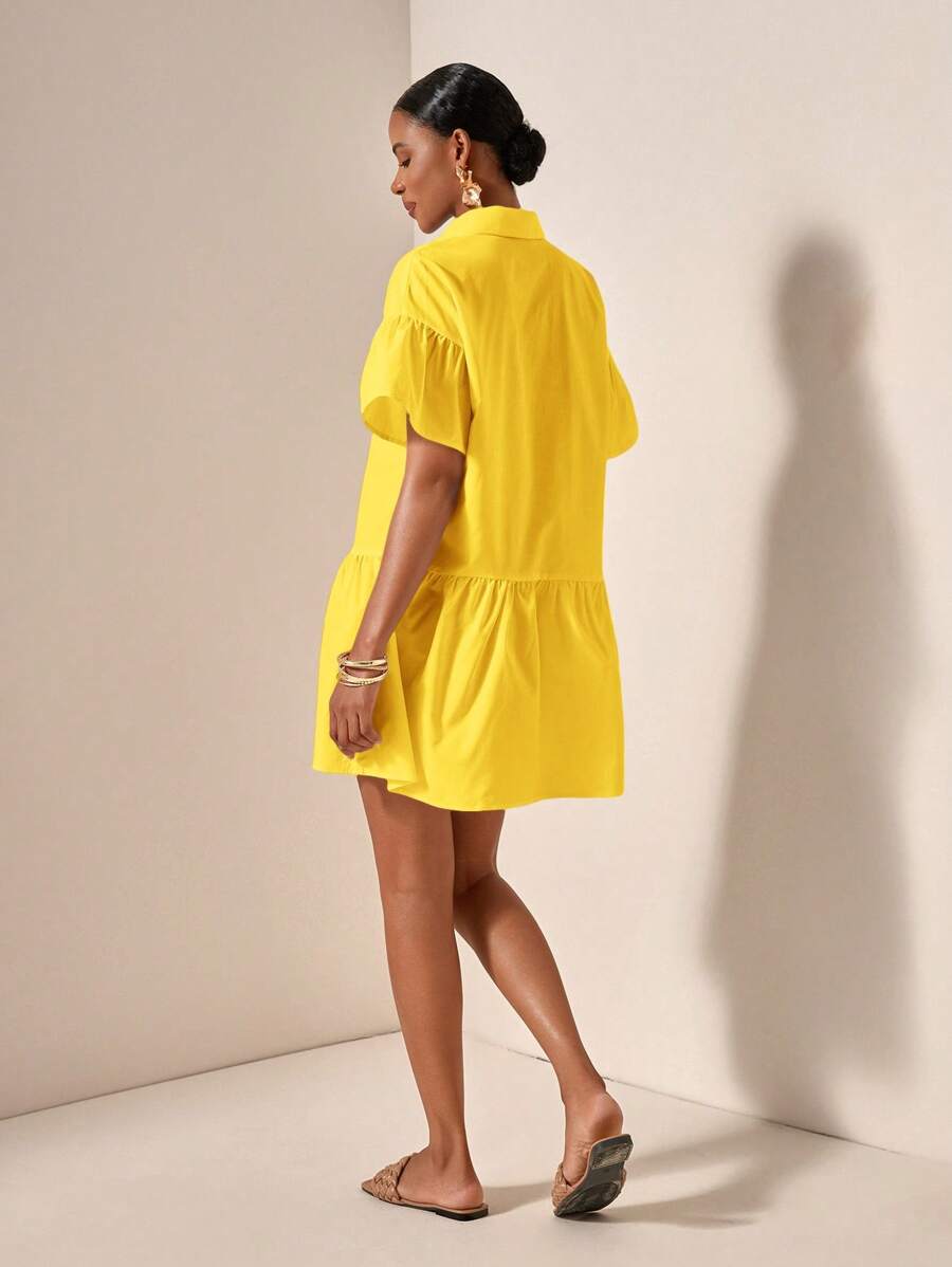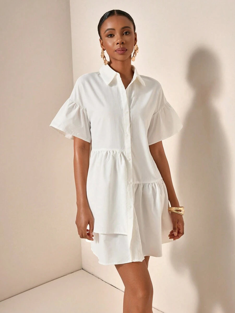 MIU Solid Color Front Button Ruffle Hem Short Sleeve Vacation Dress, Summer
